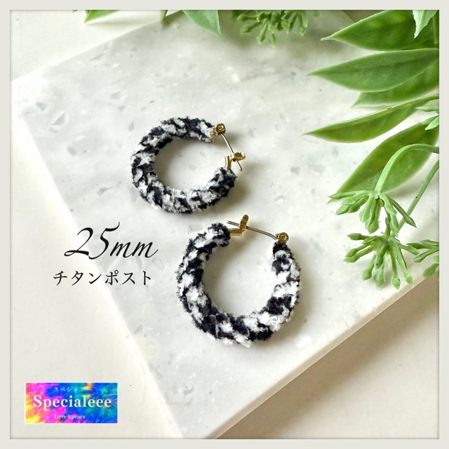 25mm★白黒ミックス編みフープピアス★チタンポスト★もこふわ秋冬素材感★ダルメシアン★千鳥柄ツイード★モノクロ★お洒落★可愛い★