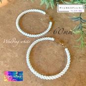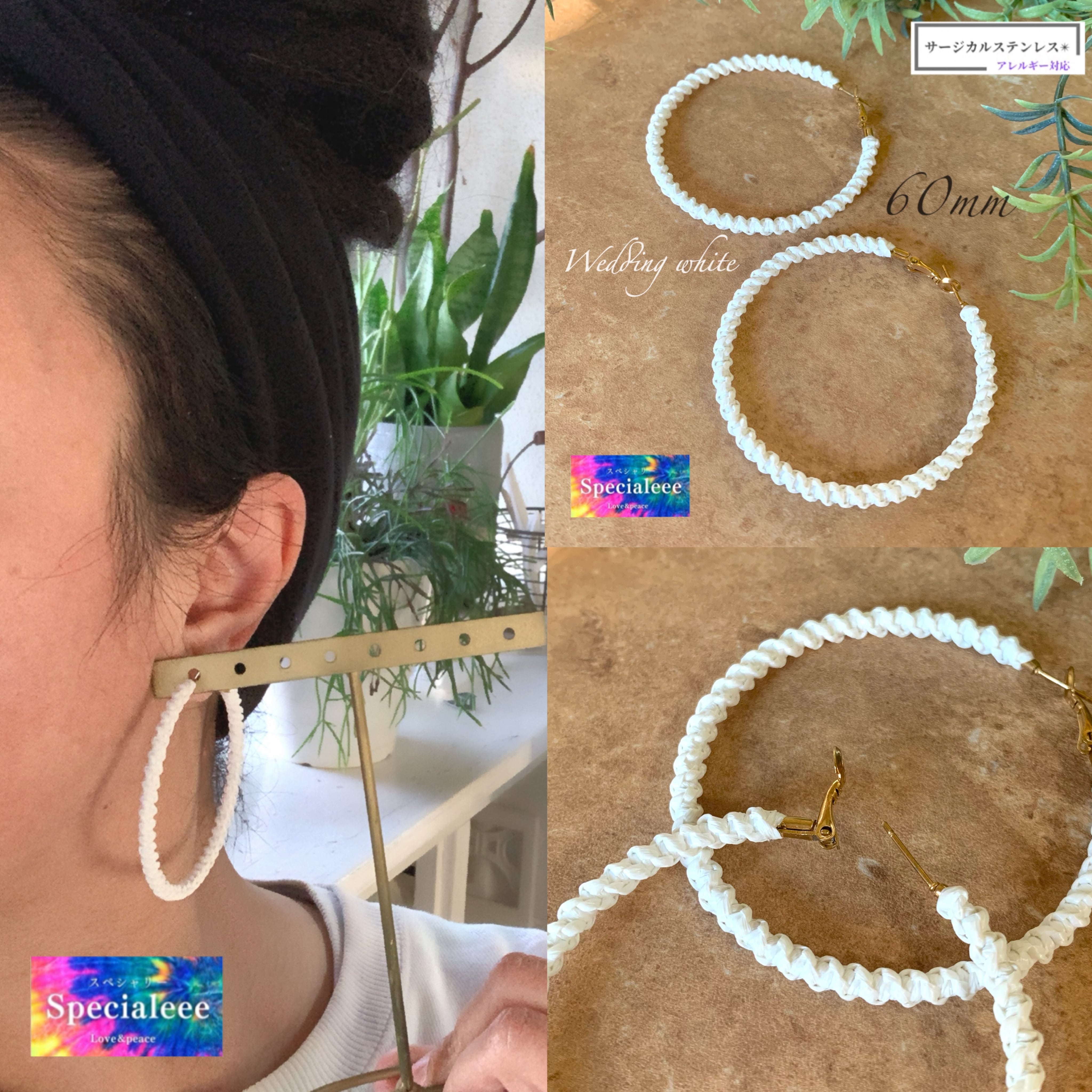 60mm☆真っ白ウェディングホワイト編みフープピアスは☆サージカルステンレス★映え☆目を惹く存在感とインパクト☆ハンドメイドアクセサリーspecialeee