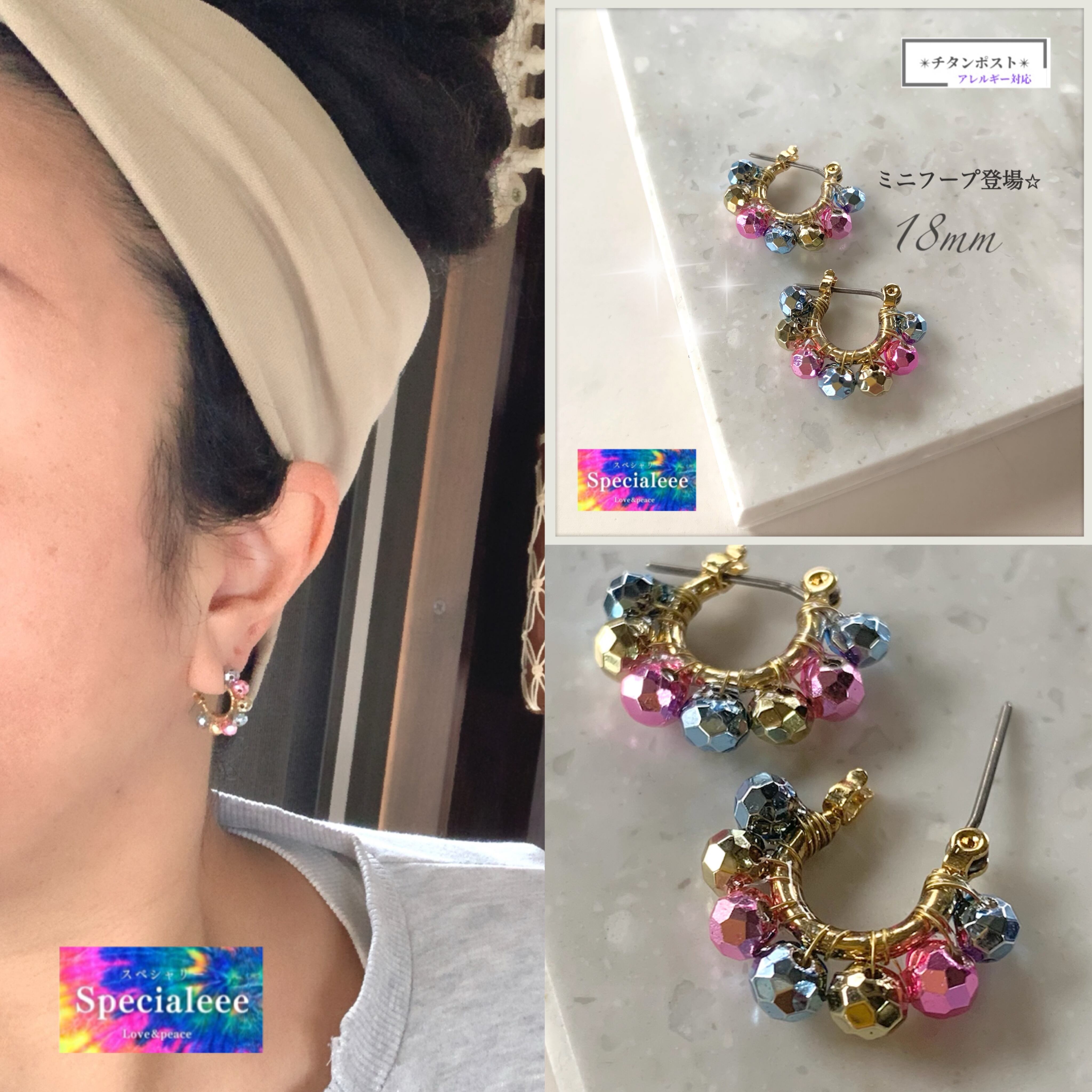 小さめ登場★18mmカラフルメタリックビーズのミニフープピアス★シルバー★個性的★ハンドメイドアクセサリーspecialeee