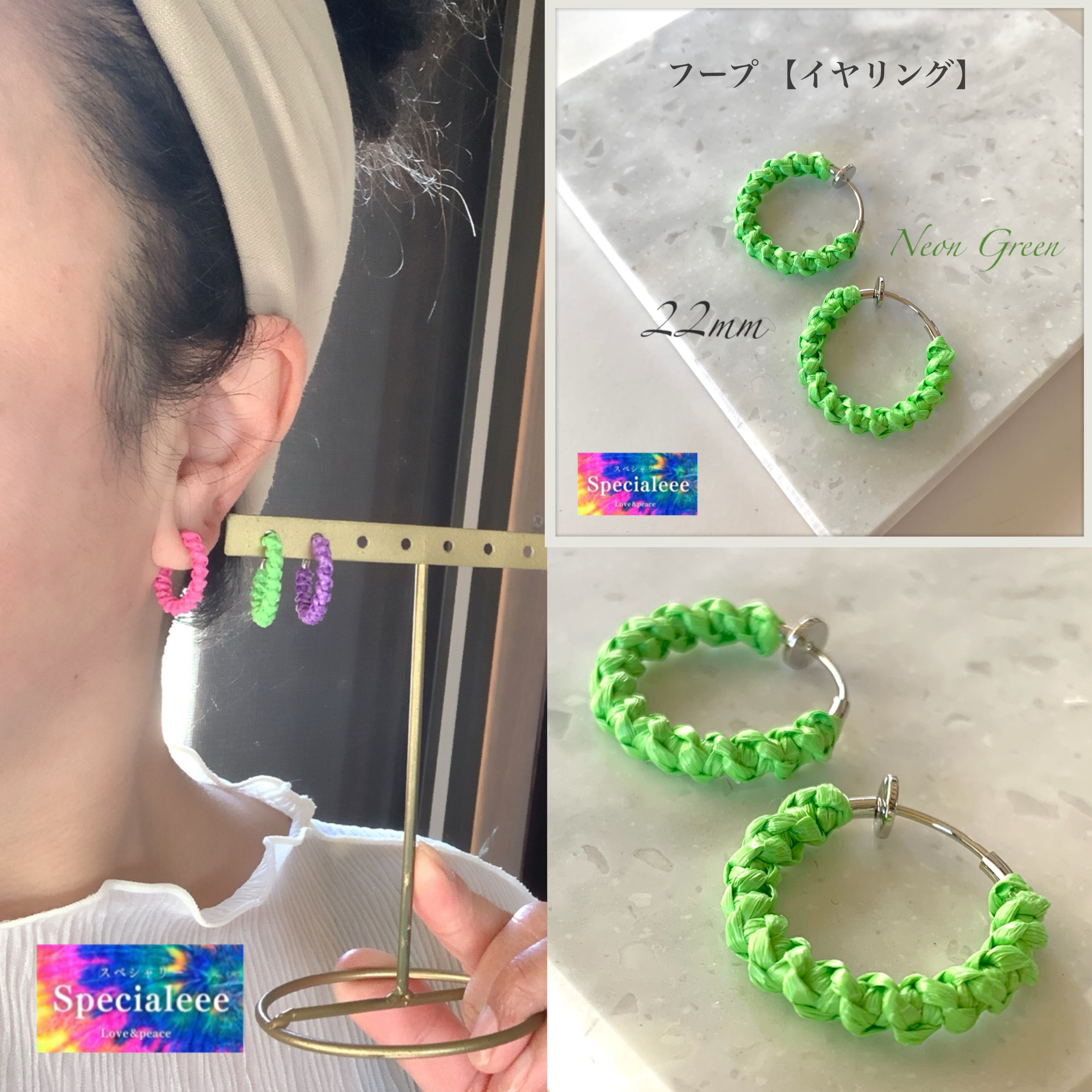 【フープイヤリング】22mm★派手可愛いネオングリーン編み★蛍光黄緑★個性的★インパクト★ピアスに見えるノンホール★ハンドメイドアクセサリーspecialeee