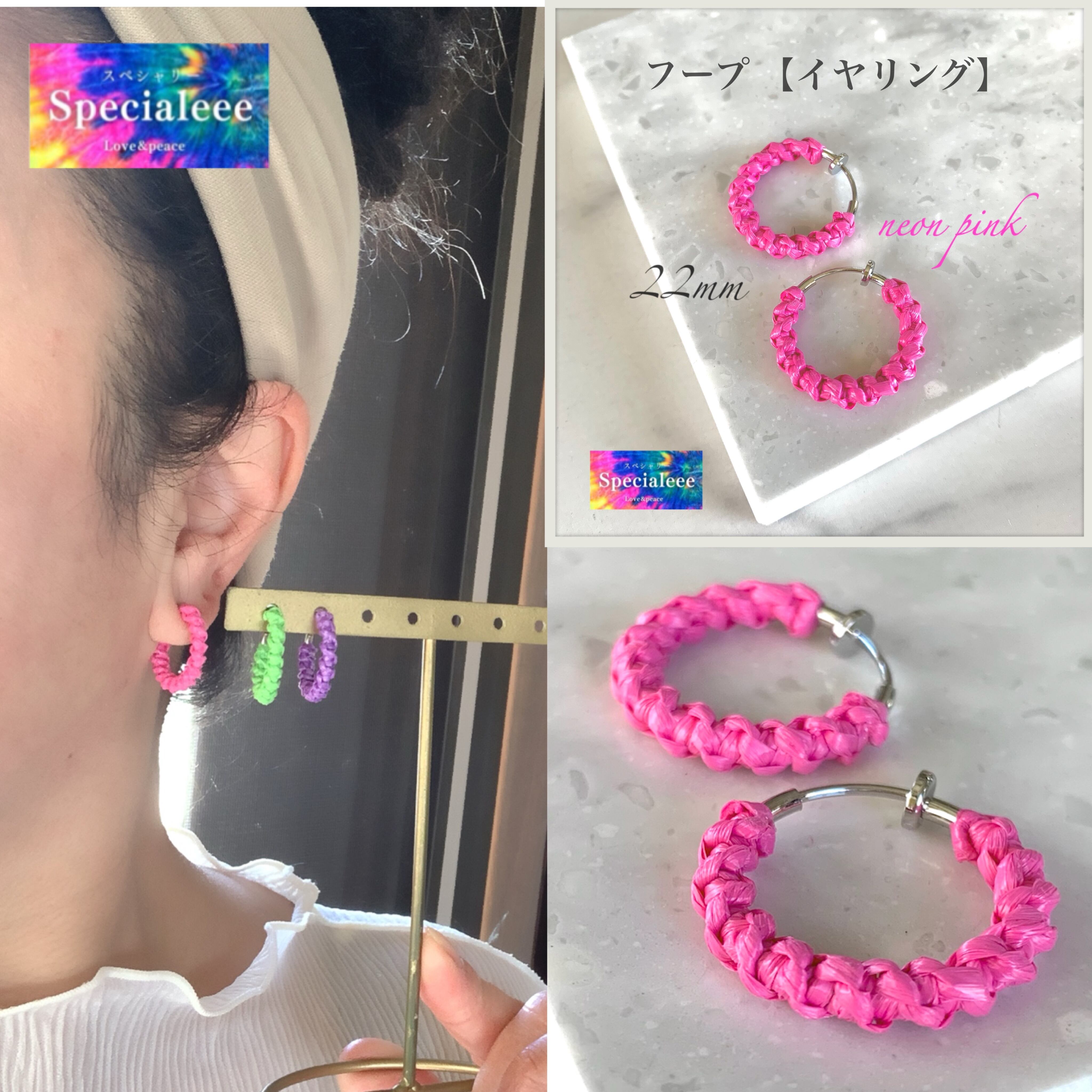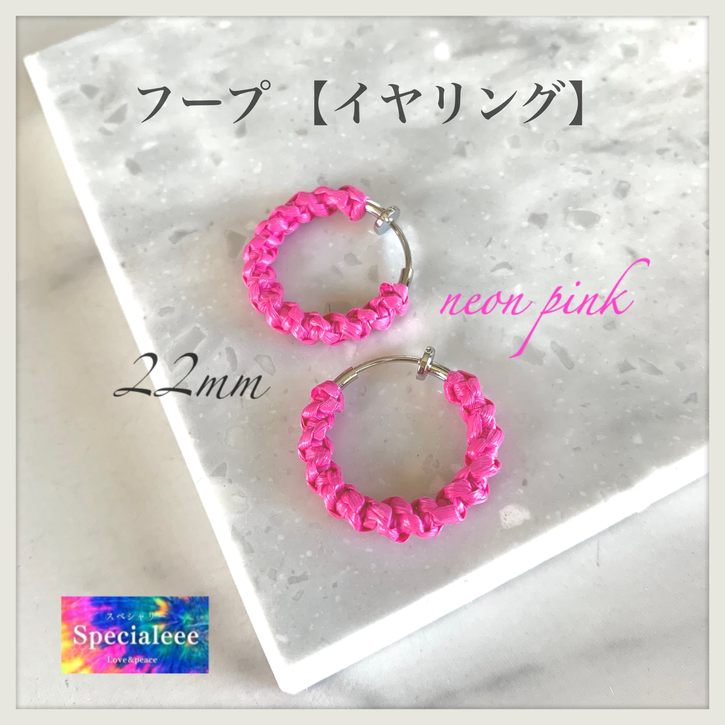 【イヤリング】22mm★ネオンピンク編みフープ★派手可愛い★蛍光pink★個性的★ピアスに見えるノンホール★ハンドメイドアクセサリーspecialeee