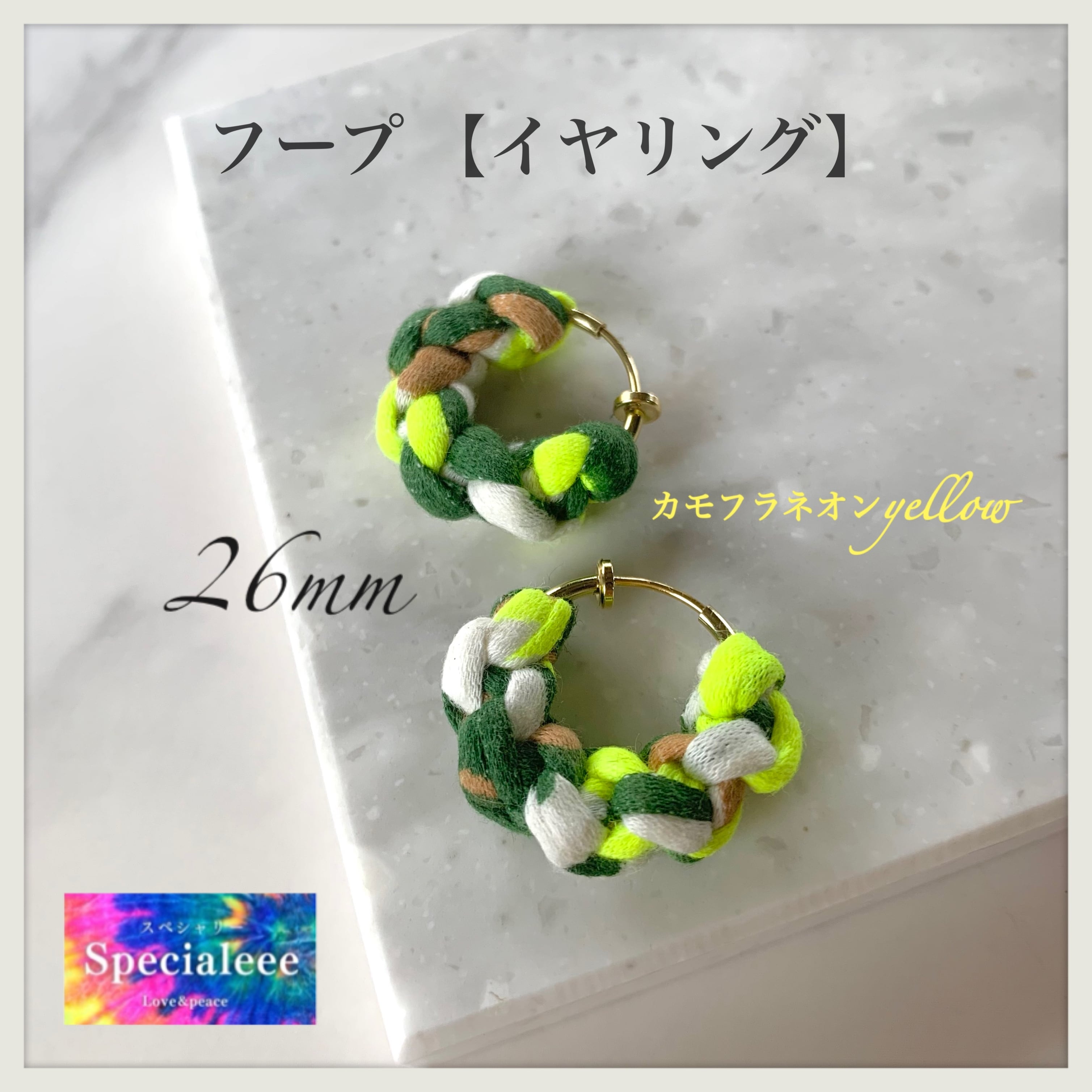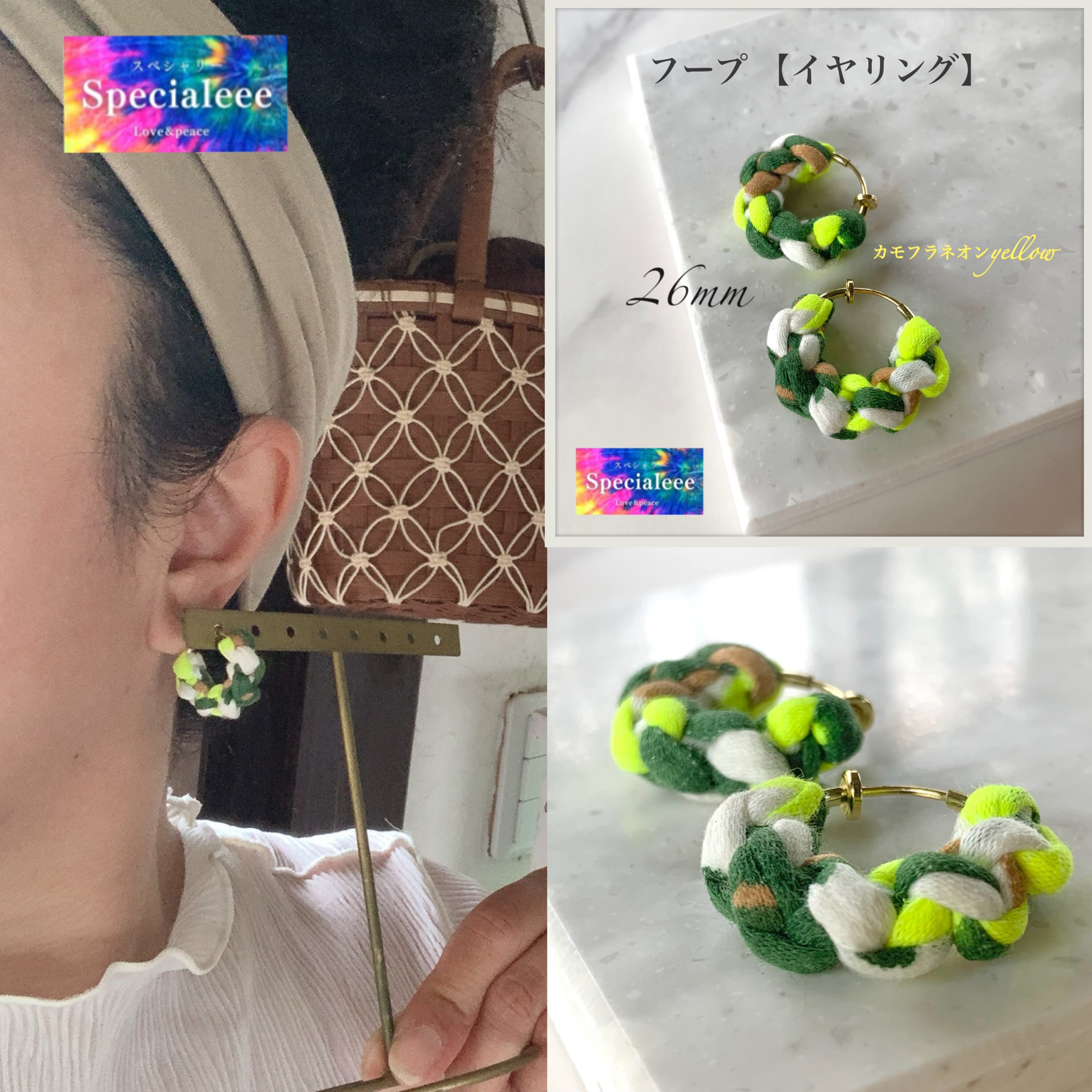 【イヤリング】26mm★迷彩カモフラ&ネオンイエロー太編みフープ★インパクト派手可愛い★目立つ★ハンドメイドアクセサリーspecialeee