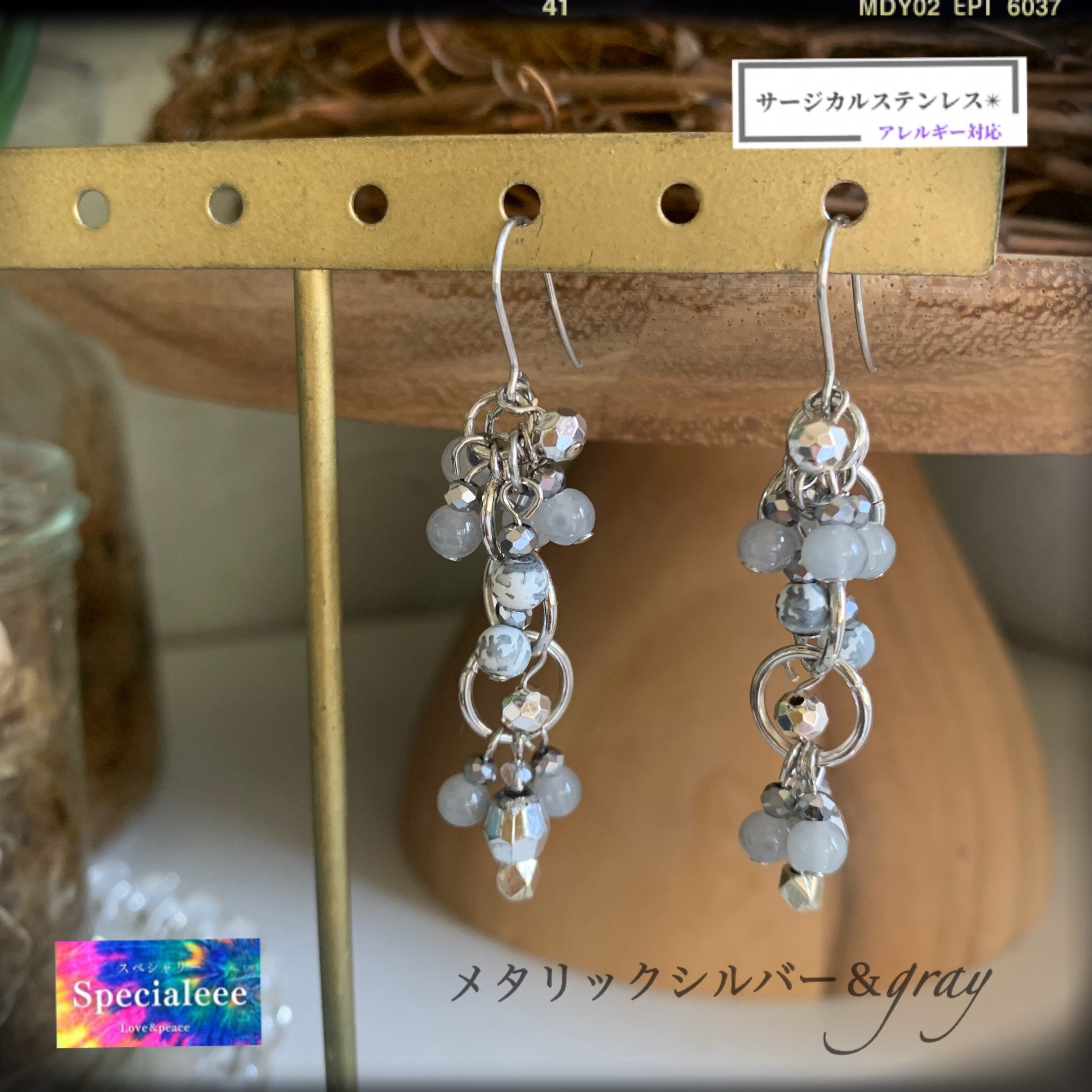 ラスト1個★グレー&メタリックシルバーキラキラしゃらしゃらロングピアス★イヤリングok★サージカルステンレスフック★高品質金具★個性的★灰色★ハンドメイドアクセサリーspecialeee