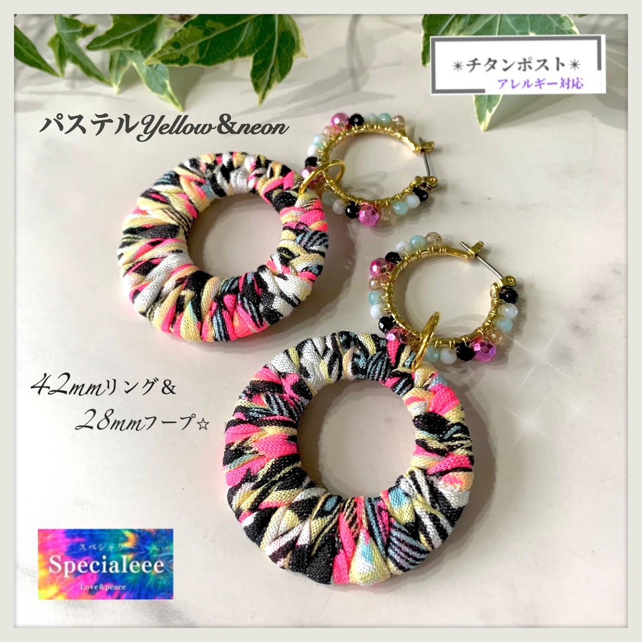 新作★キラキラフープ&カラフルリング揺れるインパクトピアス★パステルイエロー&ネオンピンク★アレルギー対応チタン★派手可愛い★春夏★目立つ★蛍光★ハンドメイドアクセサリーspecialeee