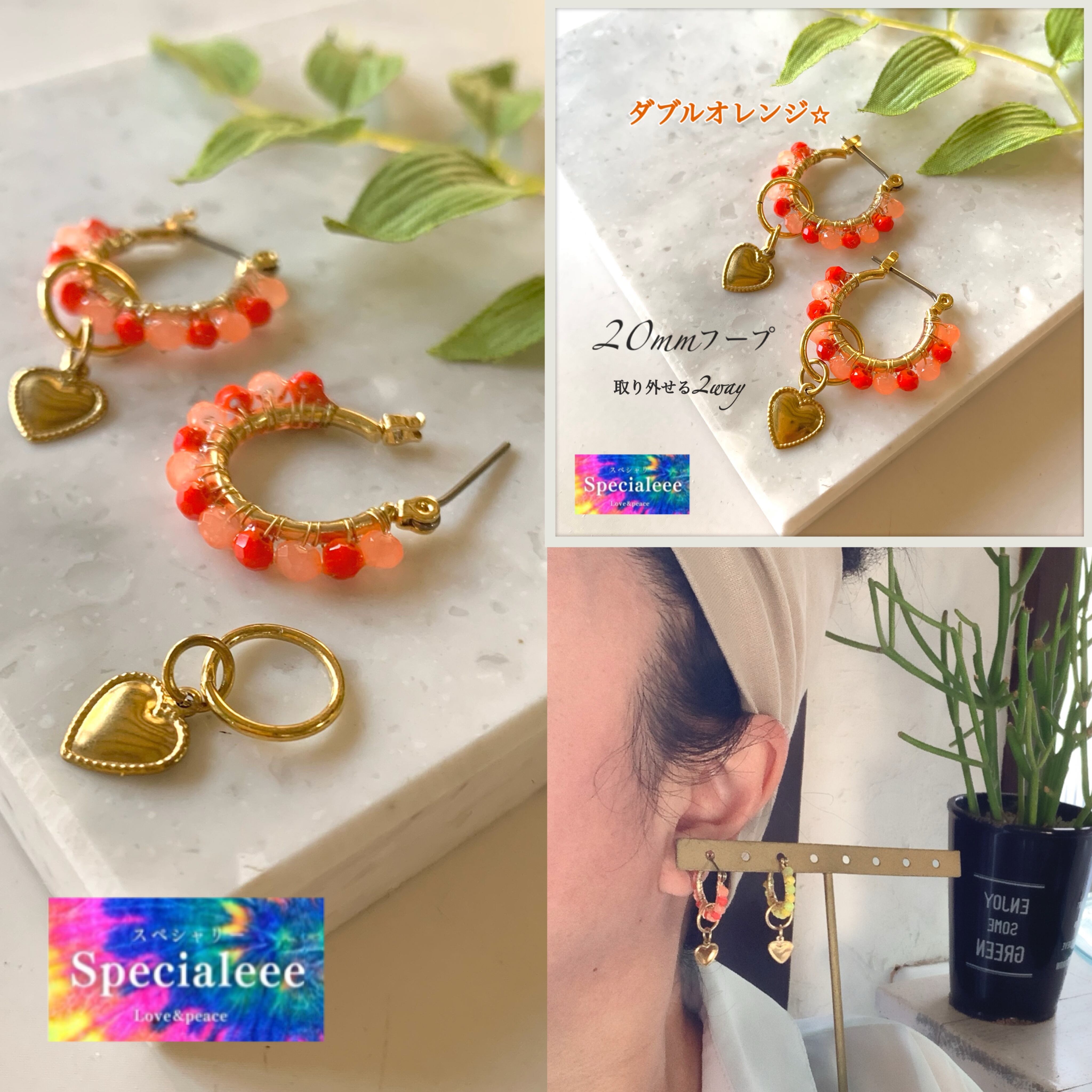 20mm★ダブルオレンジフープピアス★揺れるミニハート★ネオン蛍光★推しカラー★映え色★チタンポスト★