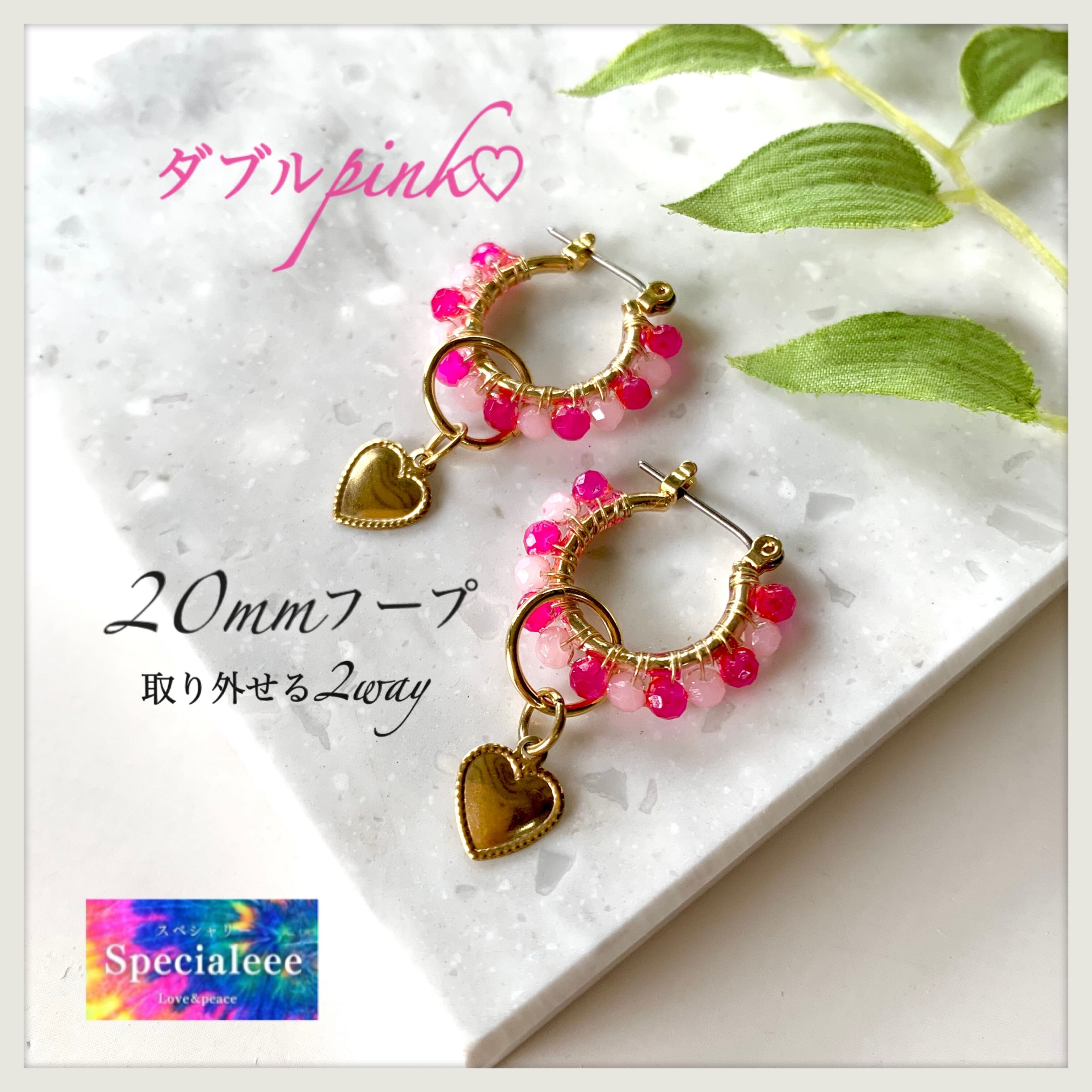 20mm★ダブルピンクビーズフープピアス★揺れるミニハート★アレルギー対応チタン★推しカラー★取り外せる2way★specialeee