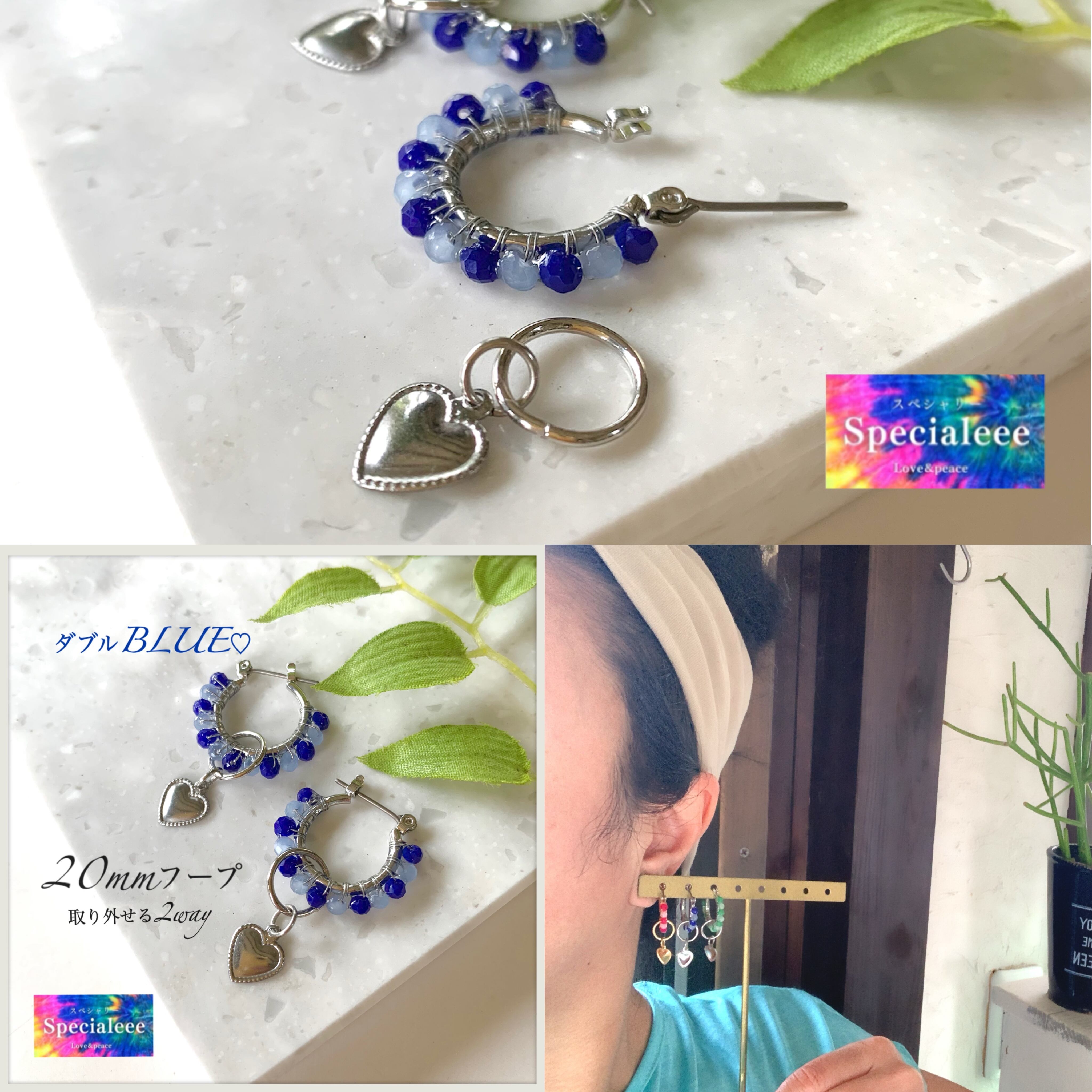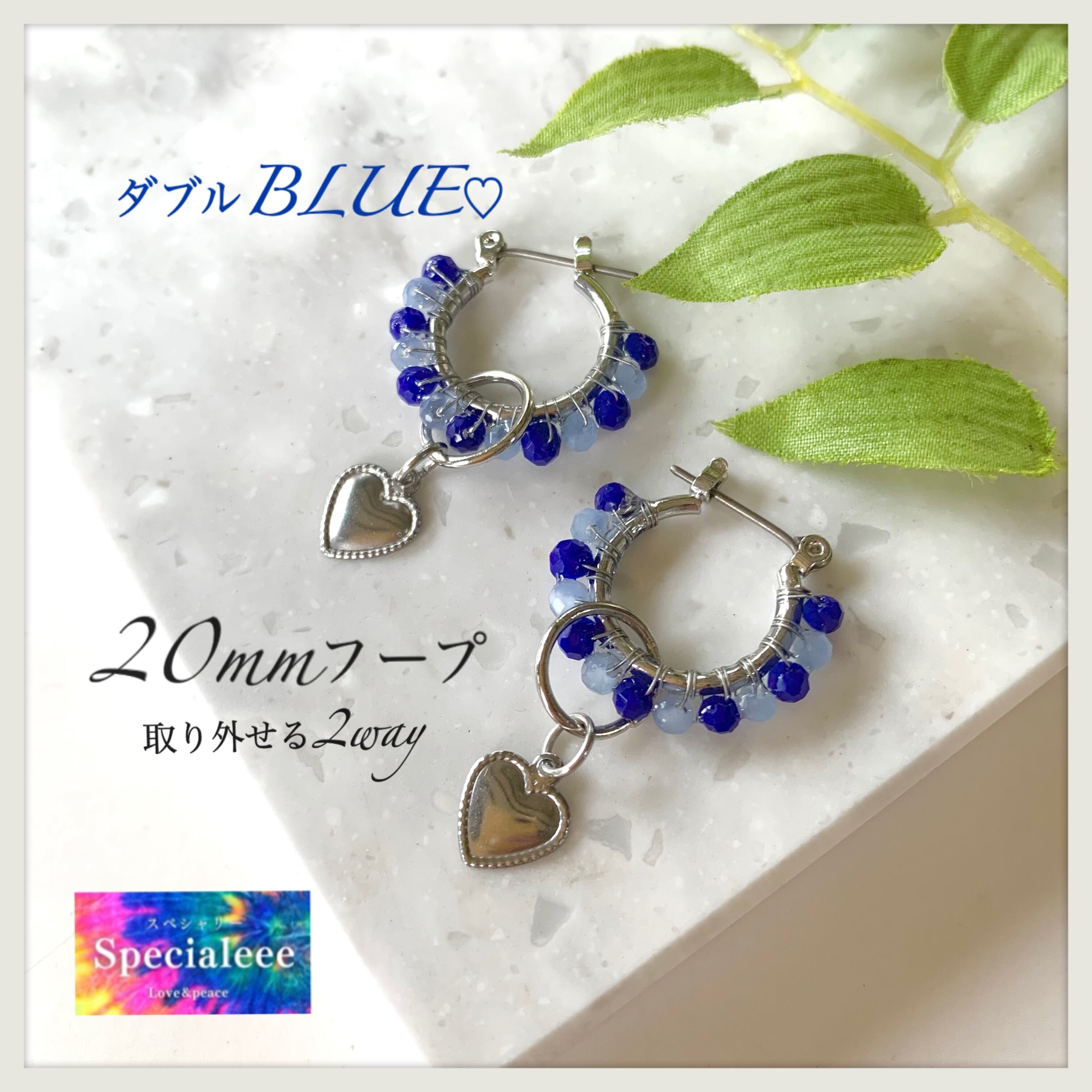 20mm★ダブルブルービーズフープピアス★揺れるミニハート★青★推しカラー★取り外せる2way★アレルギー対応チタン★
