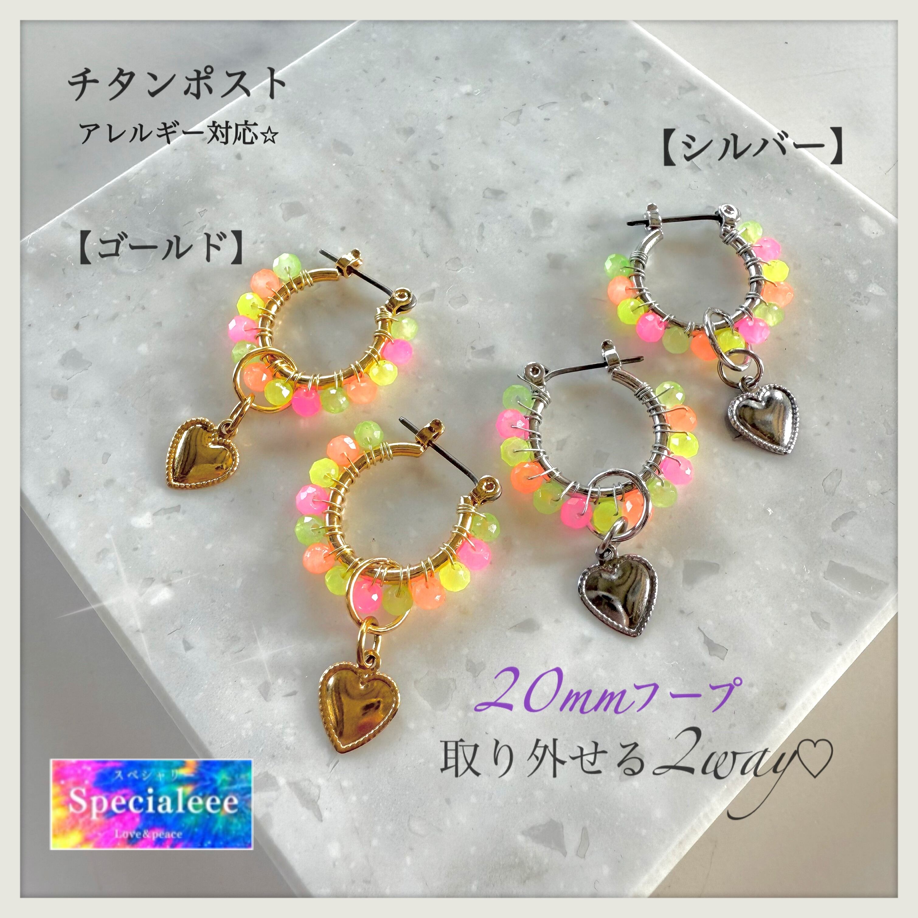 20mm★カラフルネオンビーズフープピアス★揺れるミニハート★シルバーかゴールド★イヤリング無料サイズ!チタンポスト★派手可愛い★