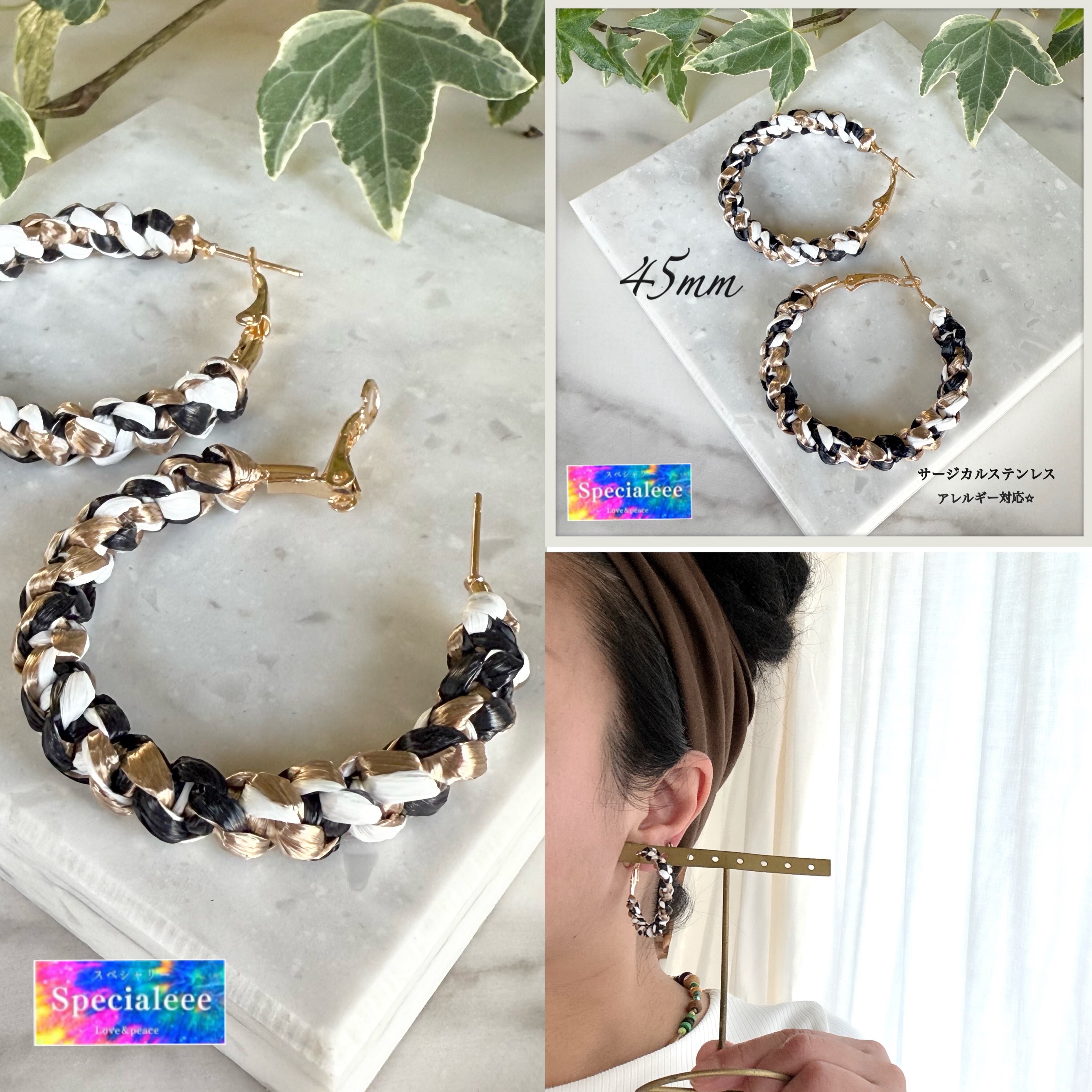 45mm★白黒&光沢ゴールド3色編みフープピアス★大ぶり★スタイリッシュ個性★サージカルステンレス★お洒落★イヤリング+¥200★spcialeee