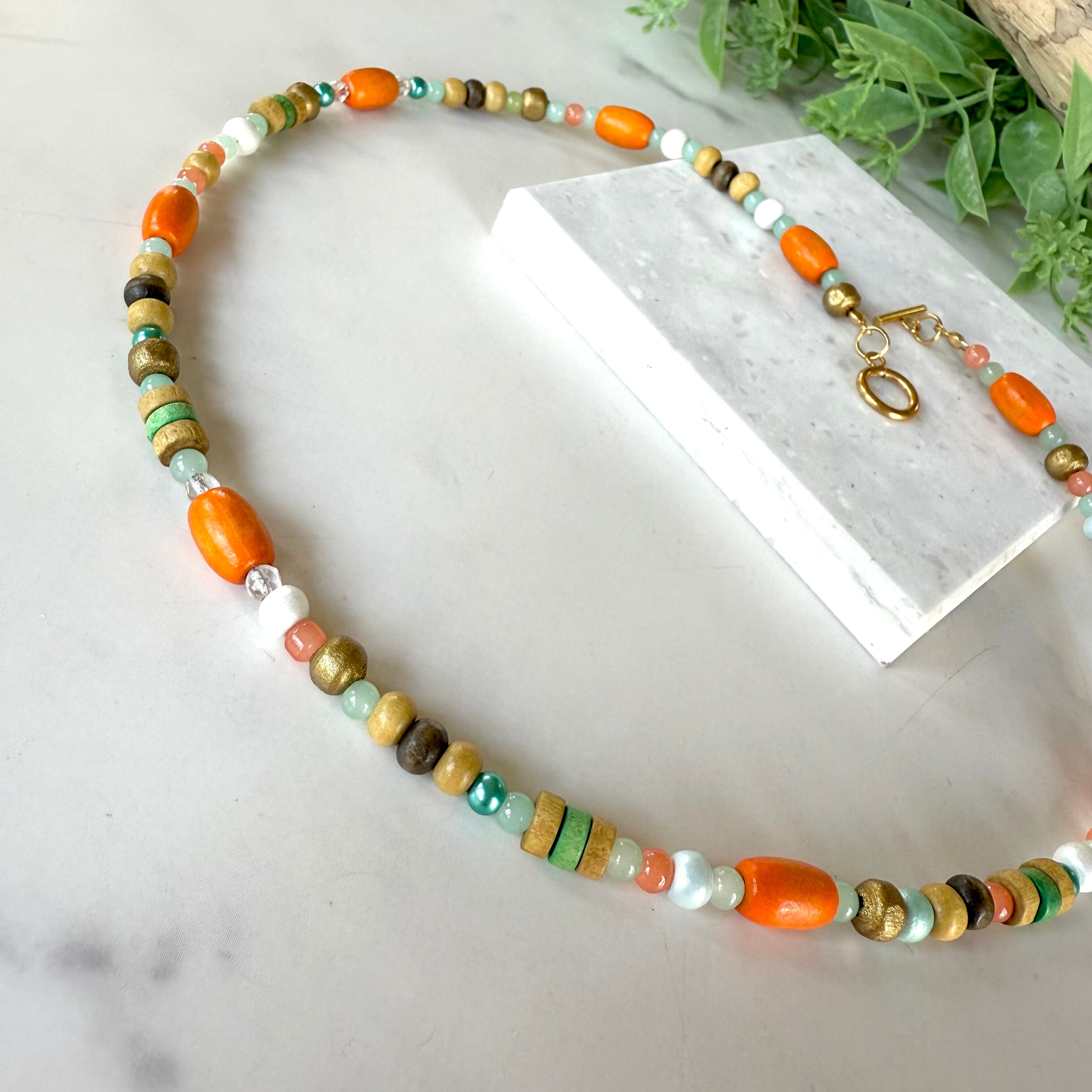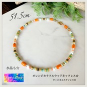 51.5cm★オレンジ&カラフルウッド&水晶のオリジナルネックレス★アレルギー対応サージカルステンレス★シルバーも作れます★数量限定★エスニック★レゲエ★カジュアル