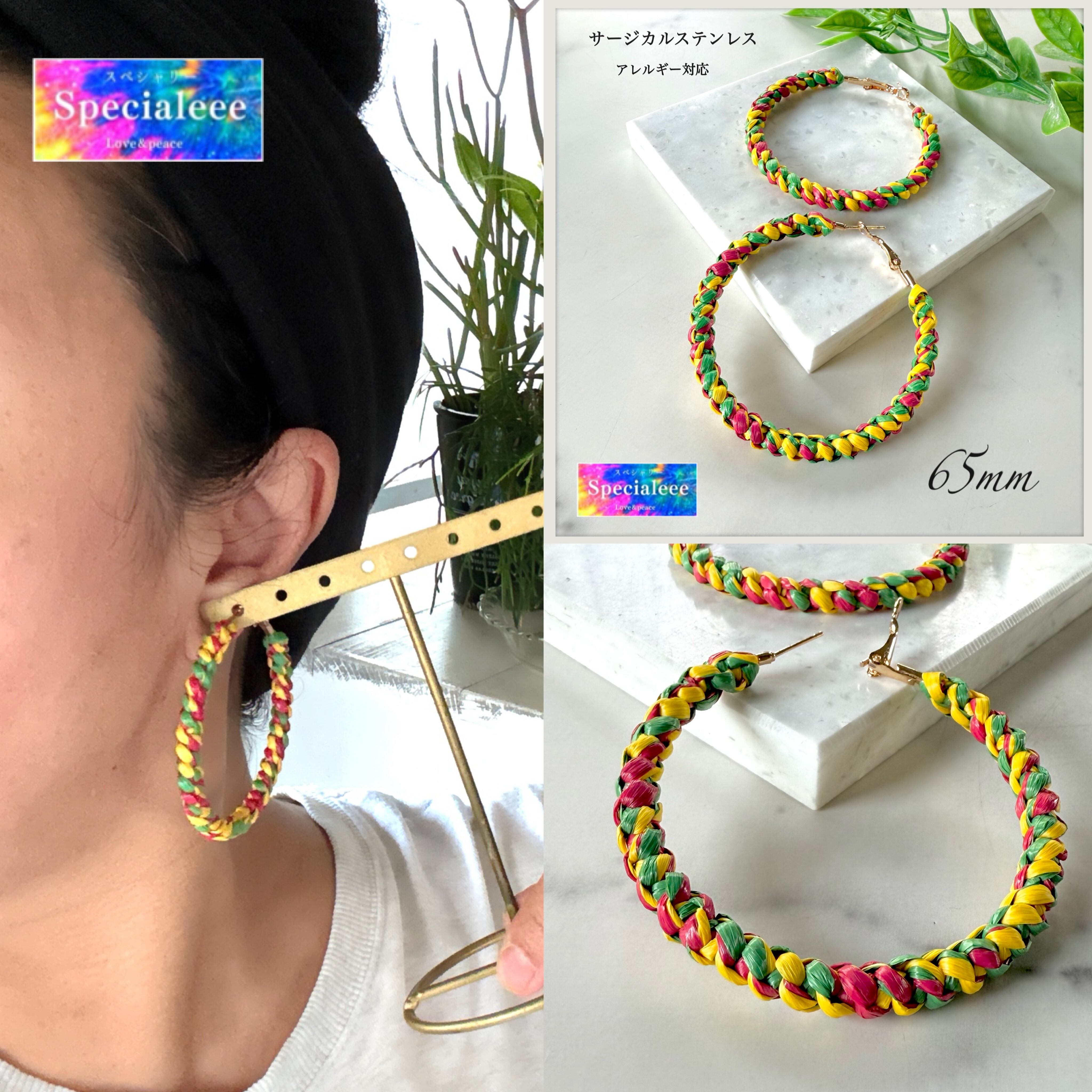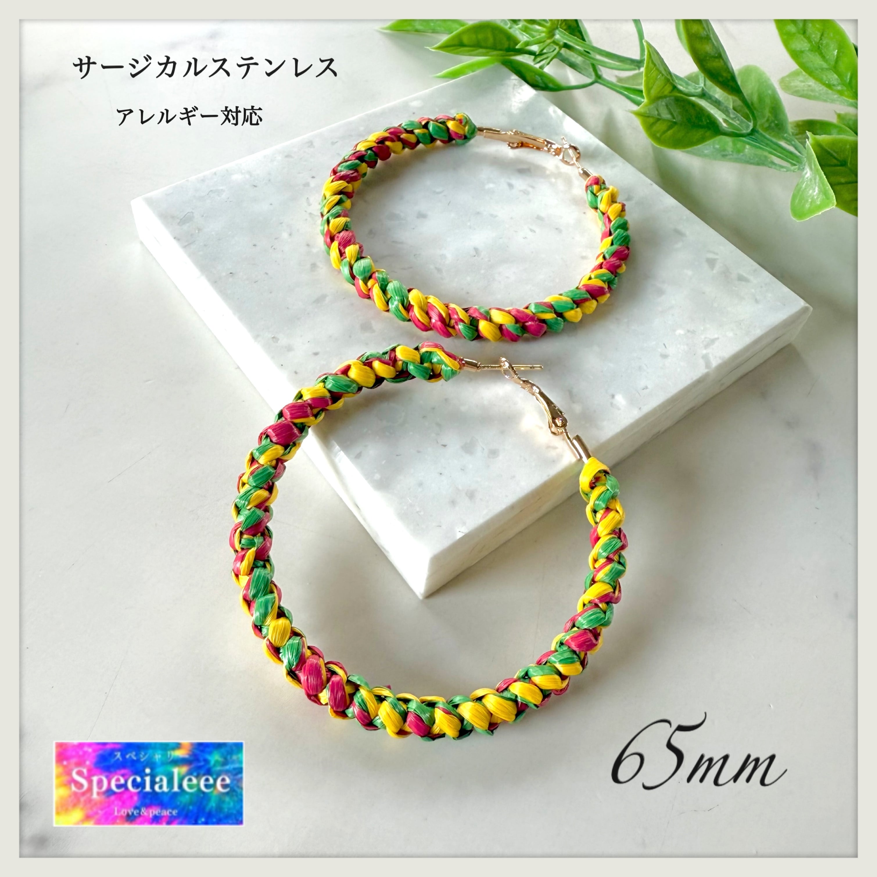 65mm★ラスタカラー編み大ぶりフープピアス★サージカルステンレス★イヤリング+¥200★レゲエアフリカンダンス★夏★イベント★