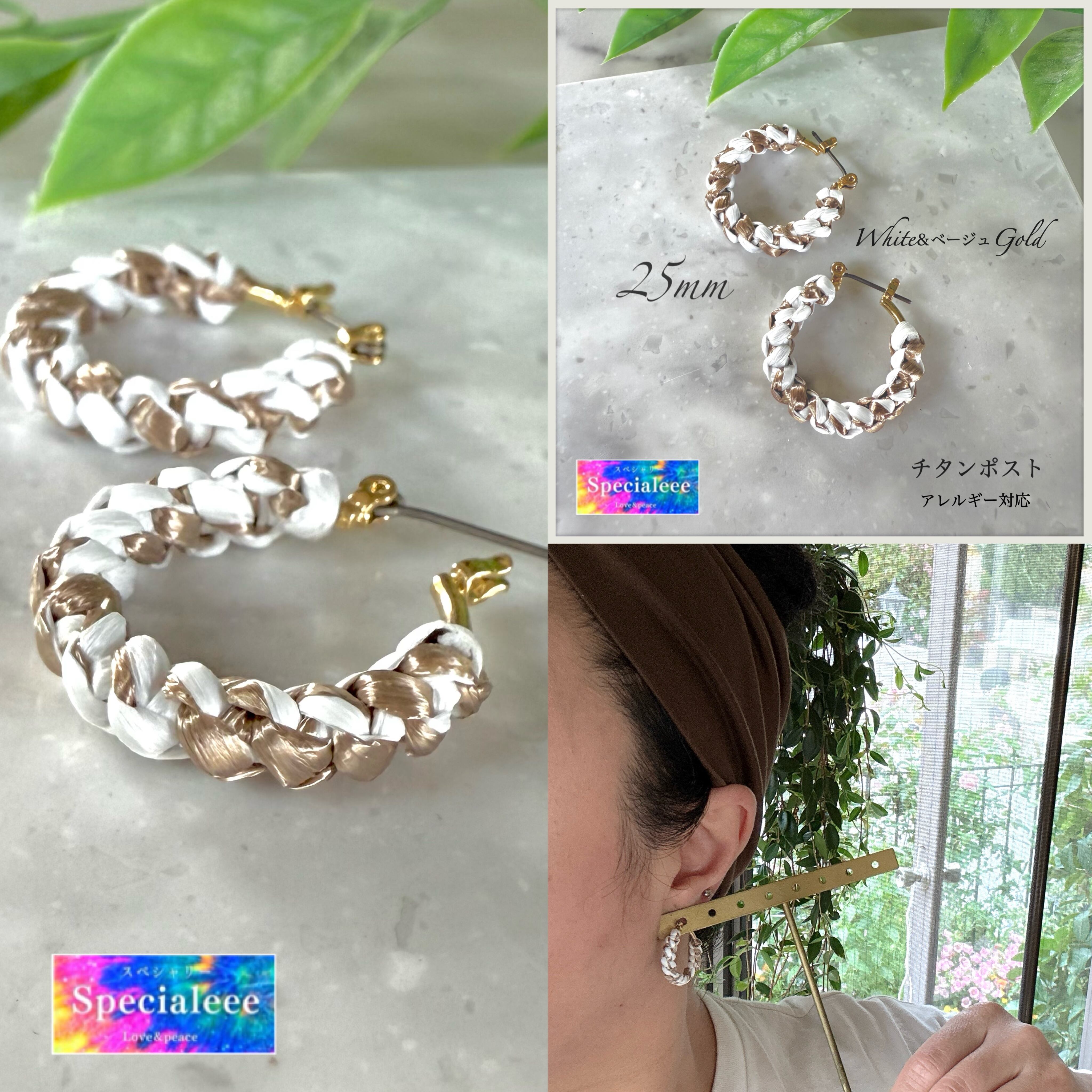 25mm★ホワイト&ベージュゴールド編みフープピアス★チタンポスト★アレルギー対応★イヤリング+¥100★白★お洒落★spcialeee