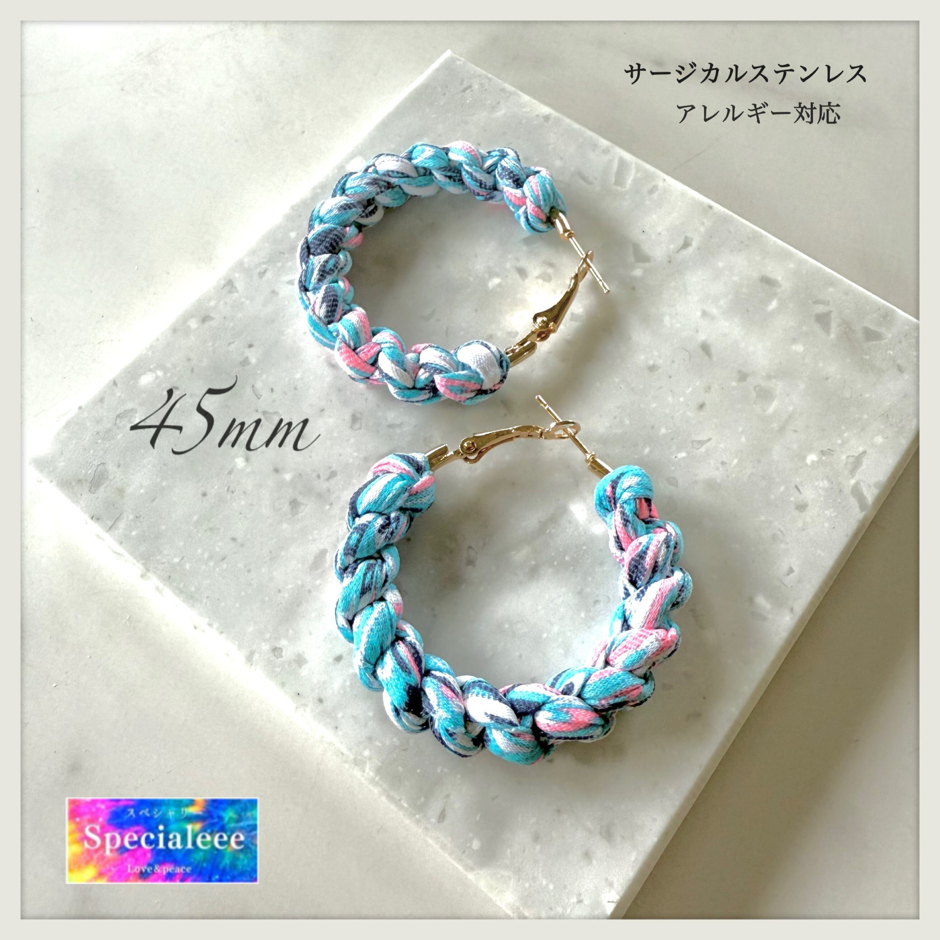 45mm★水色ホワイト&ネオンピンク太編みフープピアス★大ぶり★サージカルステンレス★派手可愛い★イヤリング+¥200★カラフルホワイト★spcialeee