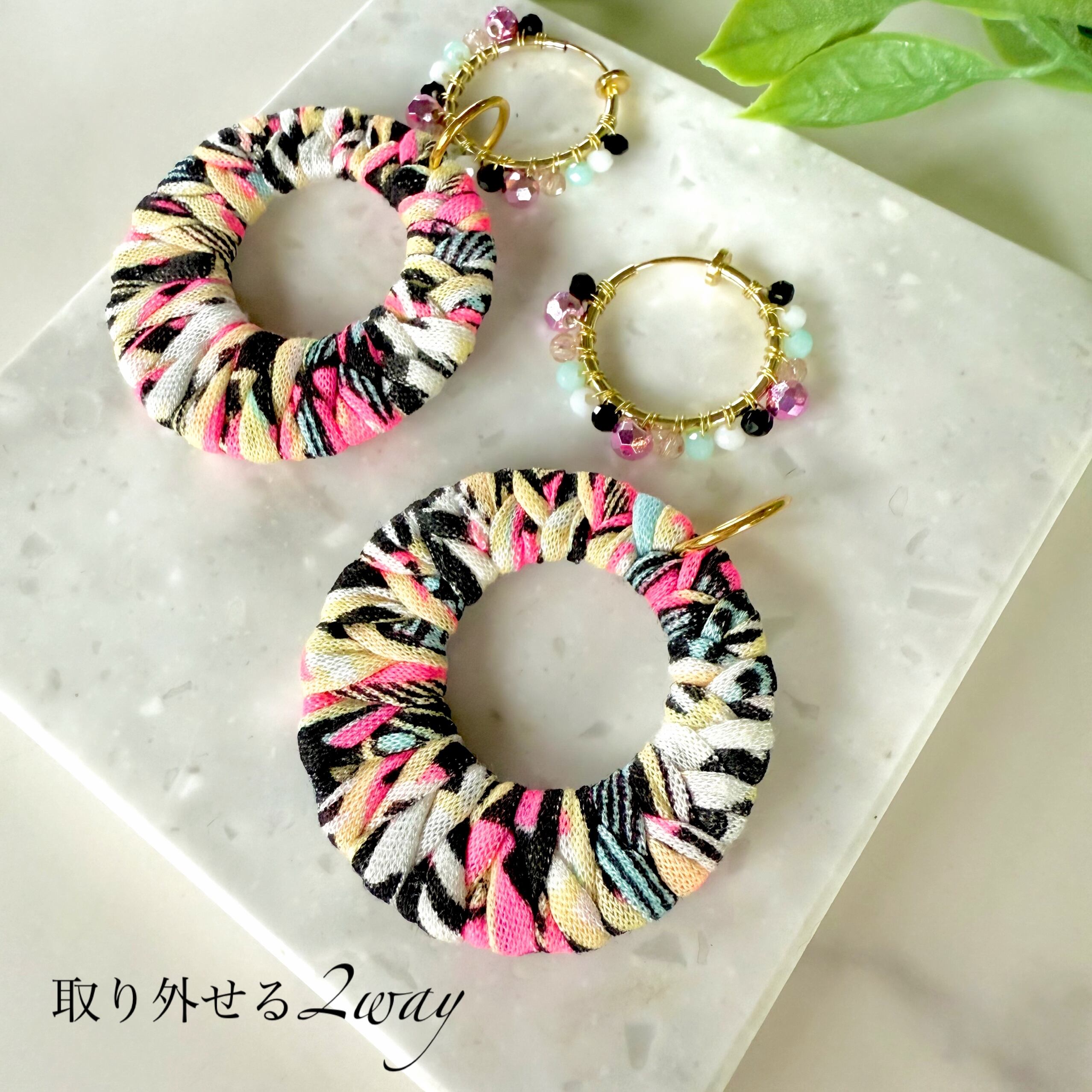 【イヤリング】キラキラフープ&揺れる42mmカラフルリング★パステルイエロー&ネオンピンク★取り外せる2way☆夏☆派手可愛い★大ぶり★
