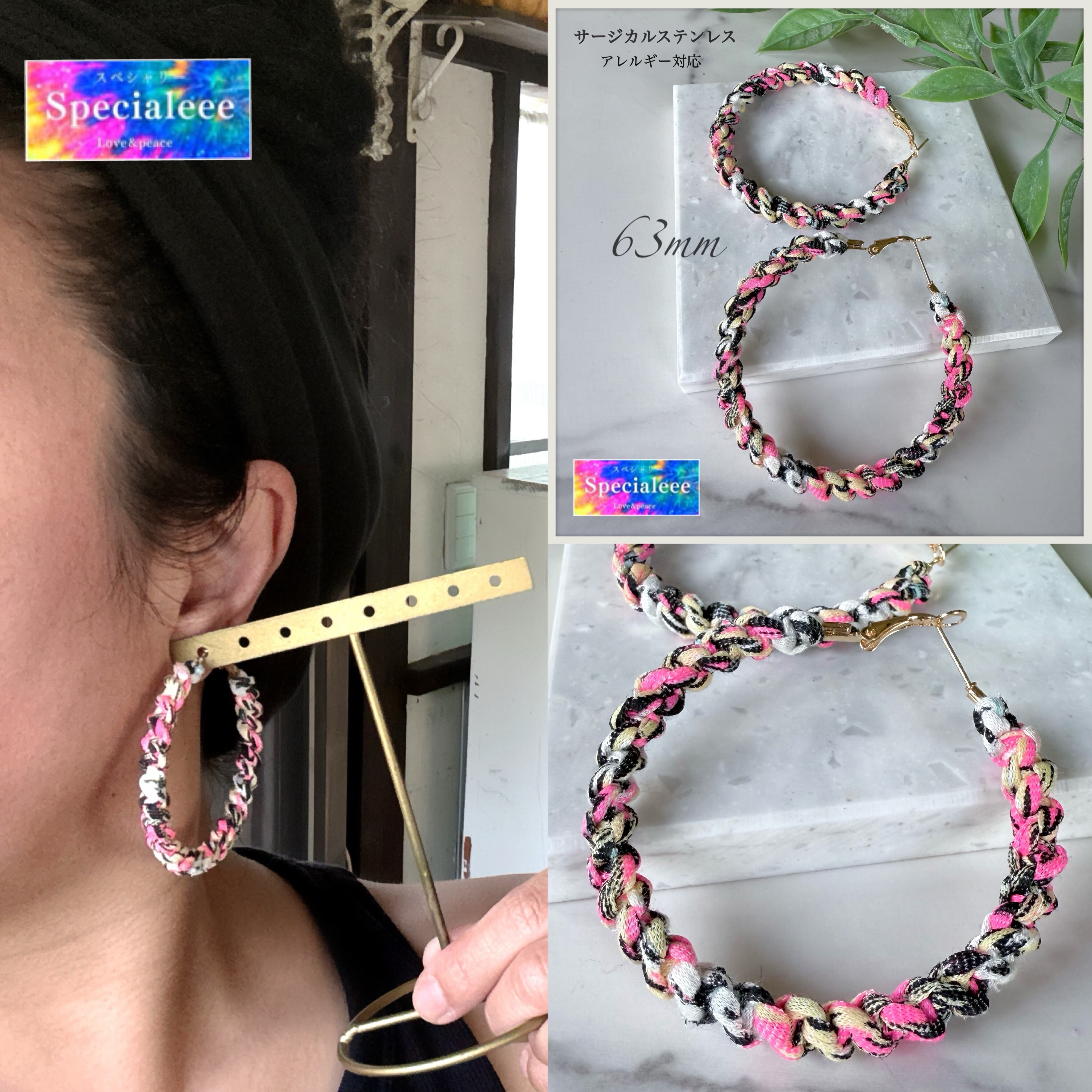 63mm★ネオンピンク&パステルイエローカラフル編みフープピアス★サージカルステンレス★派手可愛い★大ぶり★イヤリング+¥200★spcialeee