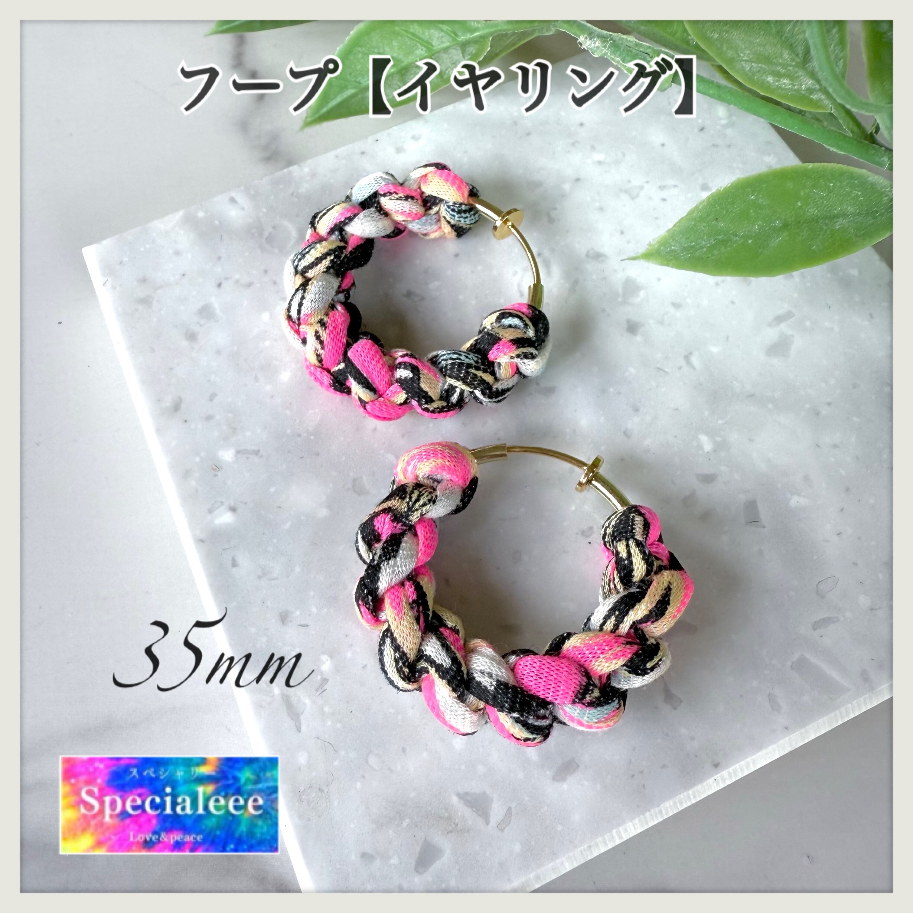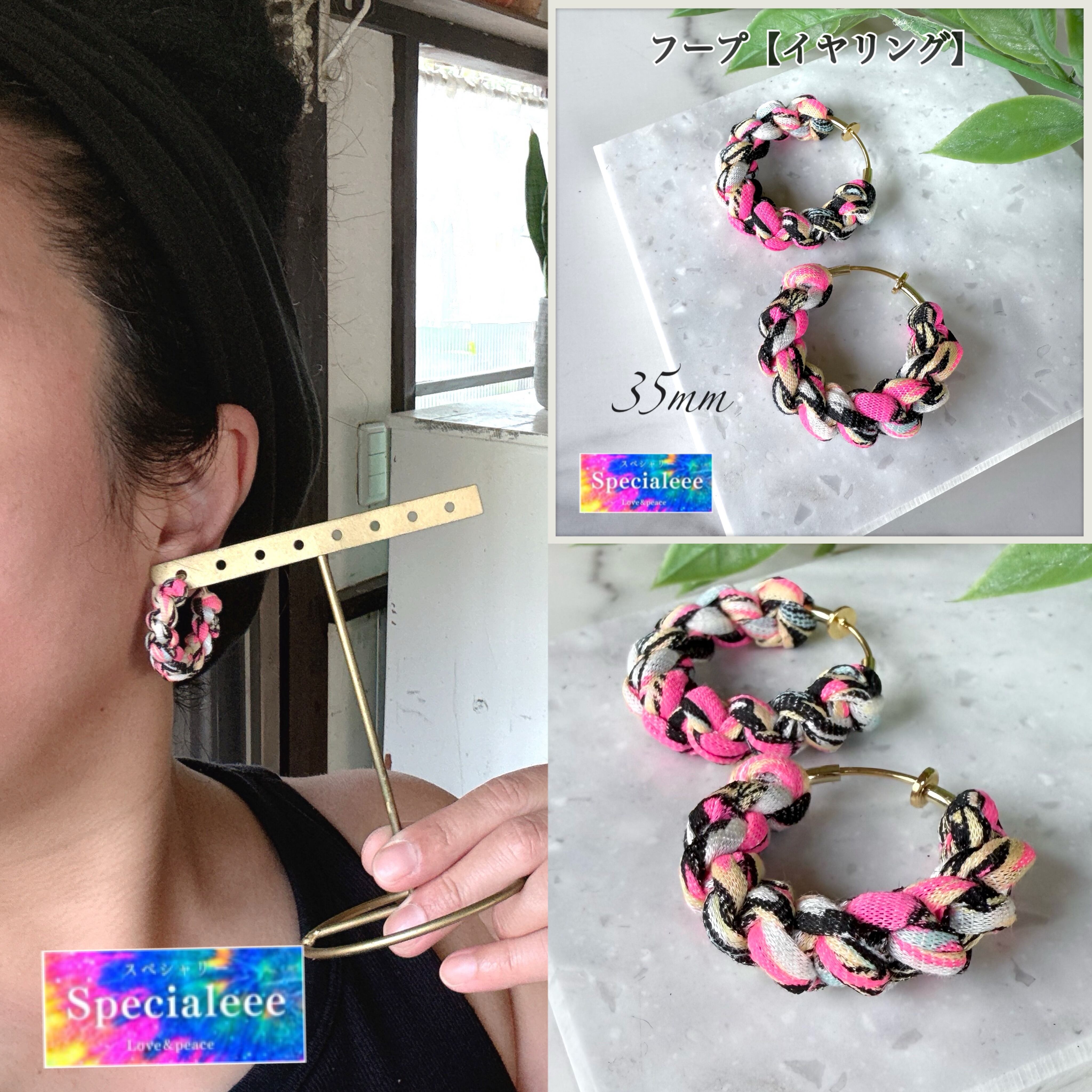 【イヤリング】35mm★ネオンピンク&パステルイエロー太編みフープイヤリング★派手可愛い★ピアスに見えるノンホール★spcialeee