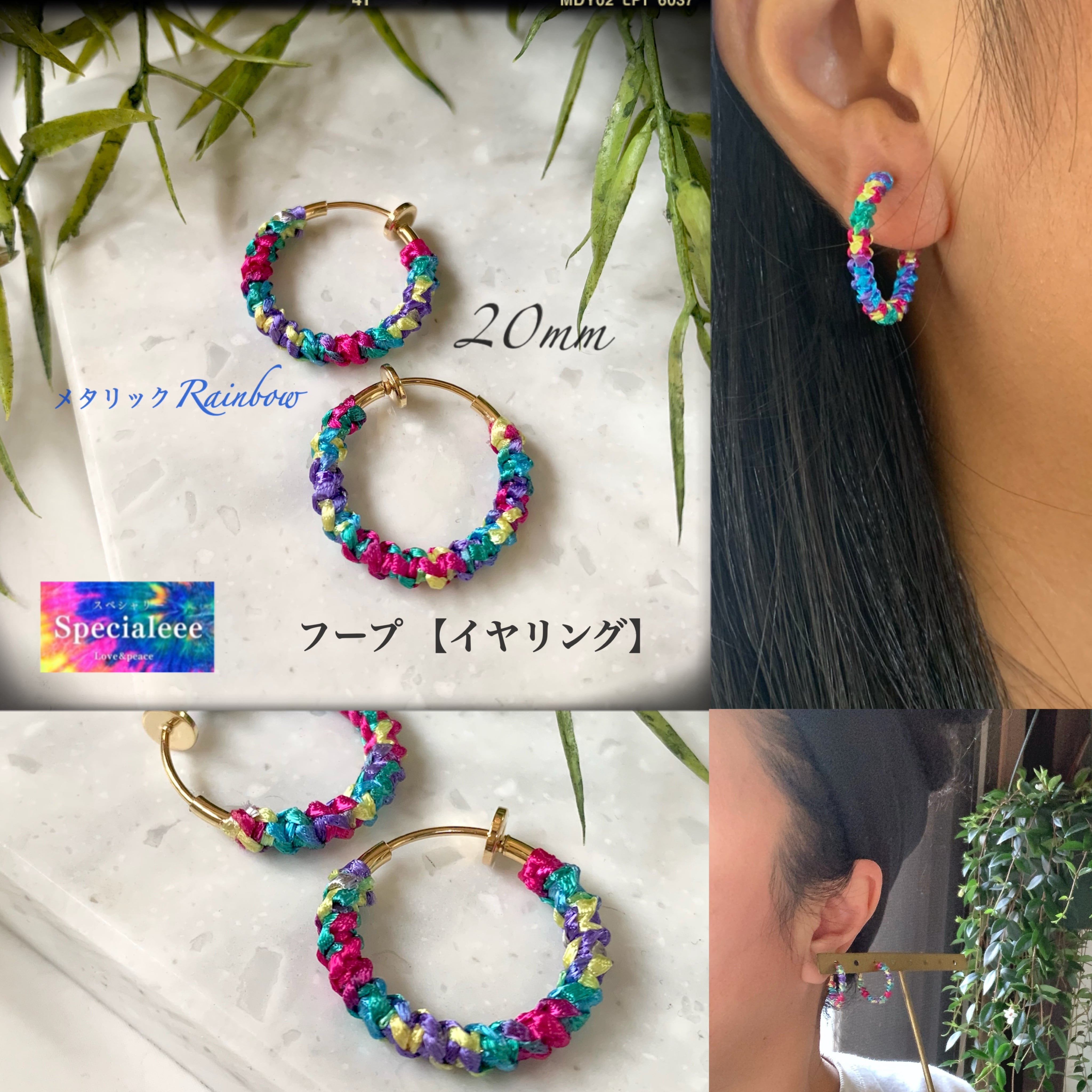 【イヤリング】20mm★メタリックカラフルレインボー編みフープイヤリング★小さめ可愛い★虹色★ピアスに見える★