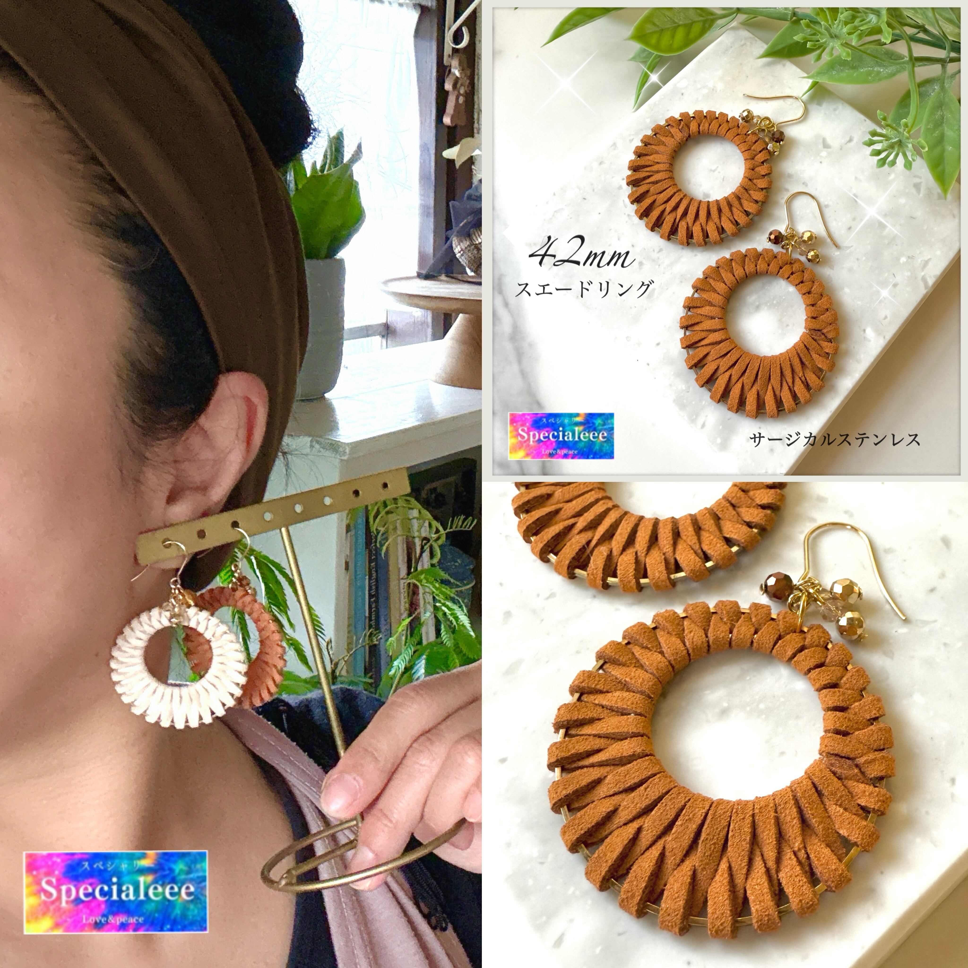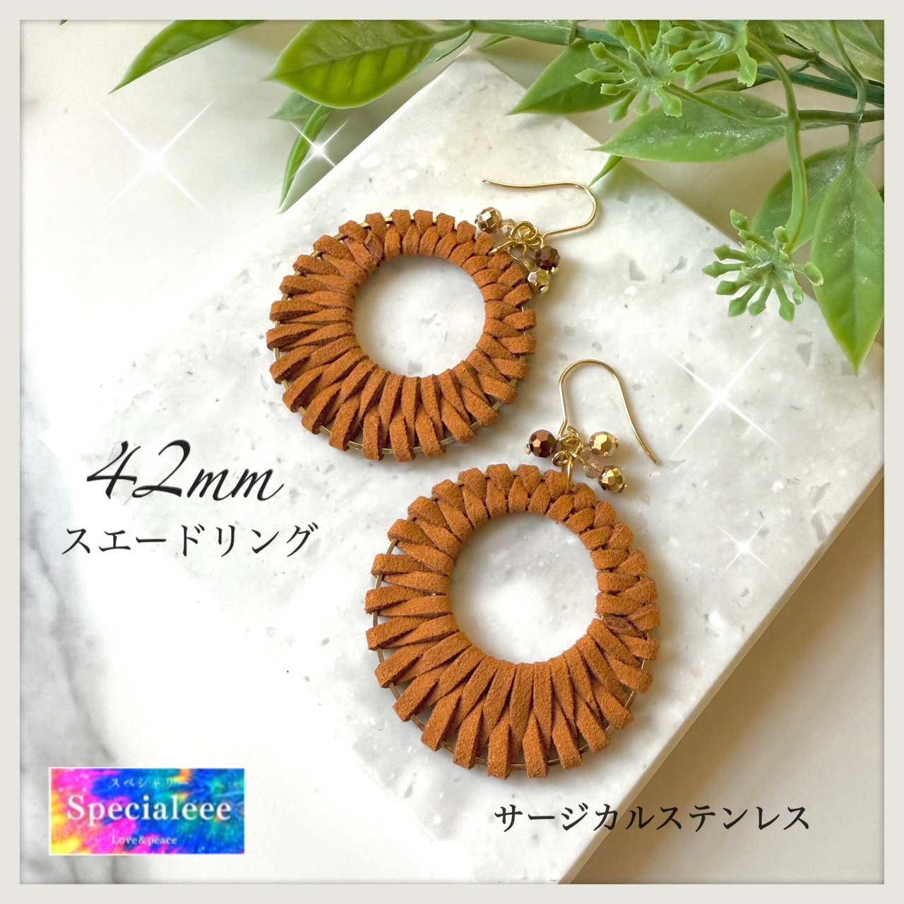 限定デザイン★42mmオレンジブラウンスエード編みリング揺れるピアス★キラキラビーズ★サージカルフック★イヤリング無料付け替え☆