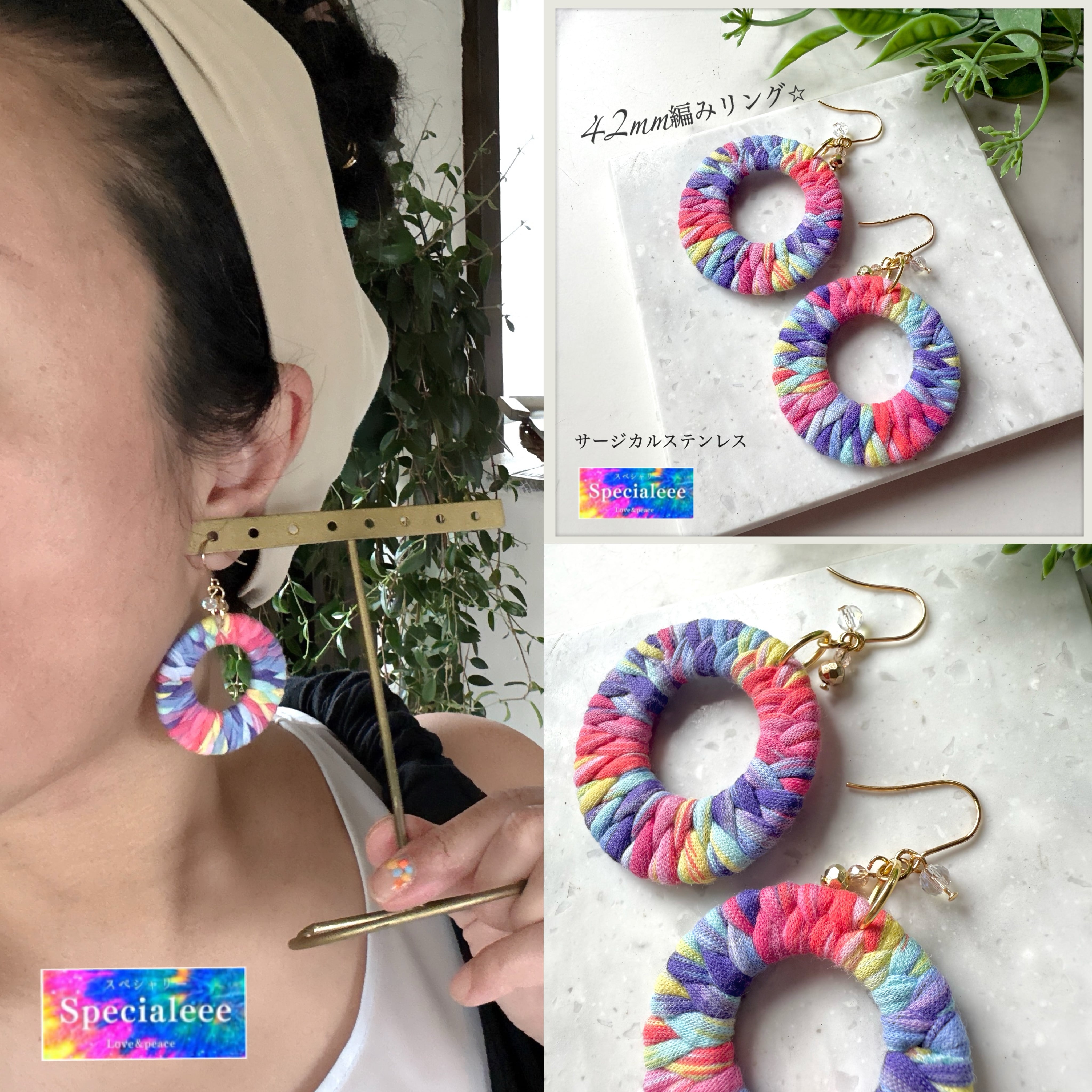 42mm編みリング&キラキラビーズピアス★まろやかパステルレインボー★サージカル★カラフル★