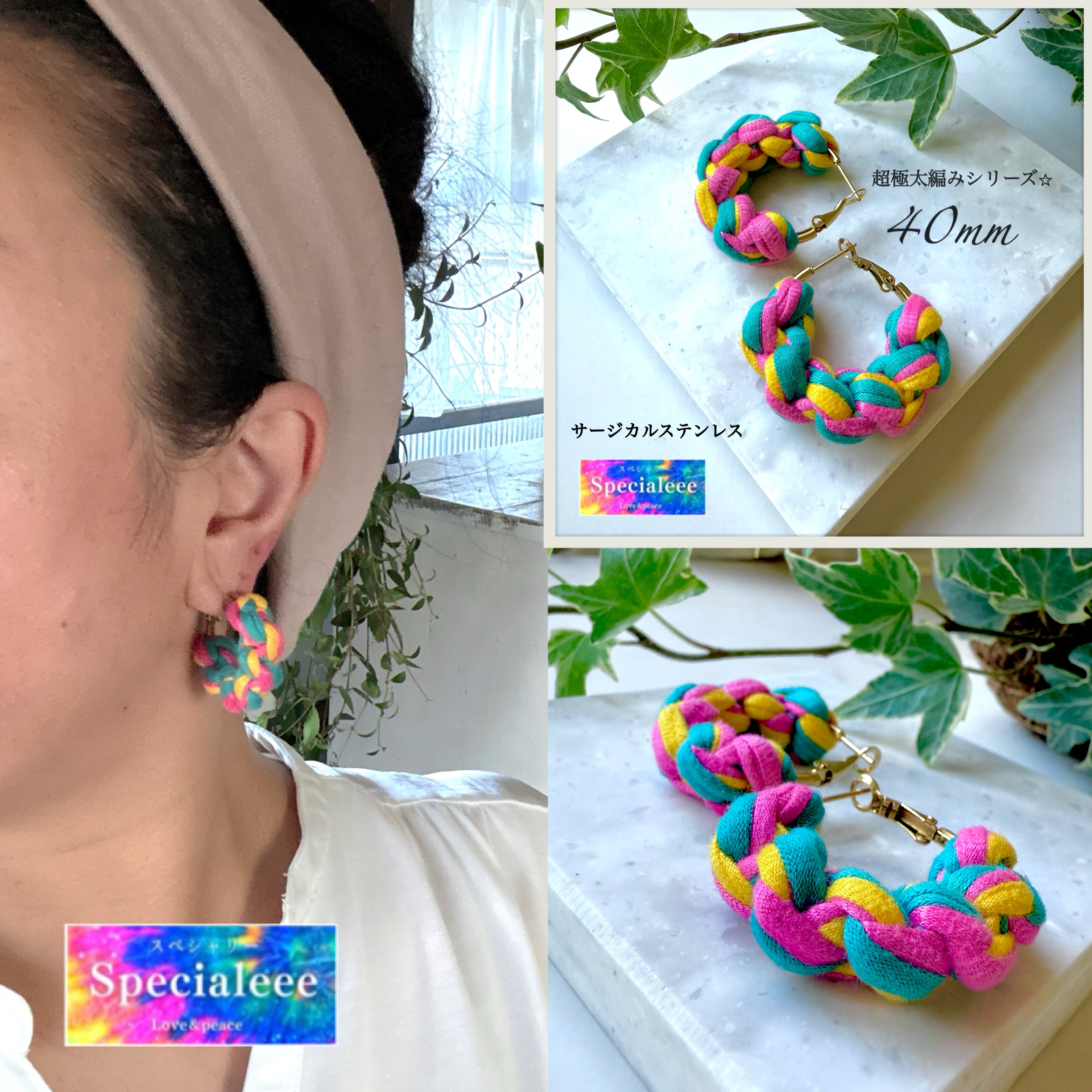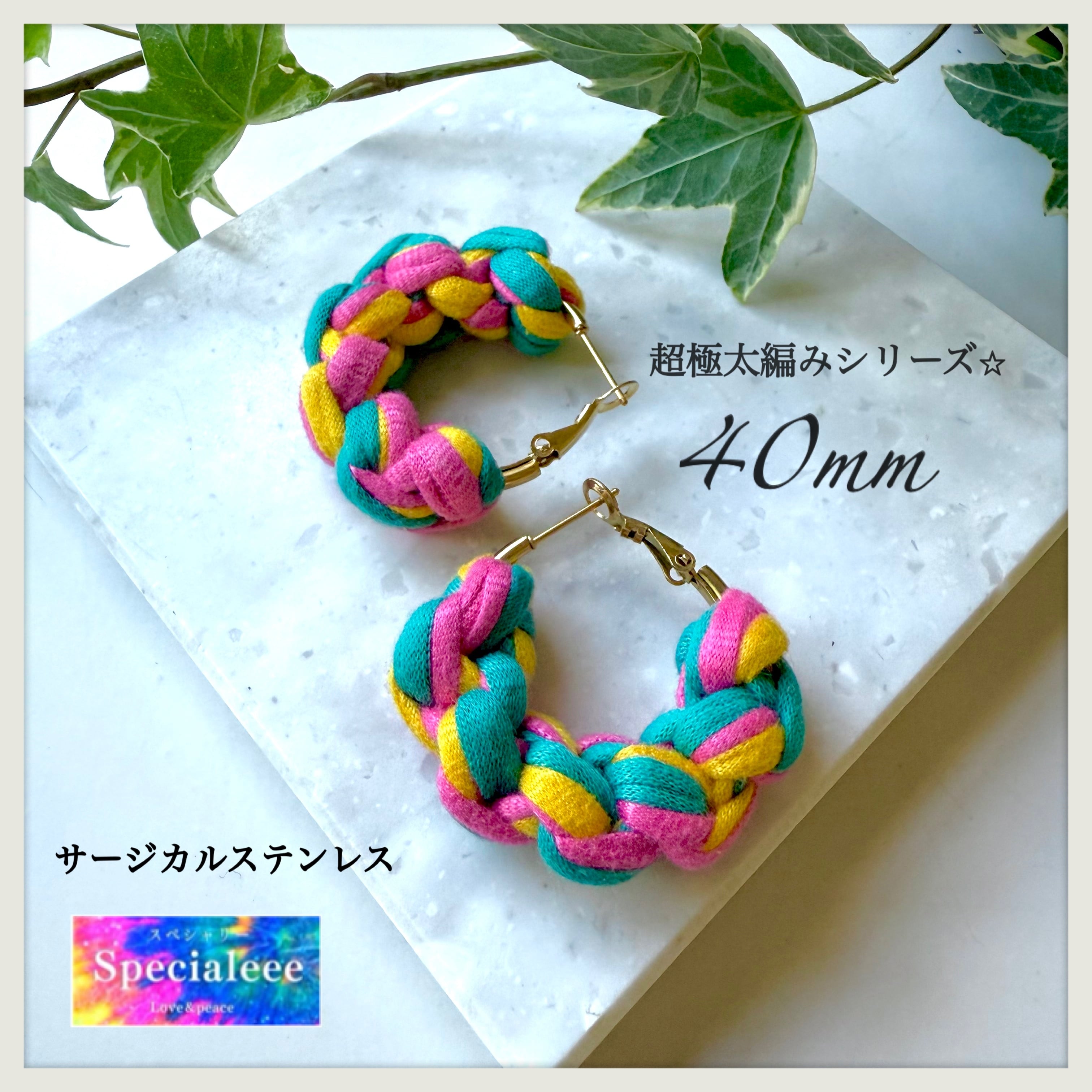 40mm★超極太編みカラフルフープピアス★ターコイズピンクイエロー★サージカルステンレス★派手可愛いネオンカラー★