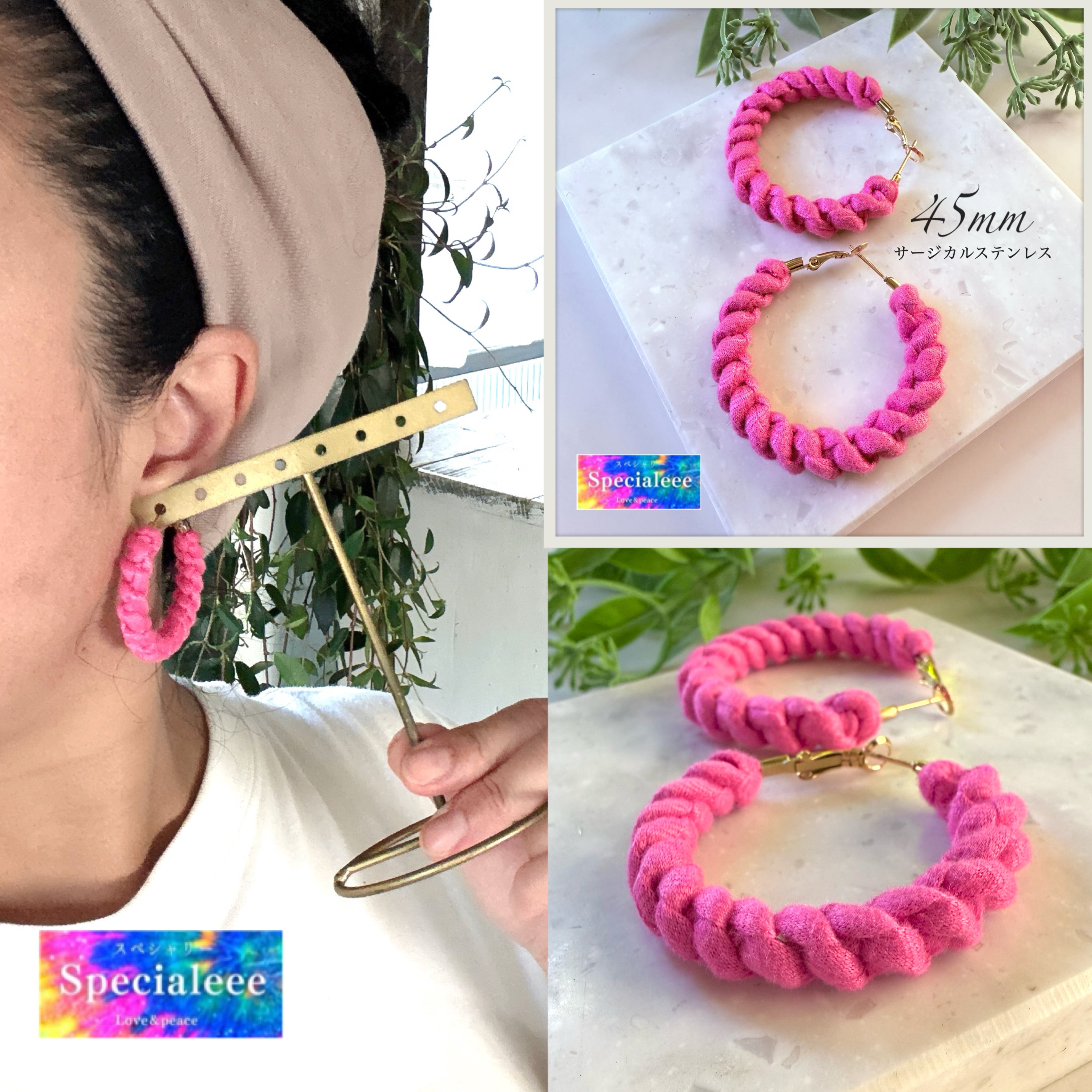 限定ピンクカラー★45mm太編みフープピアス★サージカルステンレス★カラフル可愛い★pink★