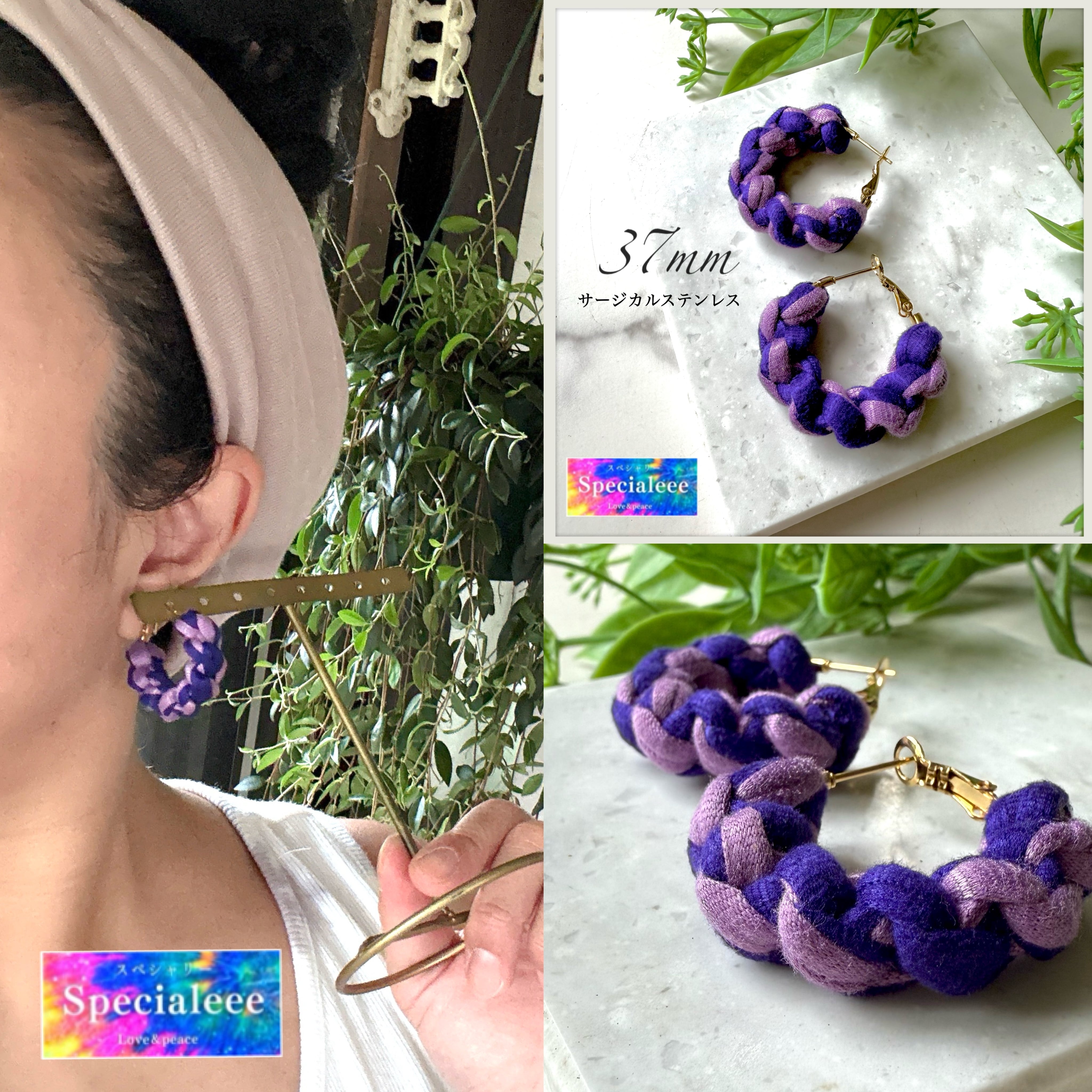 37mm★ダブルパープル極太編みフープピアス★インパクト★サージカルステンレス★カラフル★カラーアクセント★