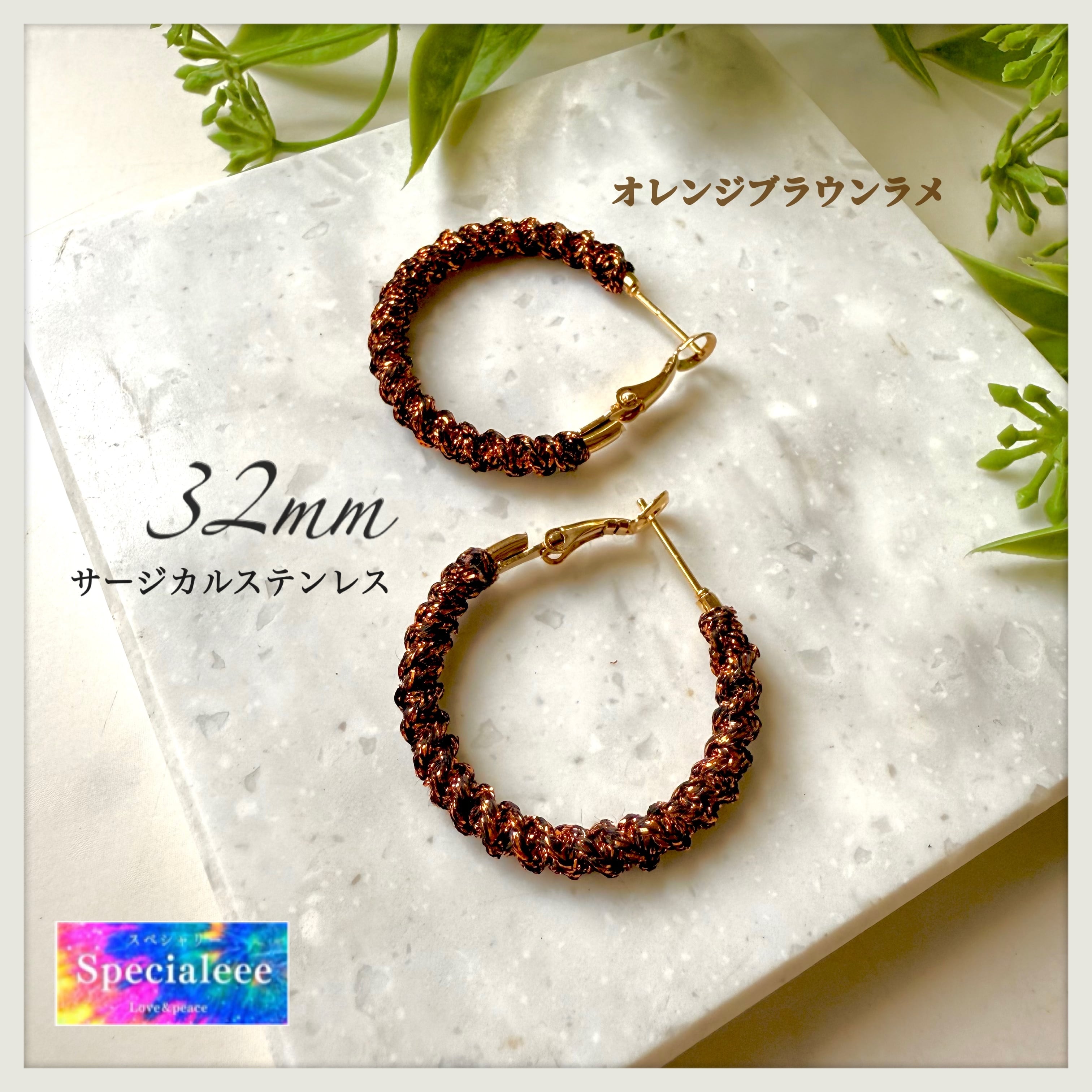 32mm★オレンジブラウンラメ編みフープピアス★サージカルステンレス★キラキラ茶色★お洒落カラー★存在感とインパクト★夏秋★