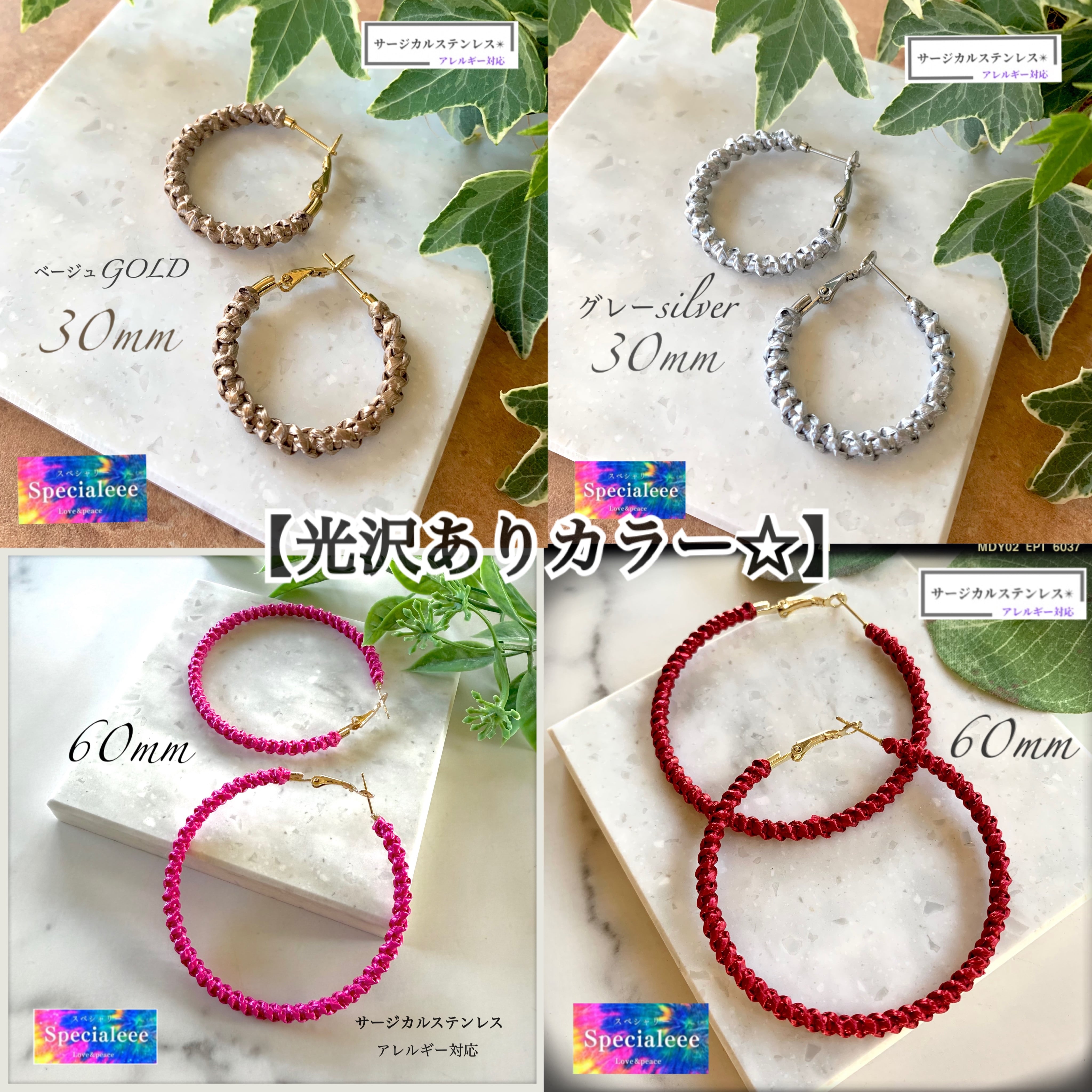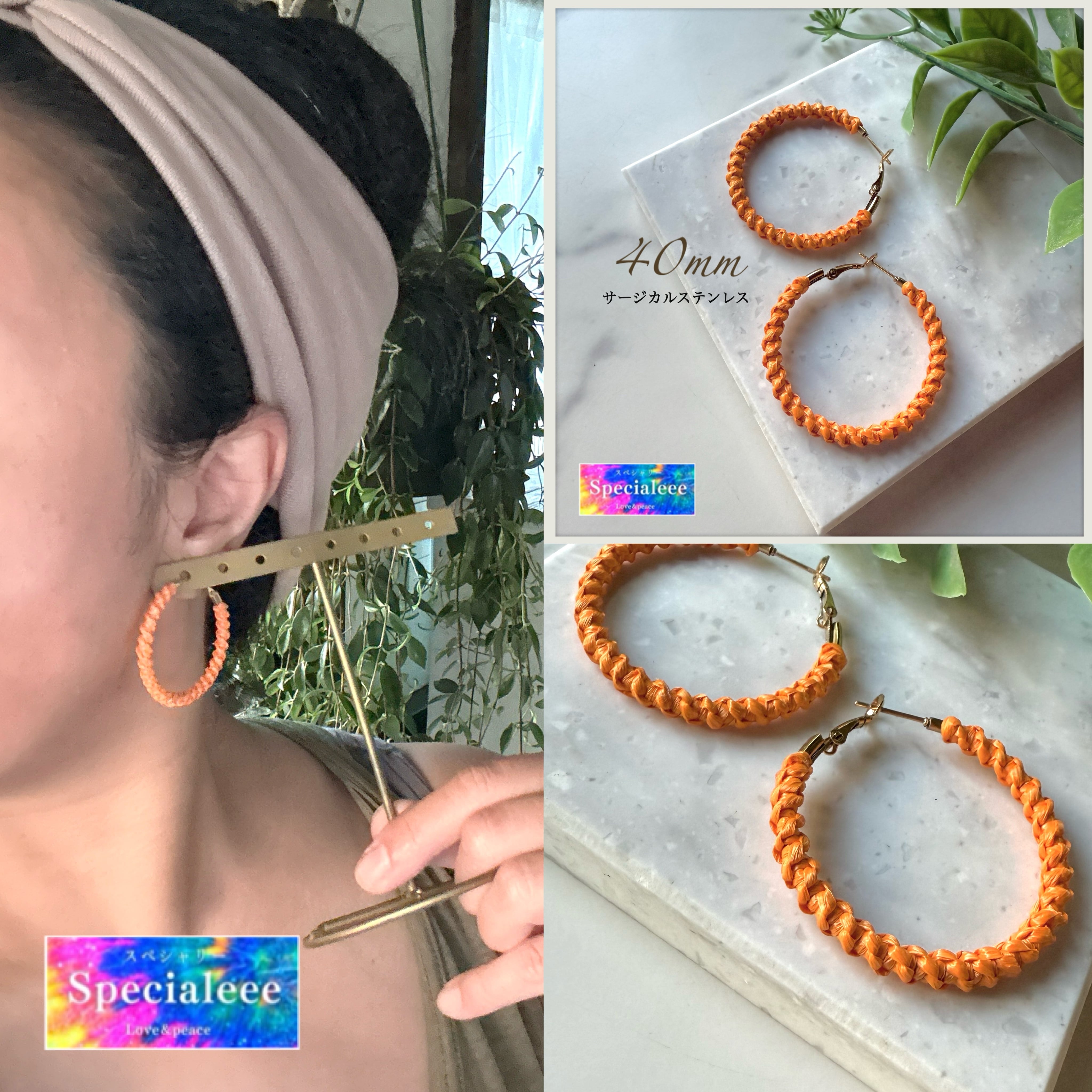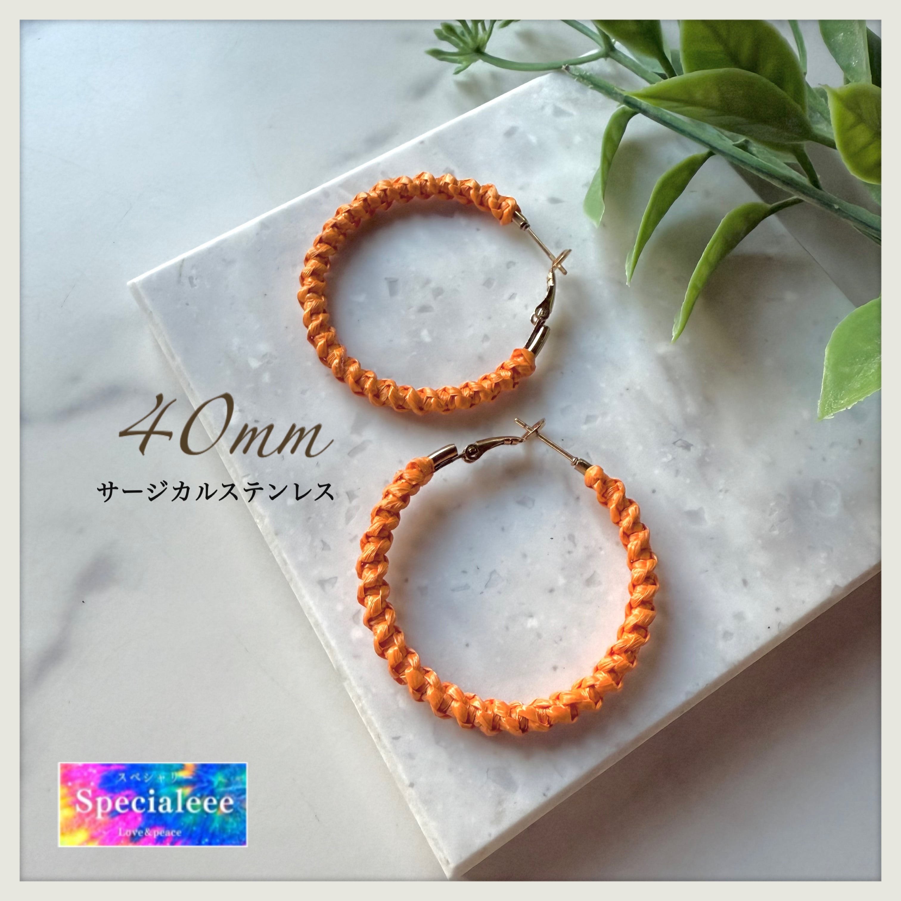 40mm★オレンジ編みフープピアス★サージカルステンレス★夏秋★レーヨン100%ナチュラル素材★
