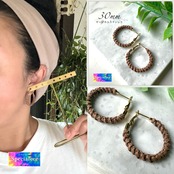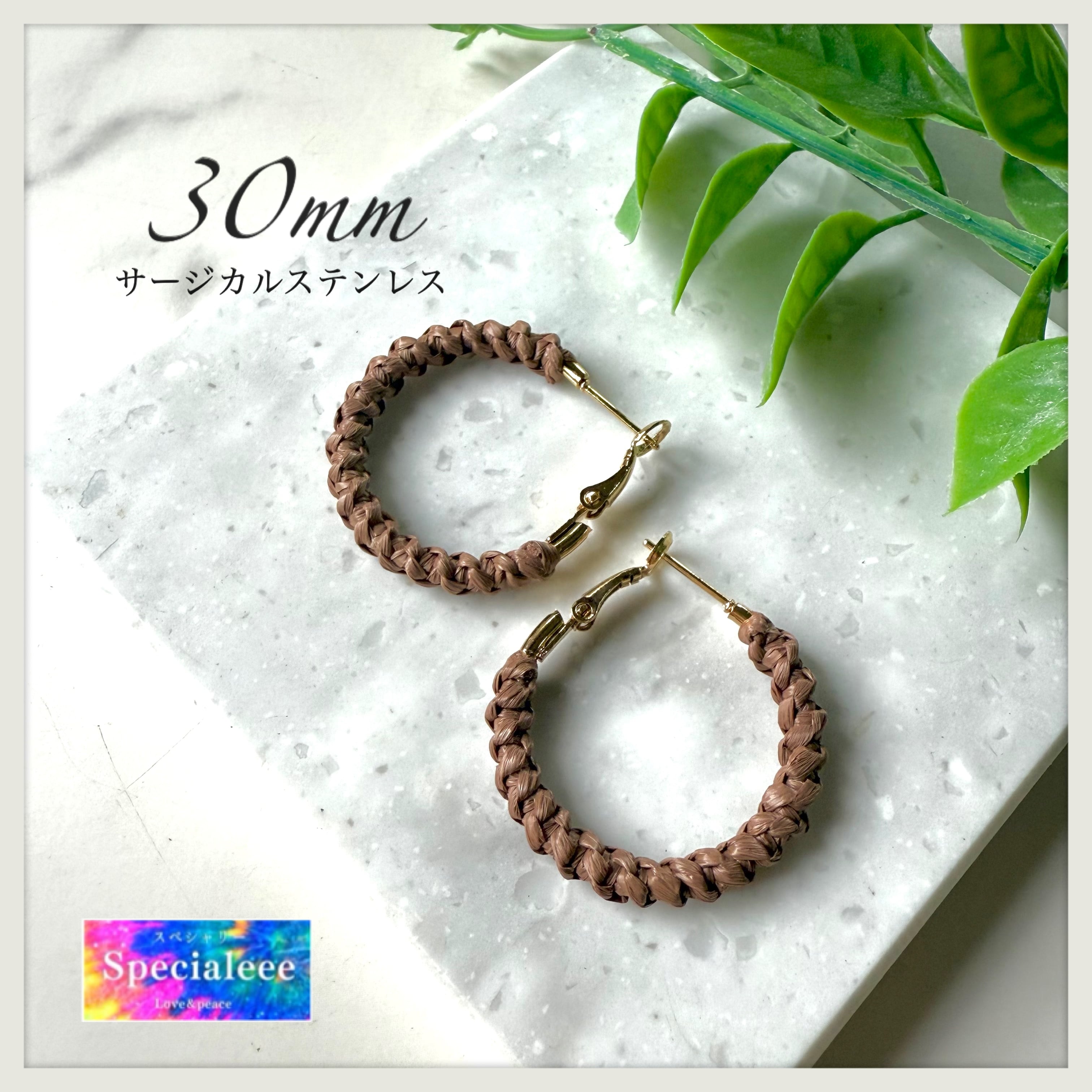 30mm★ブラウン編みフープピアス★サージカルステンレス★アレルギー対応★茶色★カラーピアス★レーヨン100%ナチュラル紐★