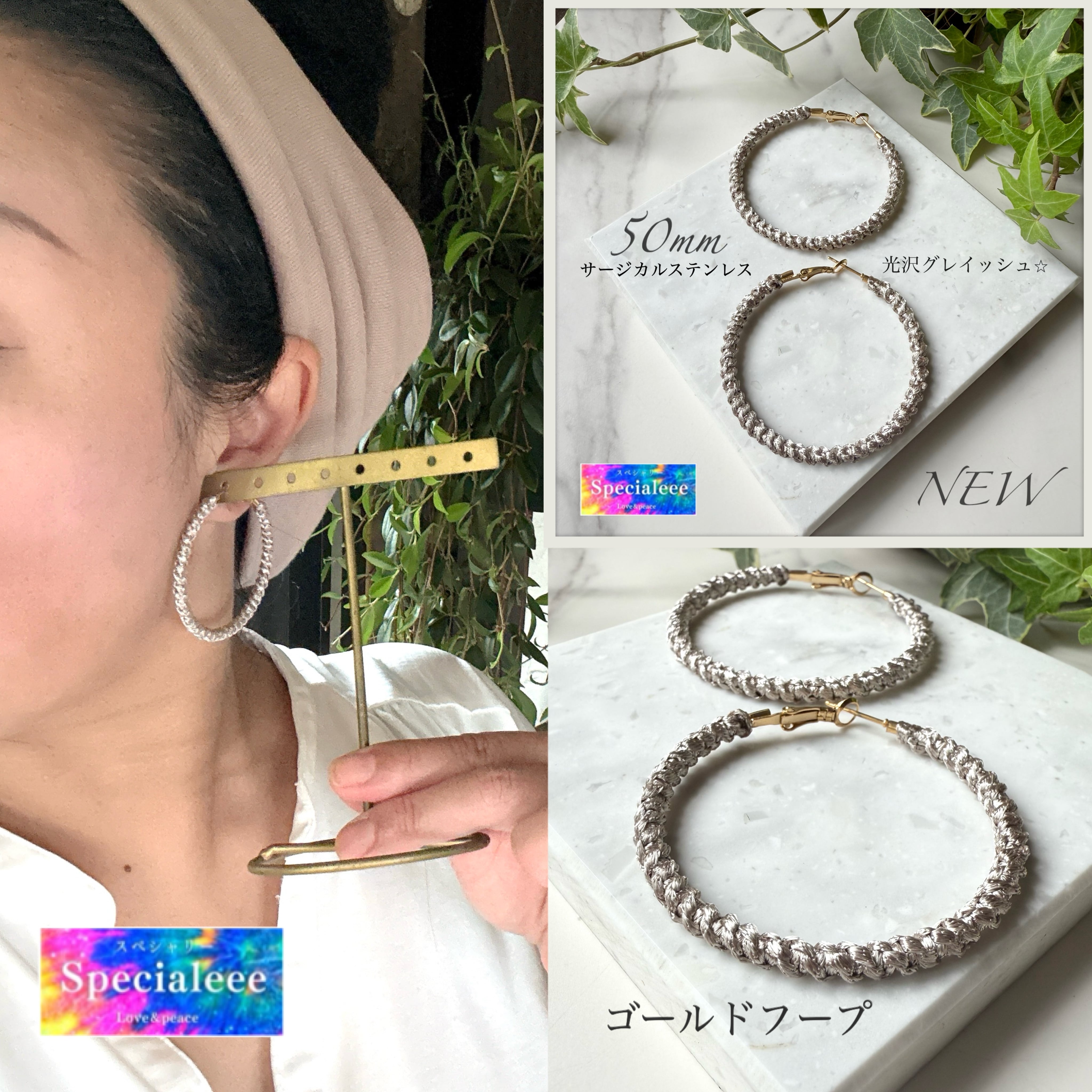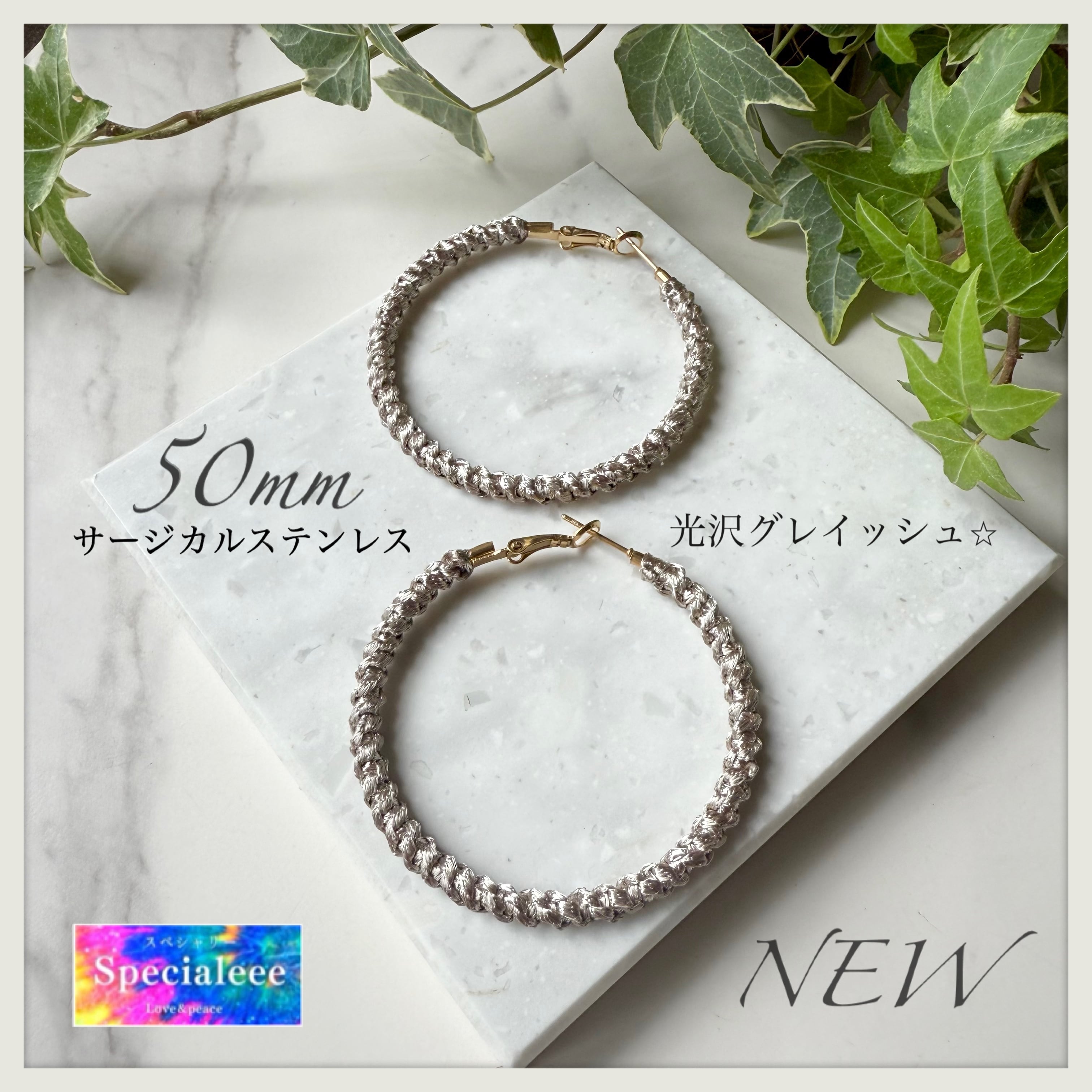 50mm★光沢グレイッシュ編みフープピアス★サージカルステンレスゴールド★大ぶり★お洒落カラー★存在感★