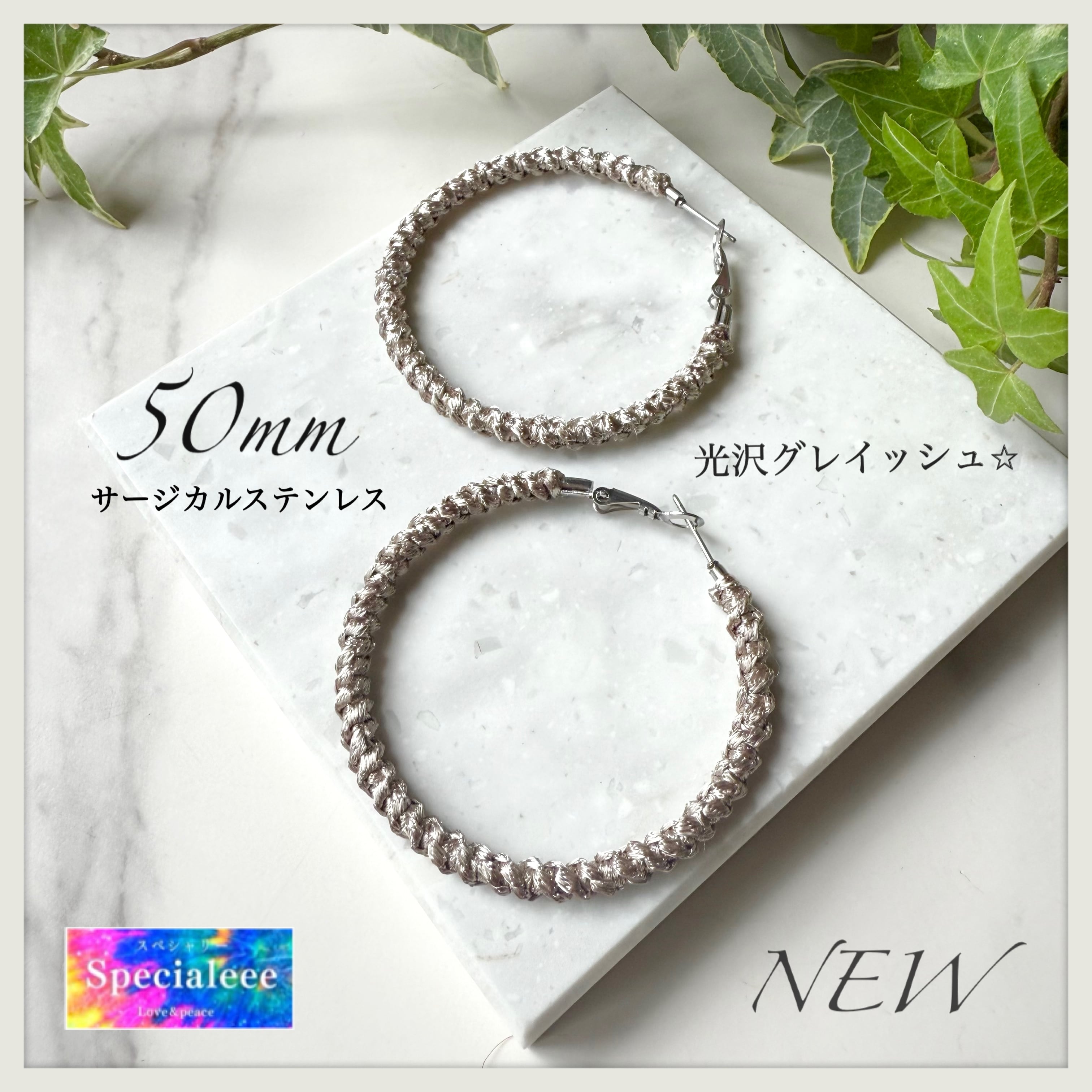 50mm★光沢グレイッシュ編みフープピアス★サージカルステンレスシルバーフープ★大ぶり★存在感★お洒落カラー★