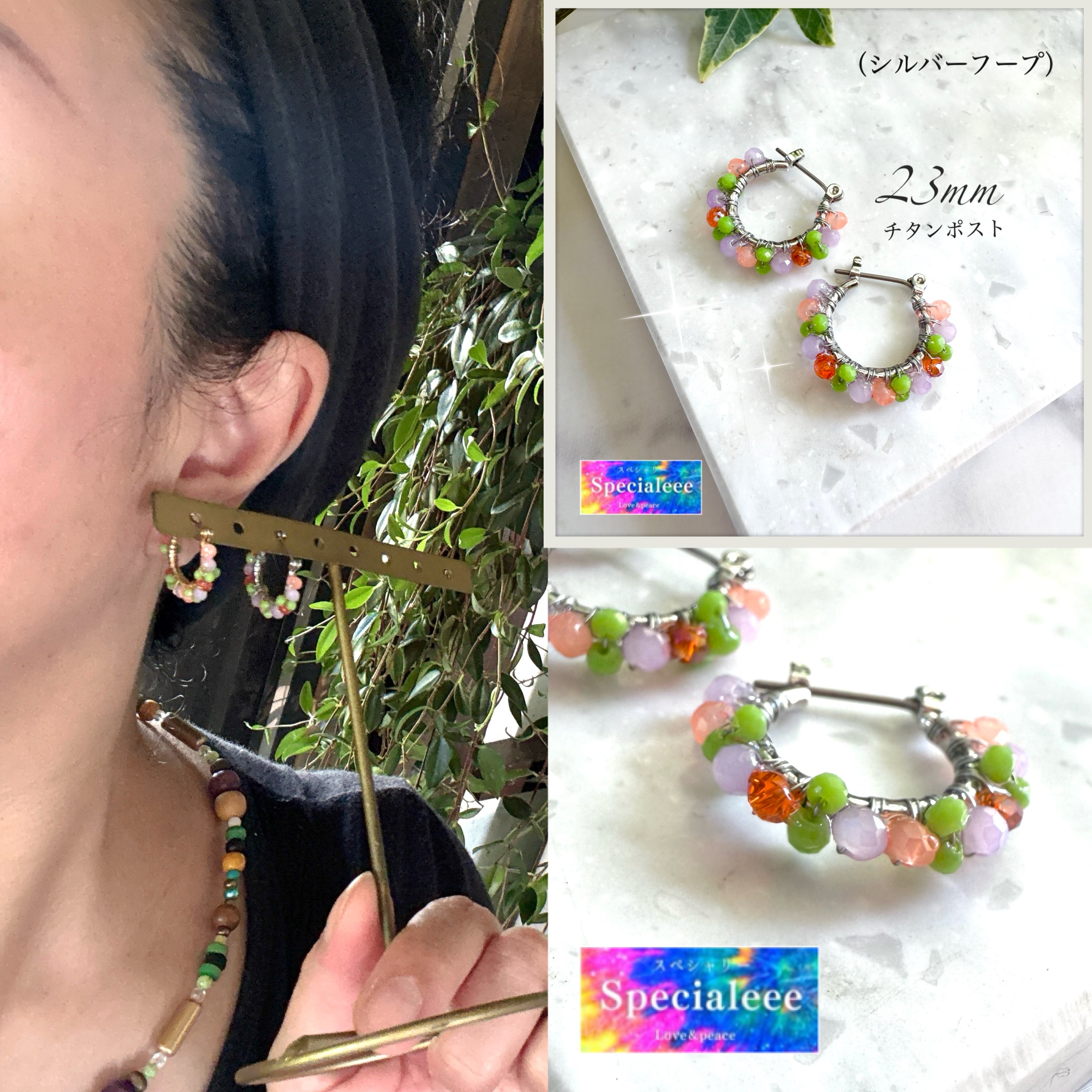 23mm★小さめでもお洒落カラフルフープピアス★チタンポスト★ゴールド★シルバーもok★キラキラビーズ★