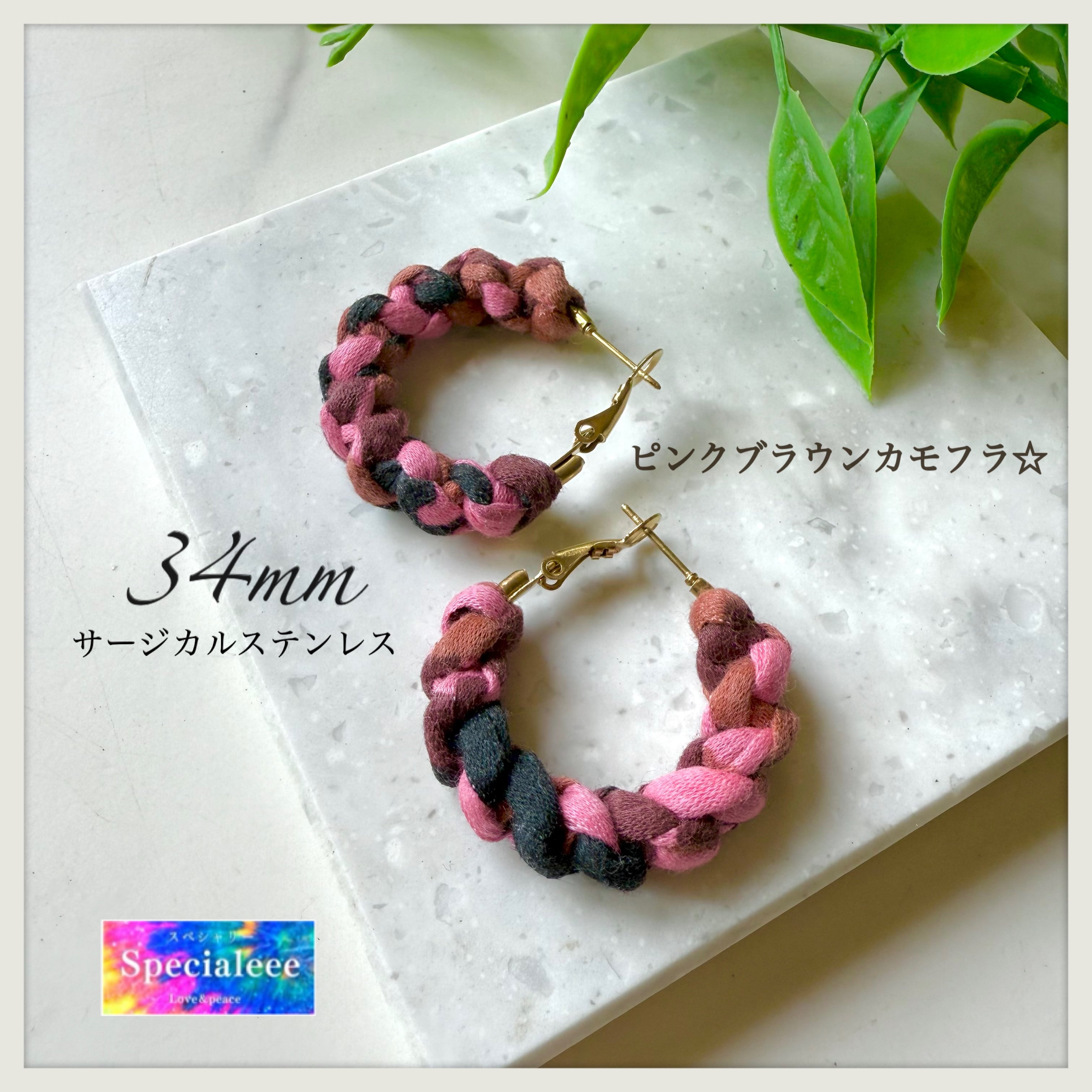 34mm★ピンクブラウン太編みフープピアス★カモフラ★サージカルステンレス★お洒落★