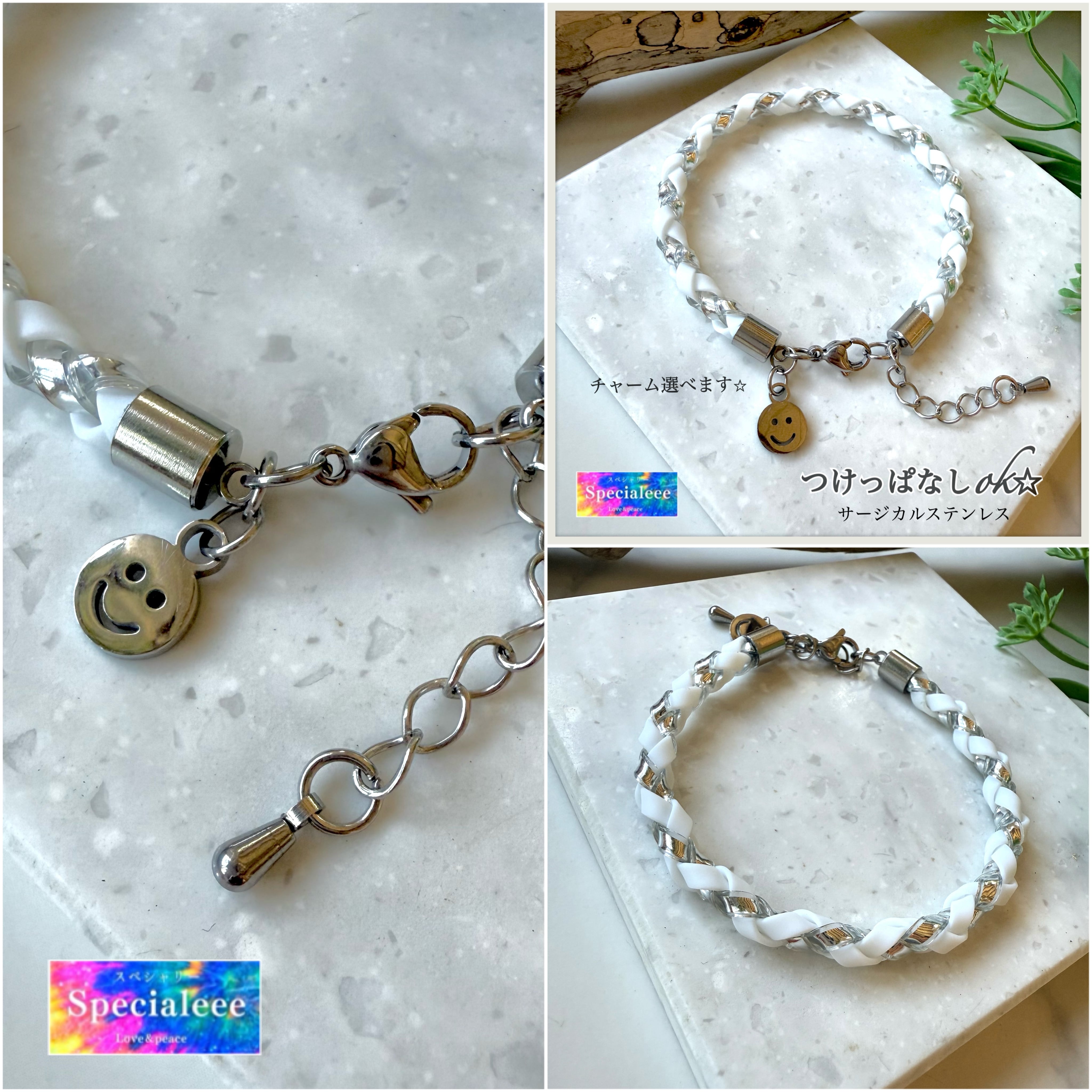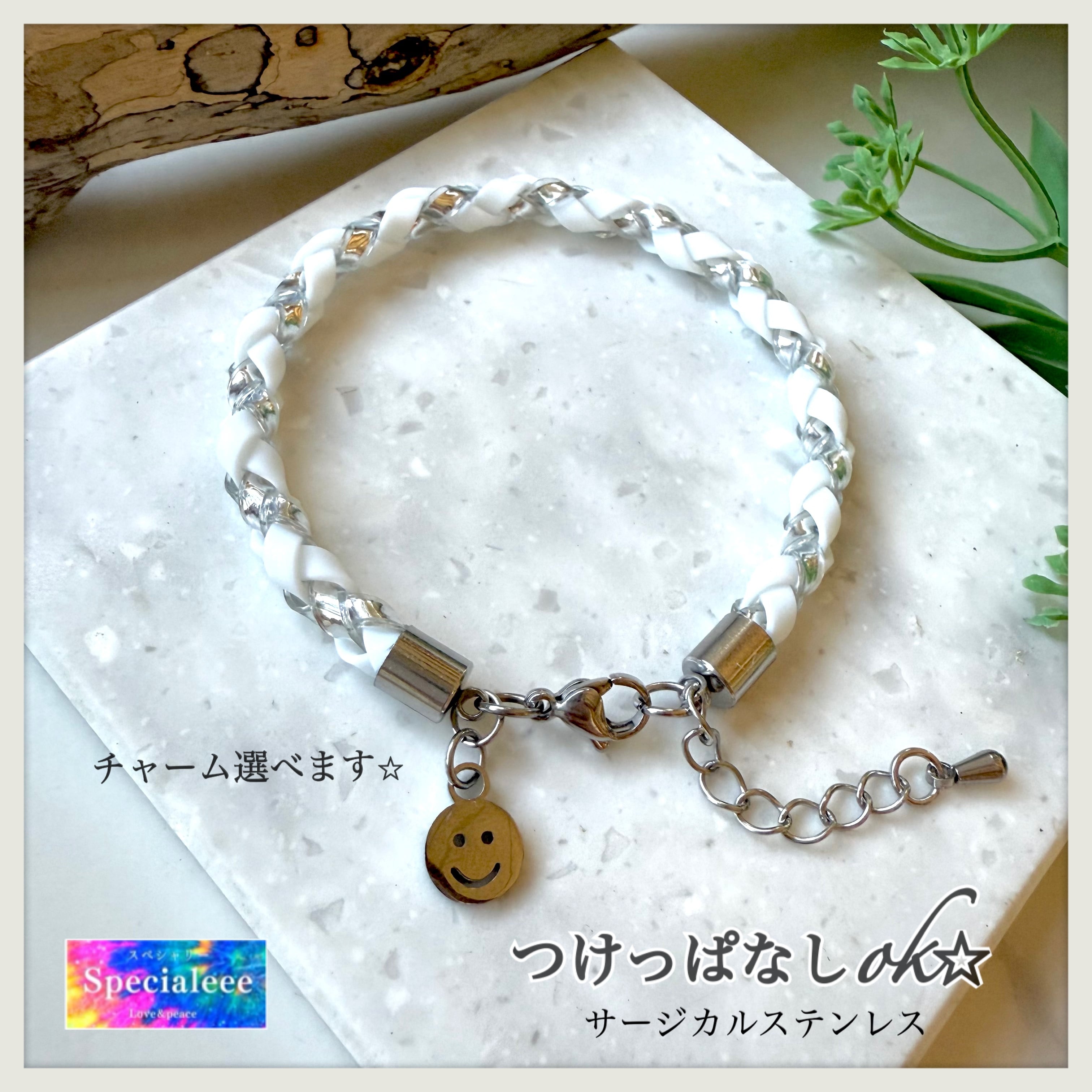 つけっぱなしok★白&メタリックシルバー編み防水ブレスレット★選べるチャーム★