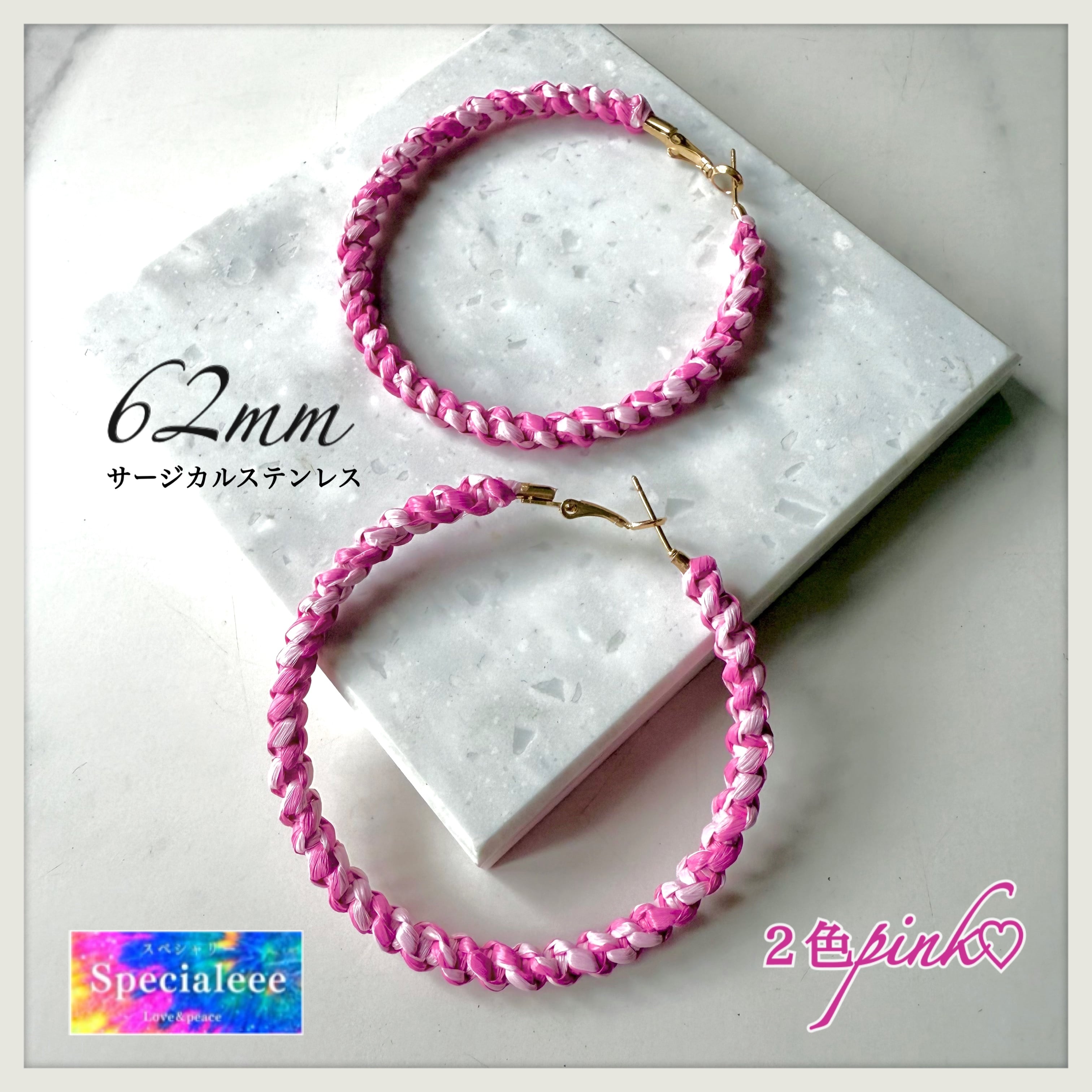 62mm★2色ピンク編みフープピアス★サージカルステンレス★PINK★カラフルカラーピアス★大ぶり★サイズ変更可★