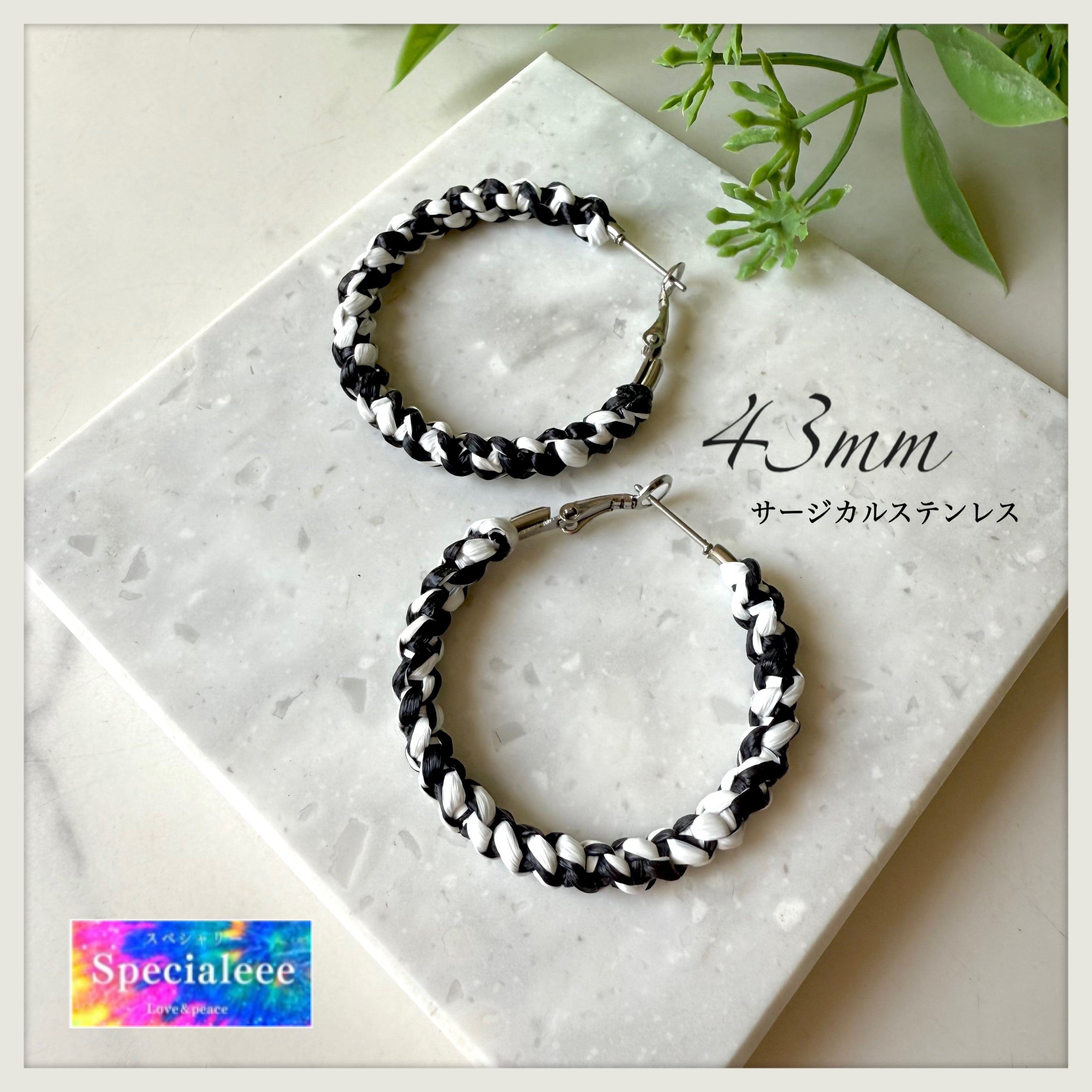 43mm★白黒2色ミックス編みフープピアス★サージカルステンレス★ブラックホワイト★モノトーン★モノクロ★
