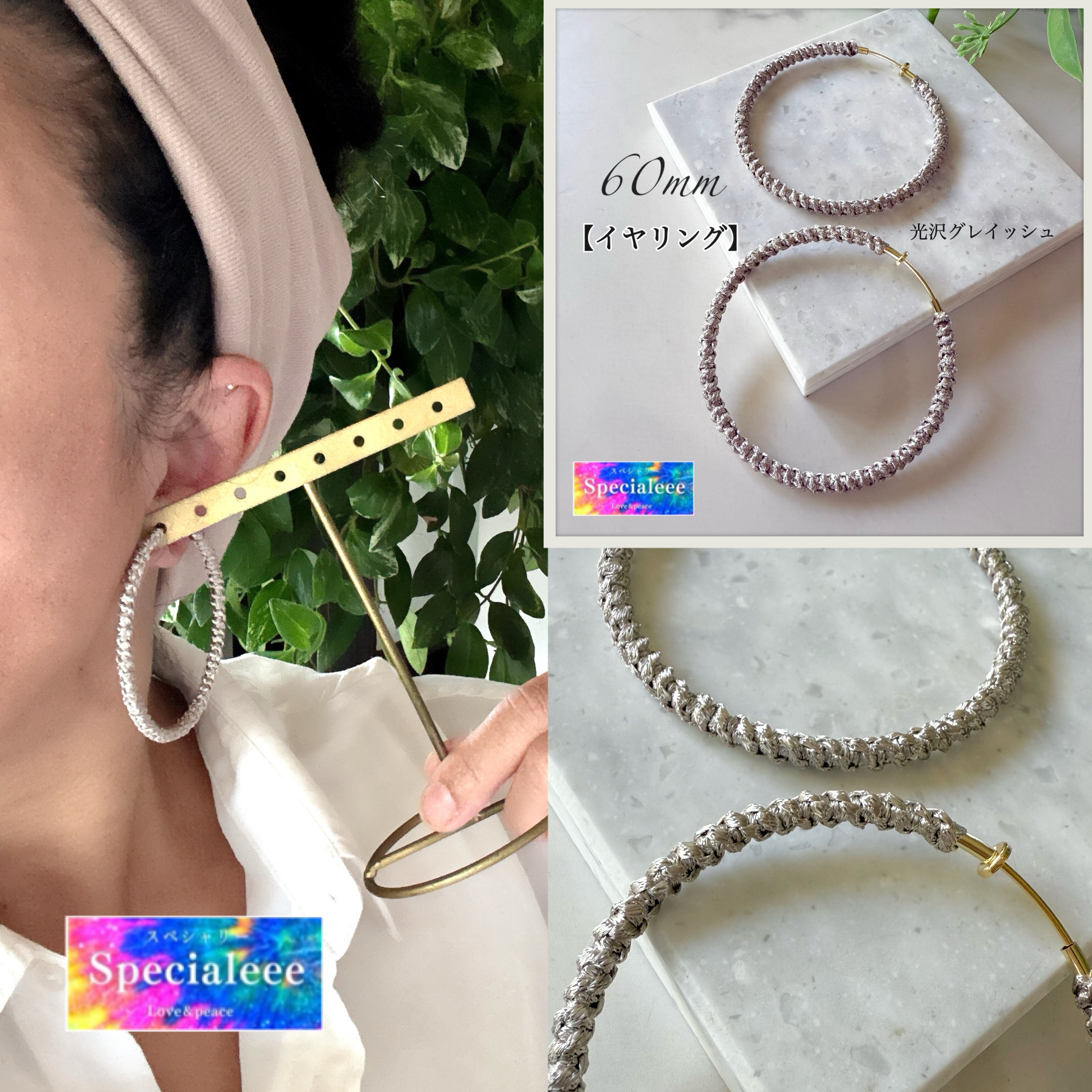 【イヤリングページ】60mm★光沢グレイッシュ編みフープイヤリング★お洒落カラー★存在感★穴なし★ピアスに見える★