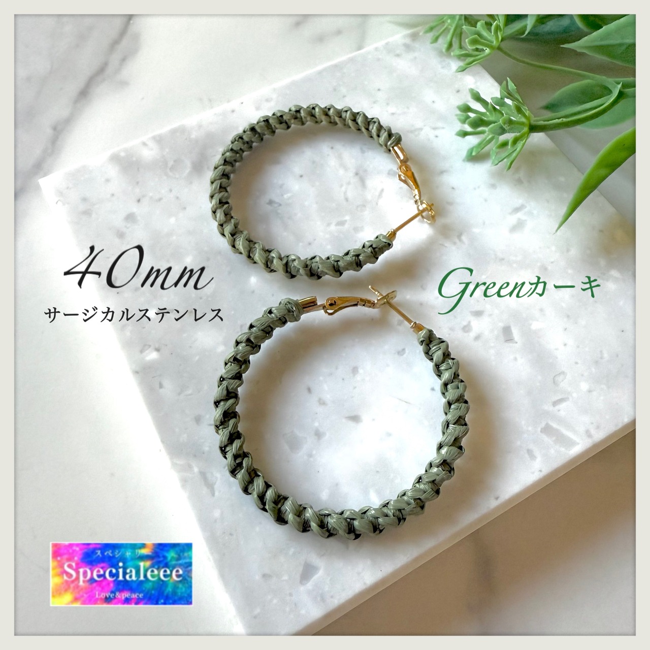 40mm★NEW★グリーンカーキ編みフープピアス★サージカルステンレス★オリーブ★秋冬★