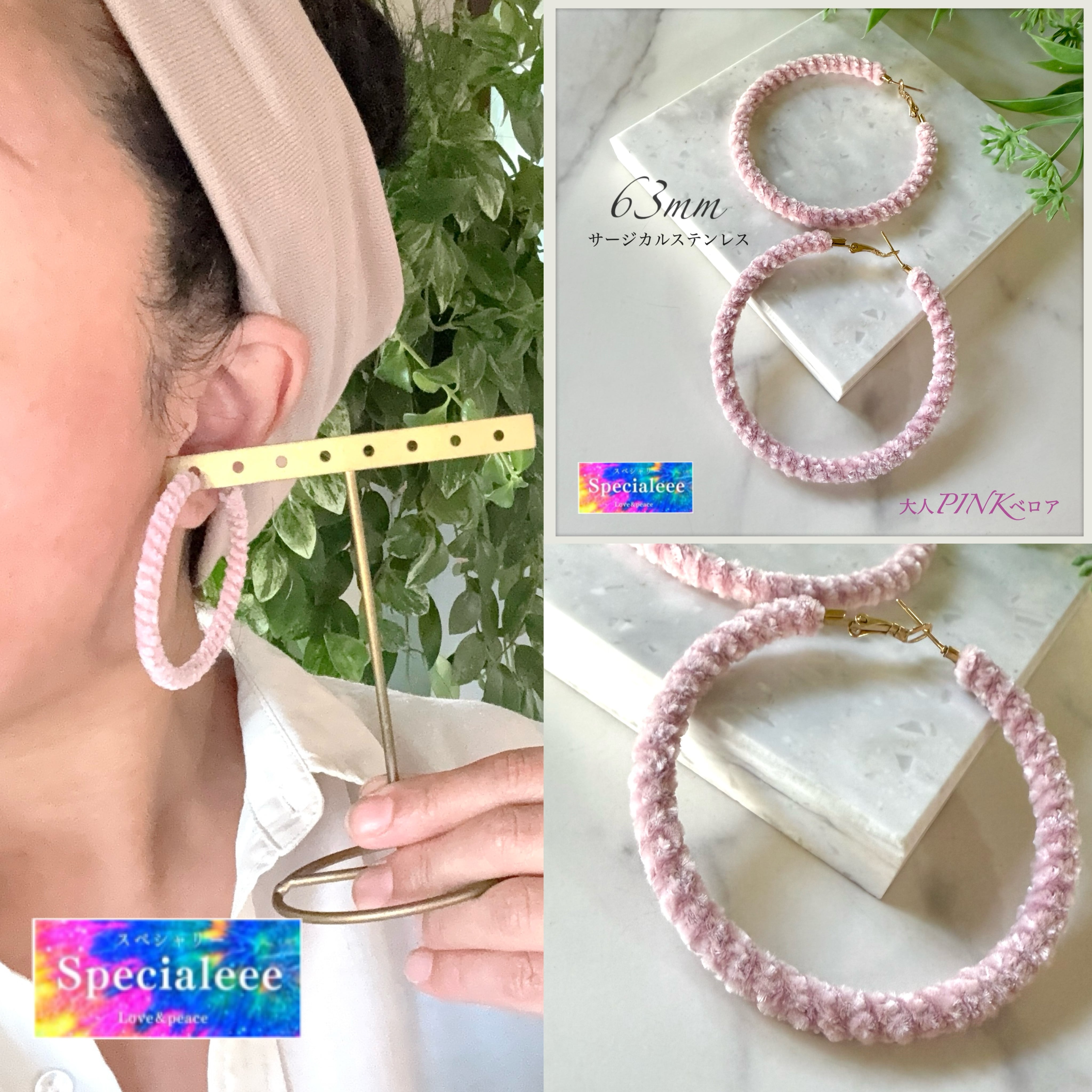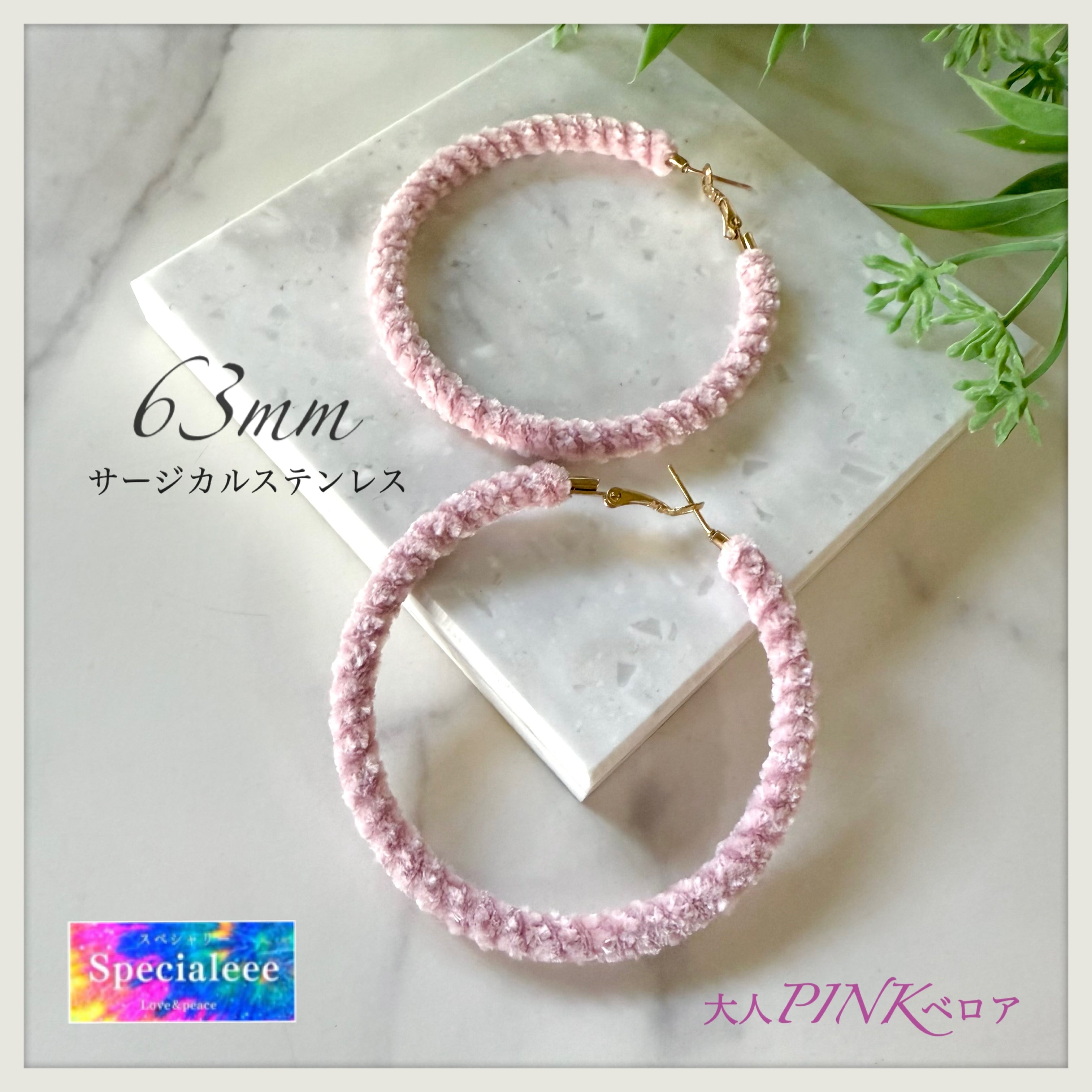63mm★大人ピンクふわふわベロア編みフープピアス★アレルギー対応★サージカルステンレス★大ぶりサイズ★PINK★秋冬★お洒落で可愛い★イヤリング+¥200★