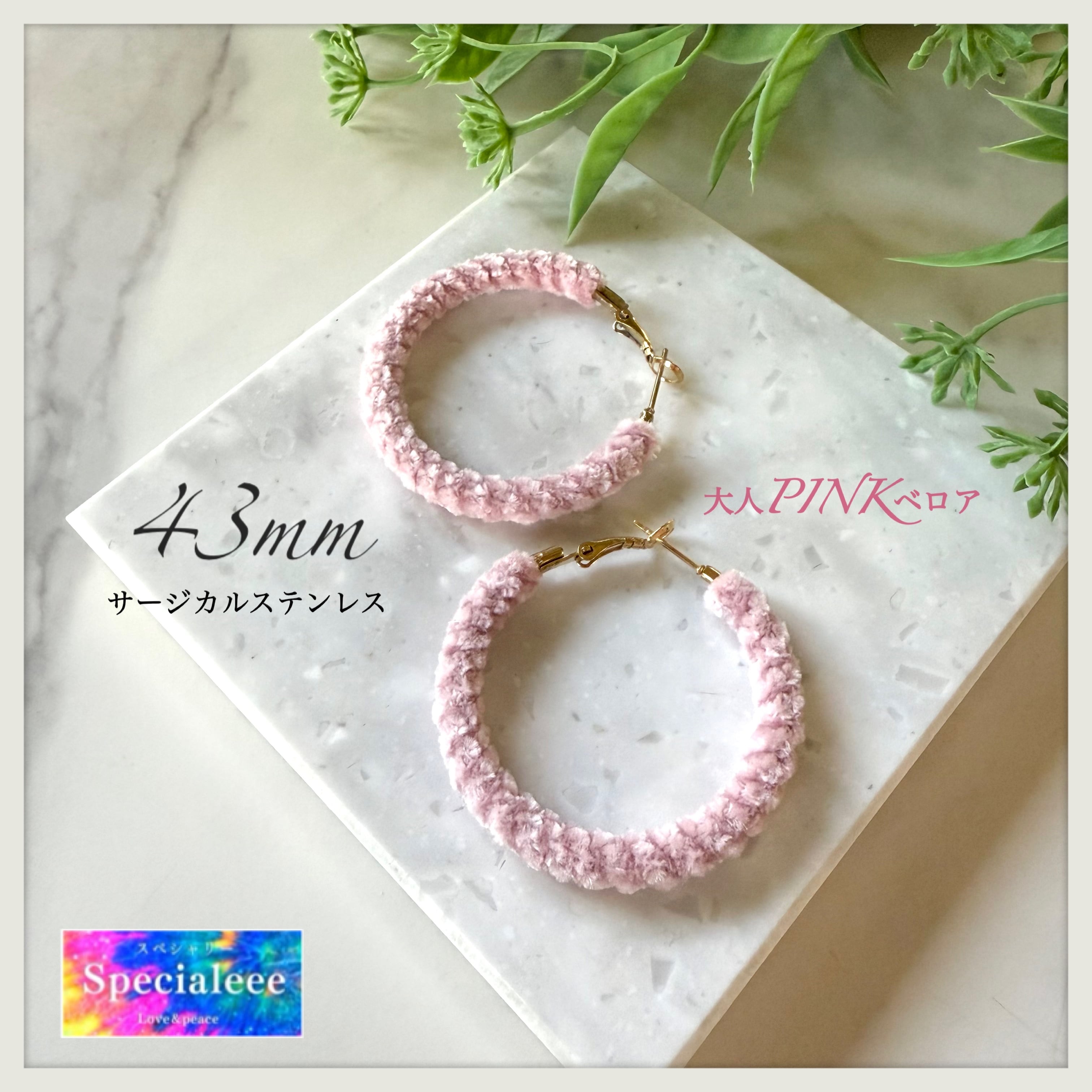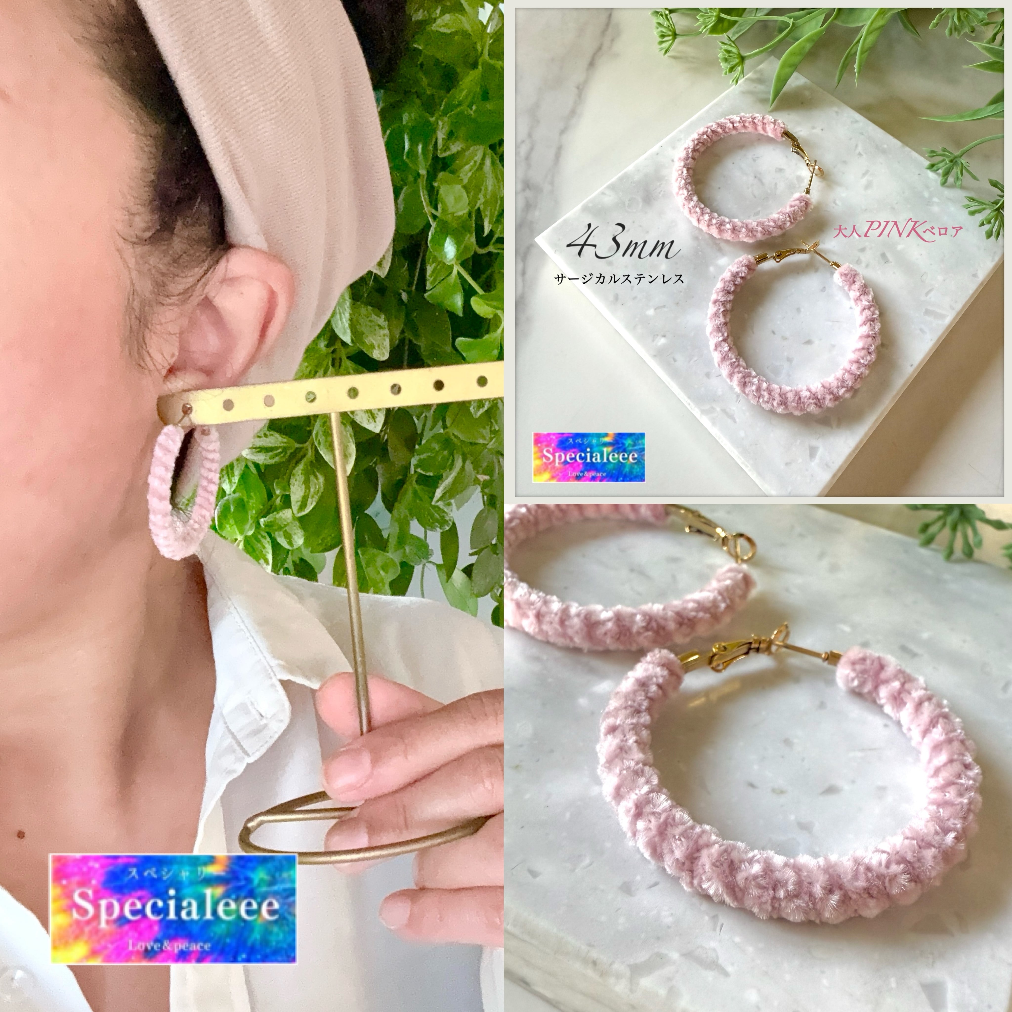 43mm★秋冬可愛い大人ピンクふわふわベロア編みフープピアス★アレルギー対応★サージカルステンレス★大人pink★お洒落★もこもこ★イヤリング+¥200