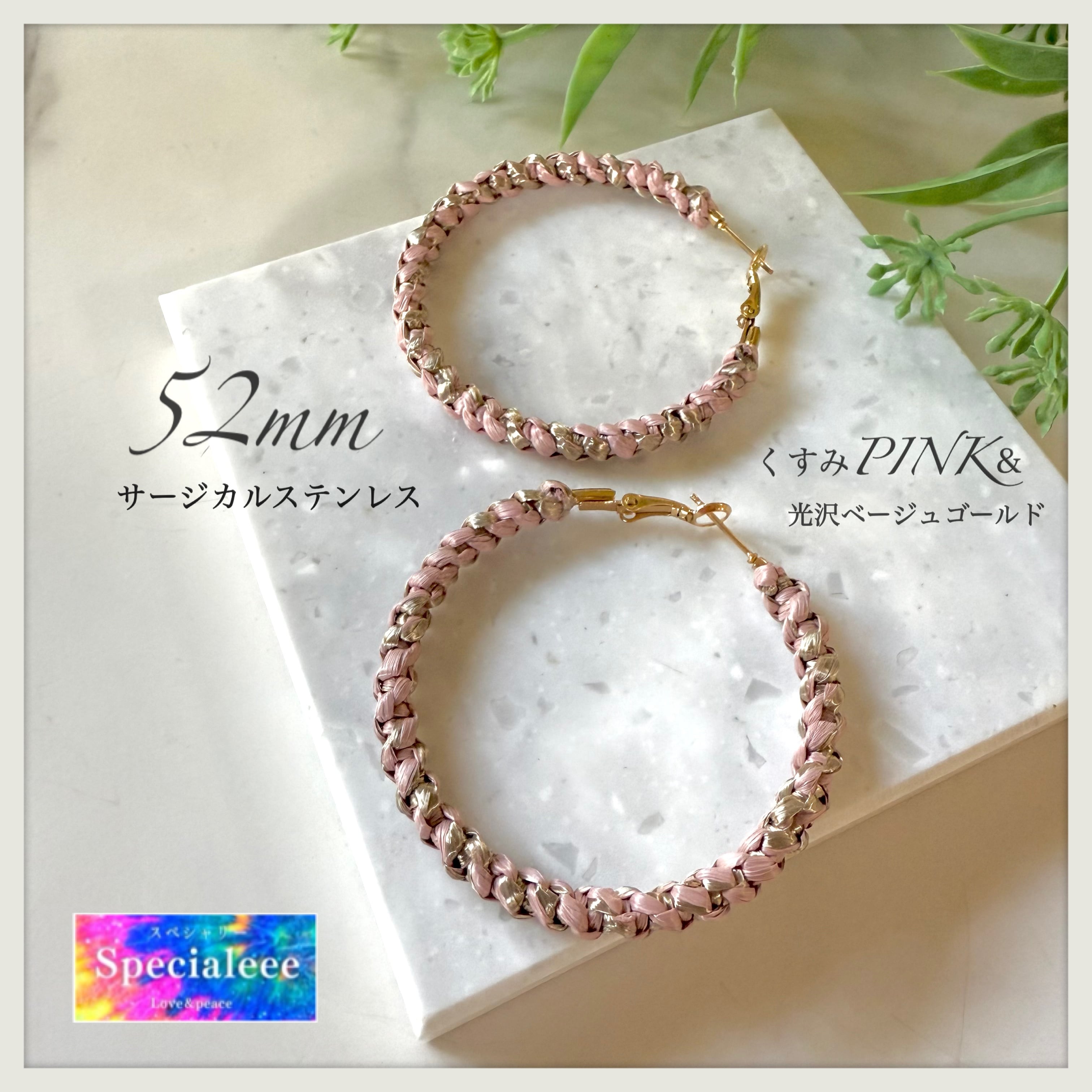 52mm★大人くすみピンク&光沢ベージュゴールドmix編みフープピアス★秋冬★個性的お洒落★アレルギー対応★サージカルステンレス★