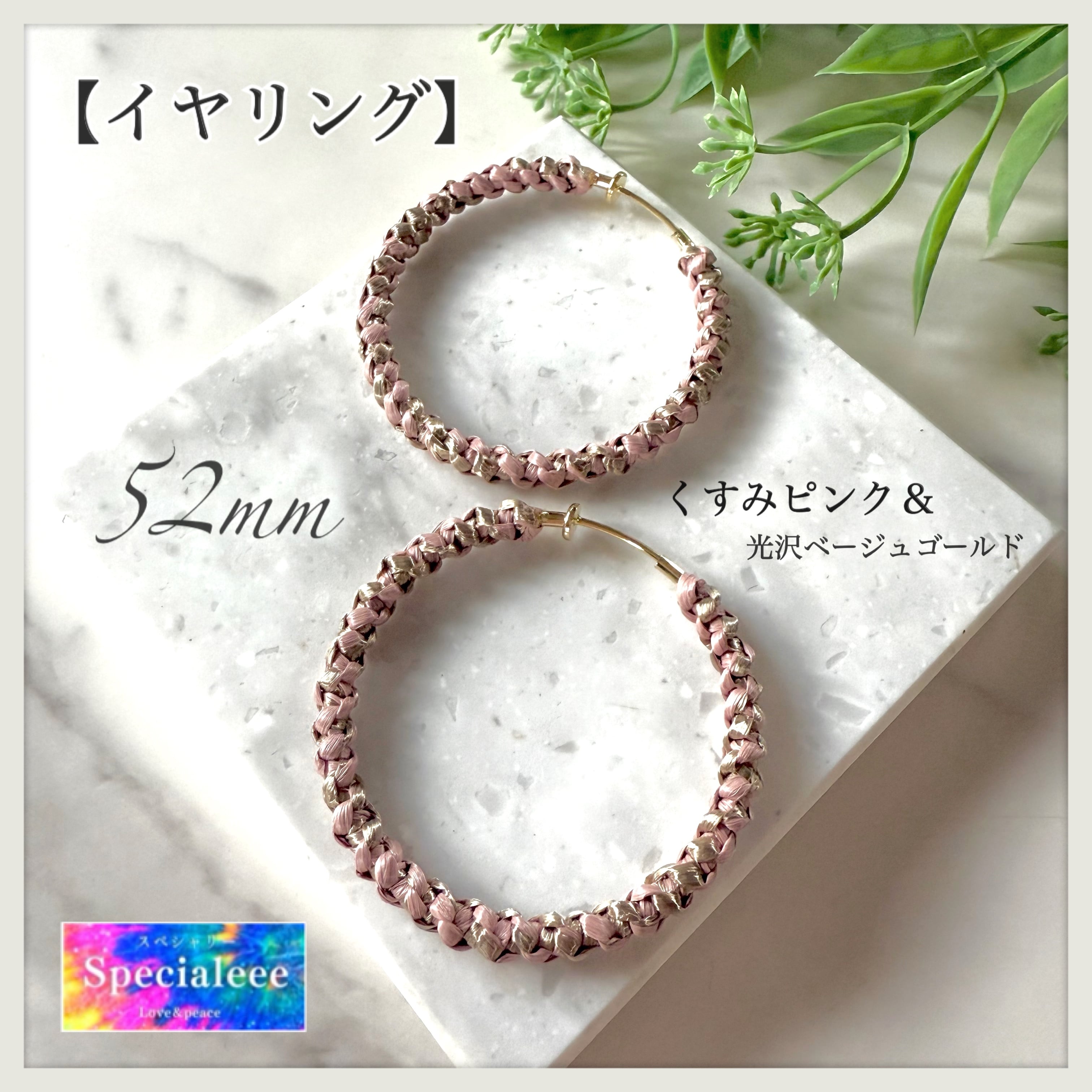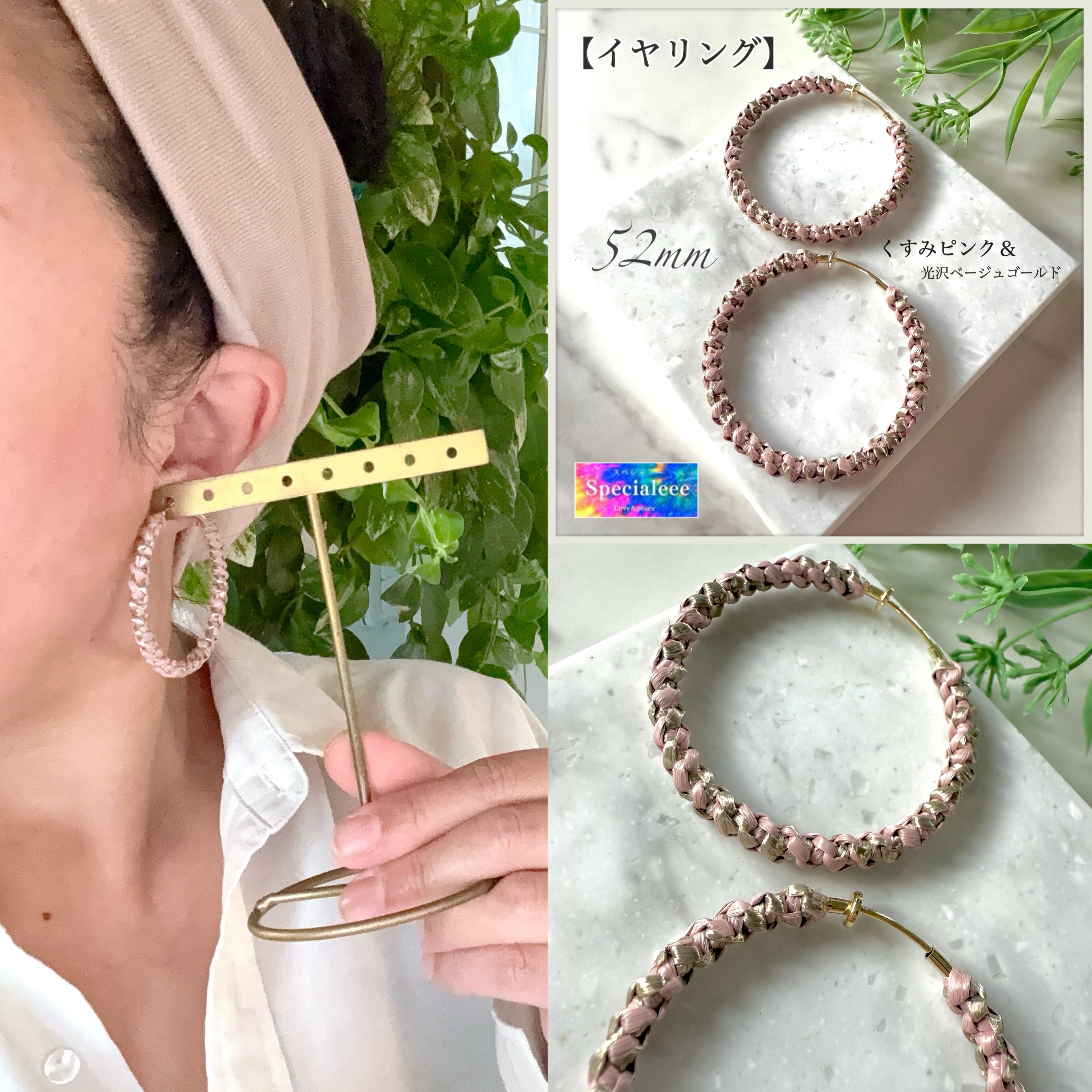 【イヤリングページ】52mm★大人くすみピンク&メタリック光沢ベージュゴールドmix編みフープイヤリング★ピアスに見える★軽い★秋冬お洒落カラー★グレイッシュ★