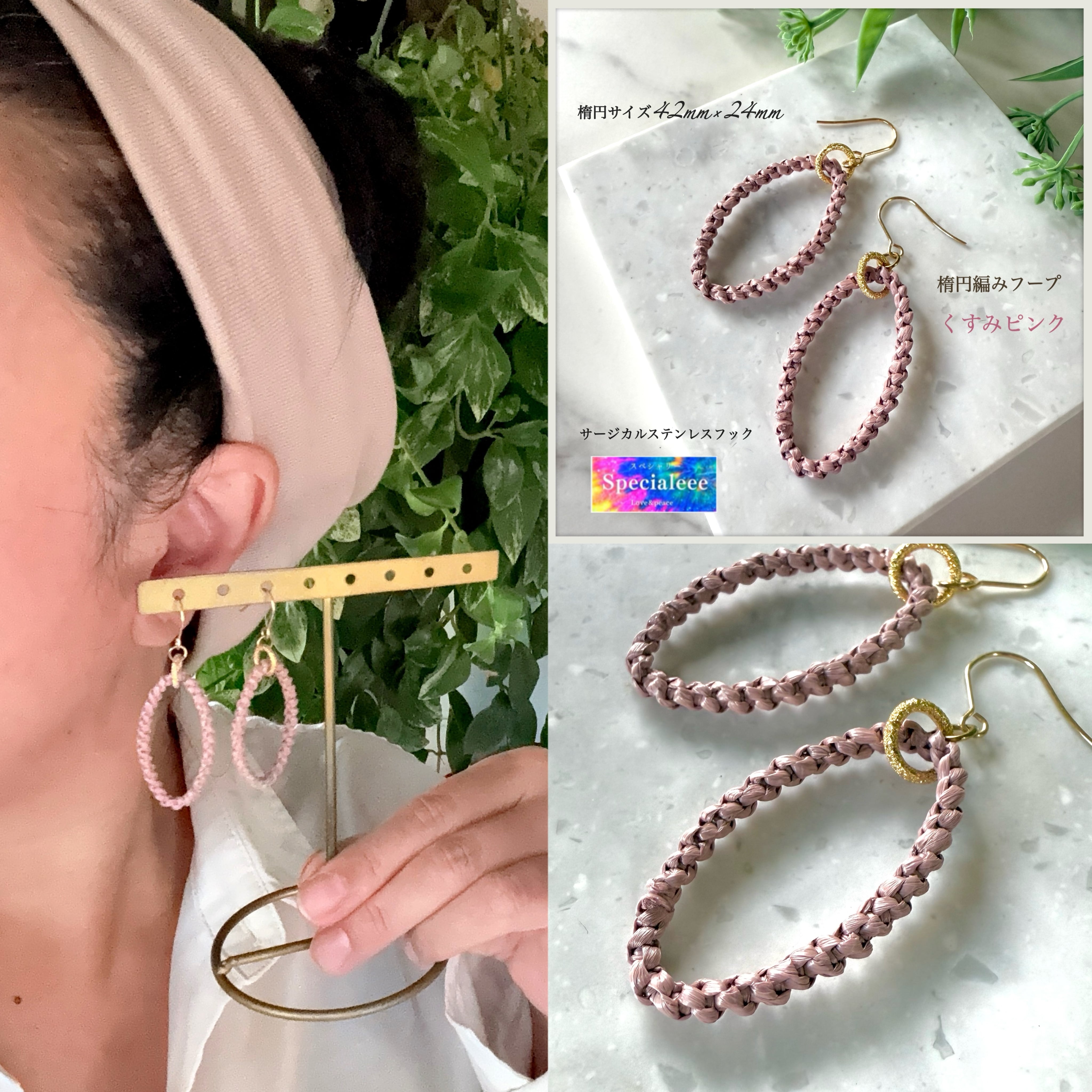 楕円編み揺れるフープピアス★秋冬くすみピンク★サージカルフック★イヤリング無料★オーバル★お洒落カラー★軽い★