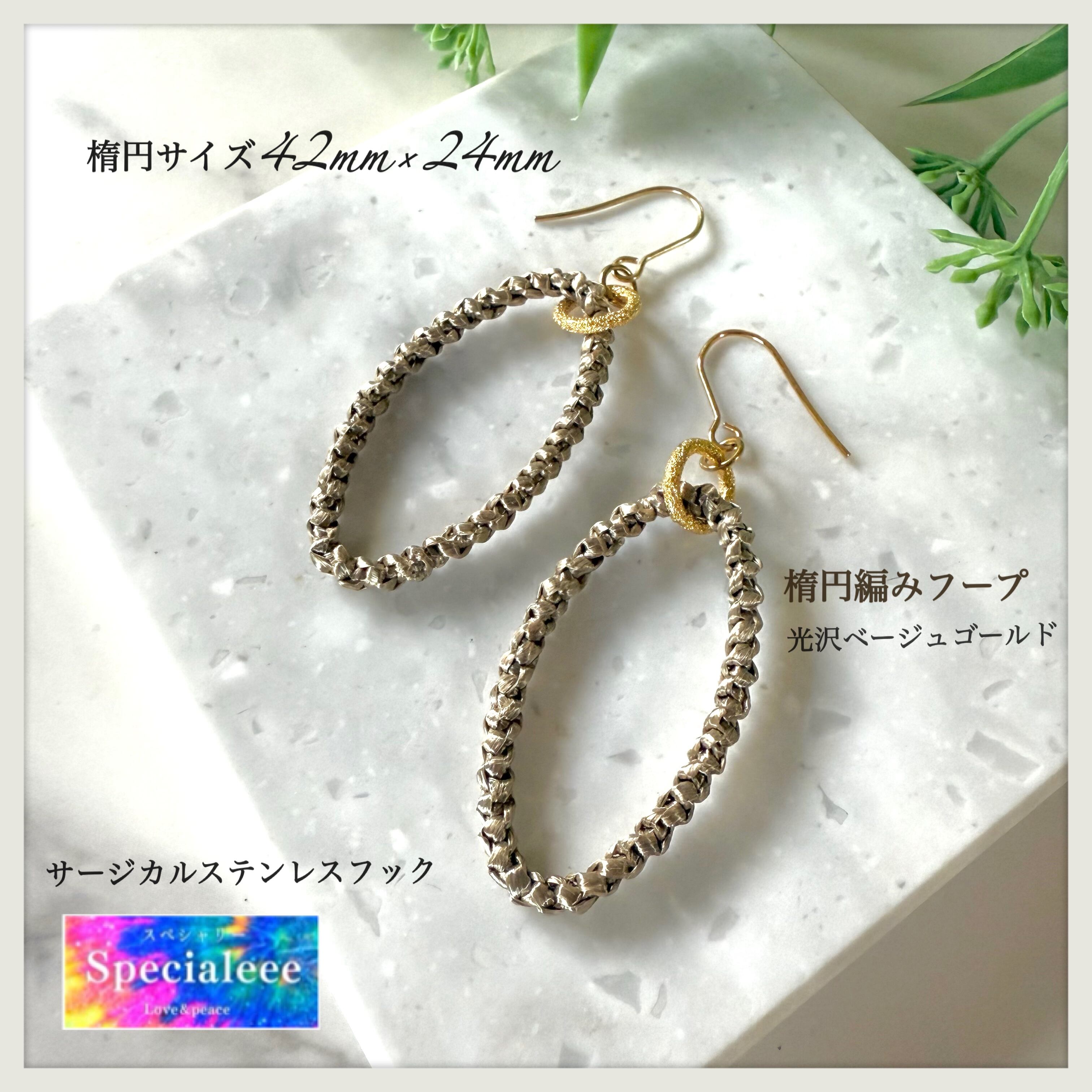楕円編みフープ揺れるロングピアス★光沢メタリックベージュゴールド編み★サージカルフック★アレルギー対応★お洒落★秋冬★イヤリング無料付け替え★