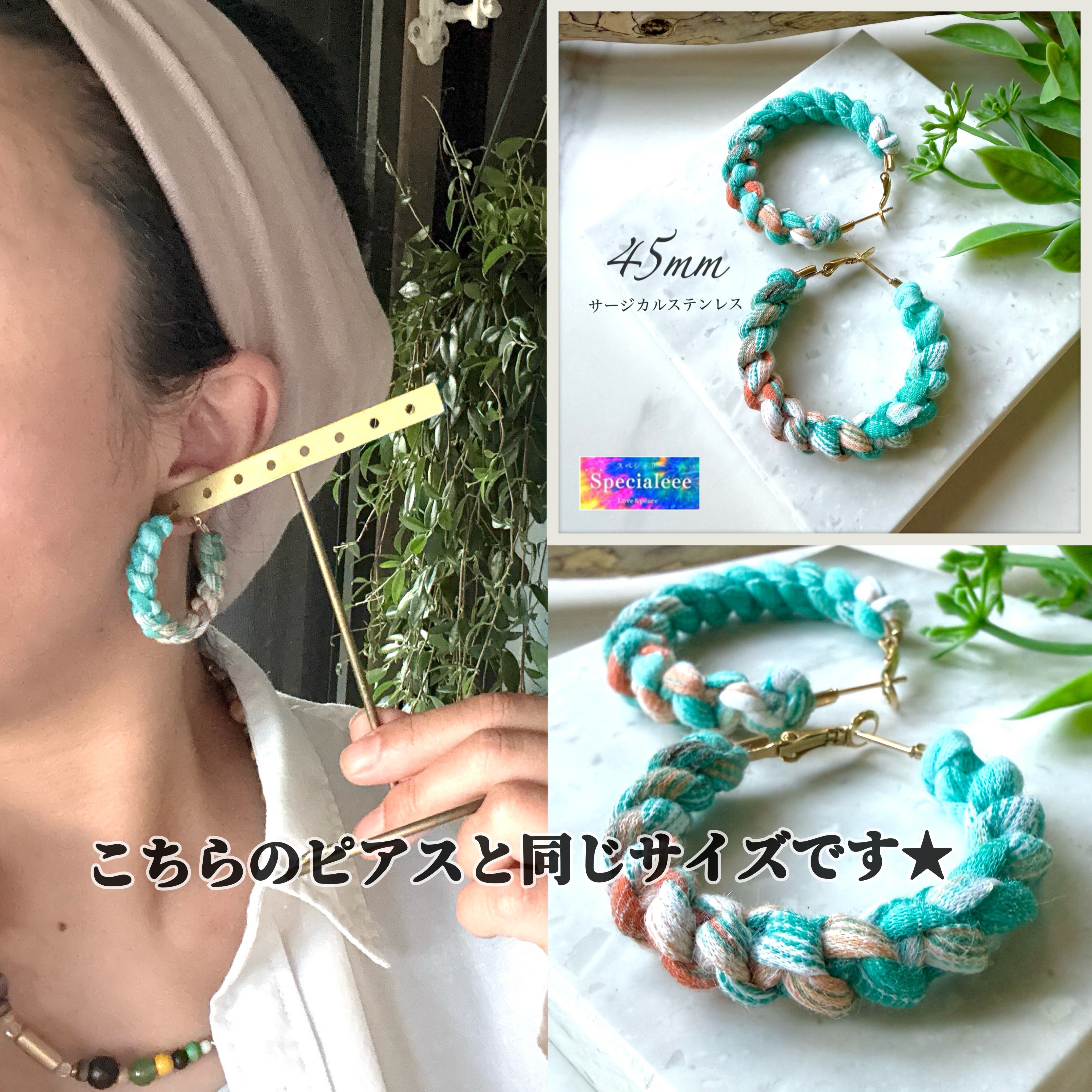 【イヤリングページ】45mm★ターコイズ系グリーン&オレンジ編みフープイヤリング★秋冬可愛い★大ぶりでも軽い★