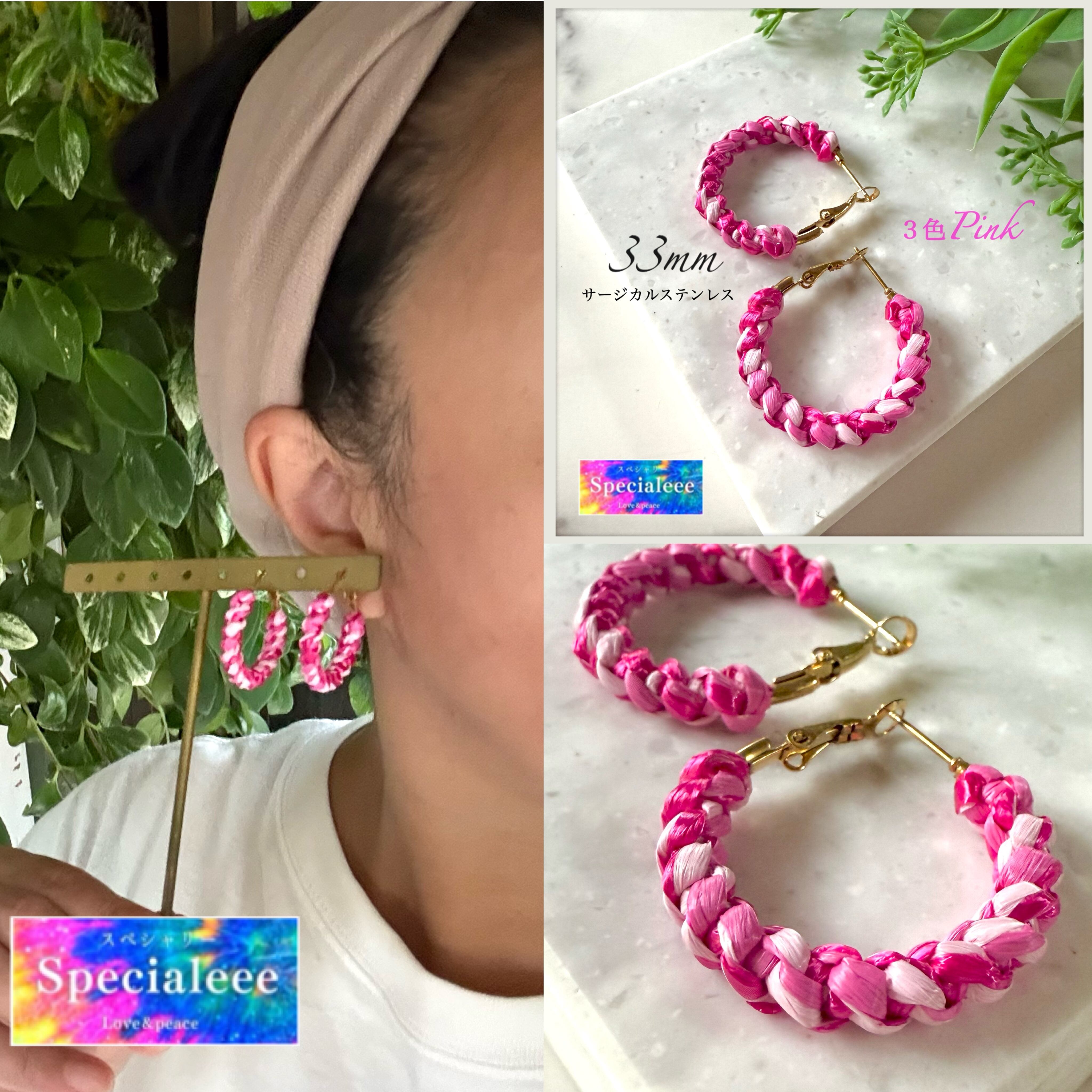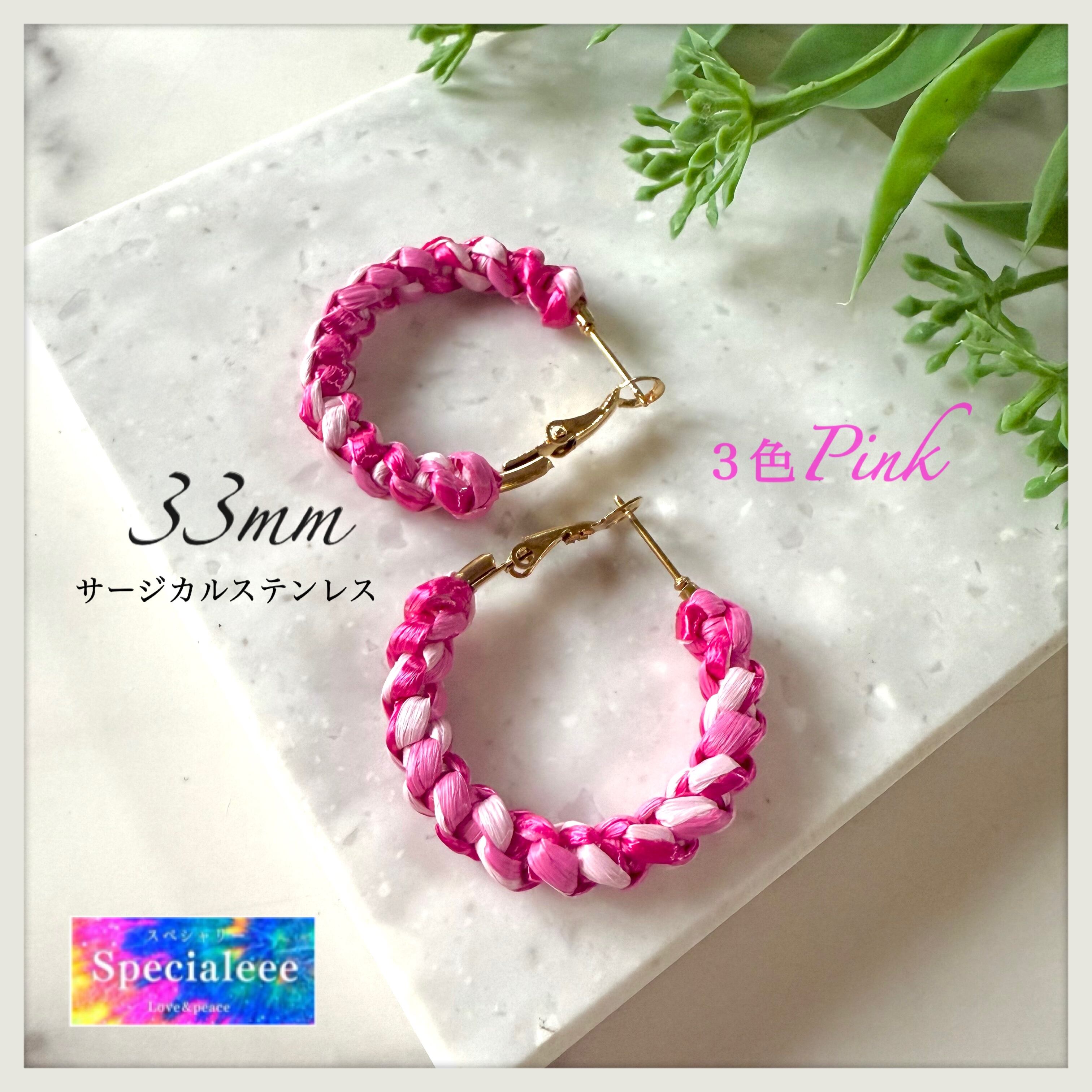 33mm★3色ピンク編みフープピアス★アレルギー対応サージカルステンレス★派手可愛いカラー★ショッキングピンク★ネオンピンク★