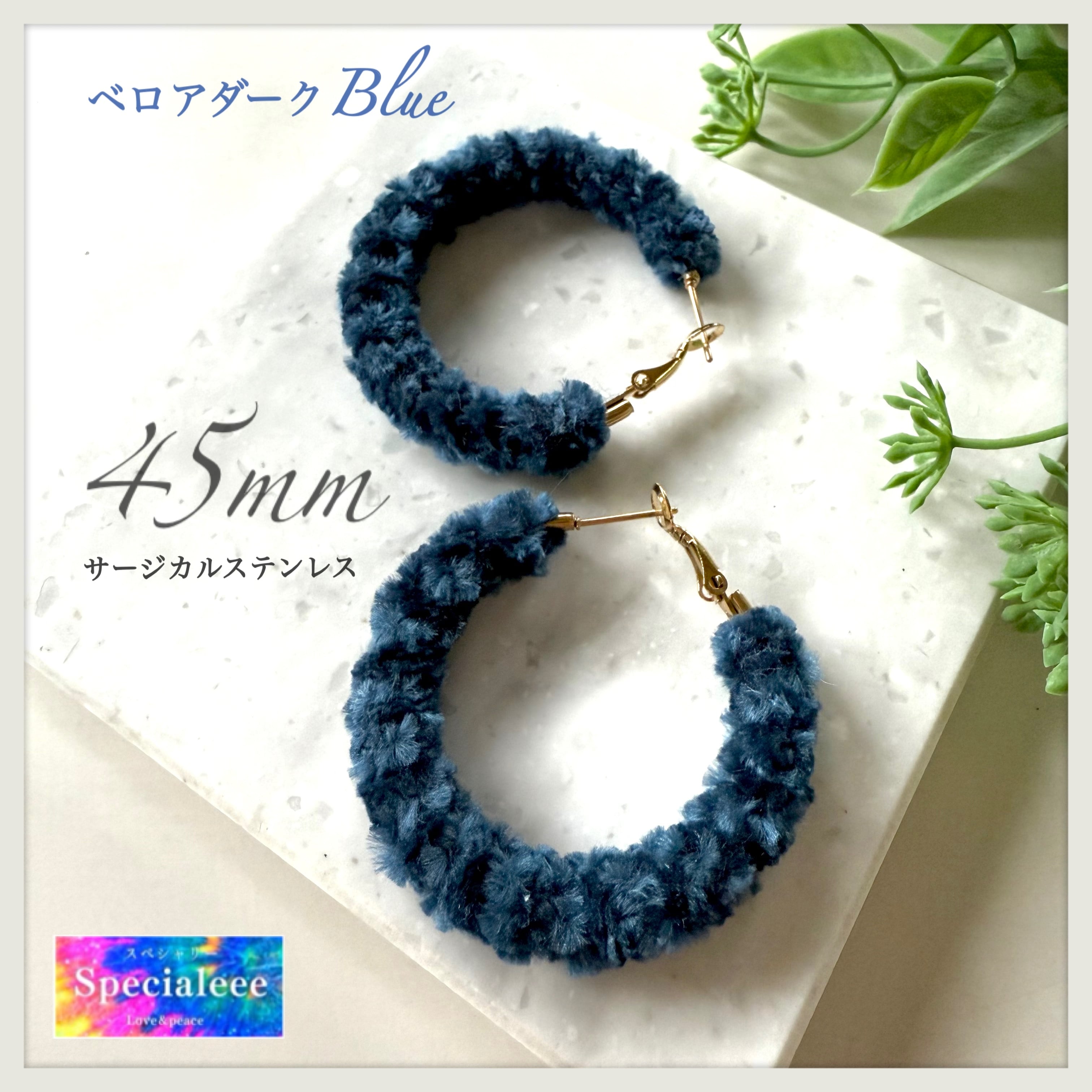 45mm★ベロアダークブルー編みフープピアス★ふわふわもこもこ★サージカルステンレス★青★秋冬お洒落すぎるカラー★数量限定★