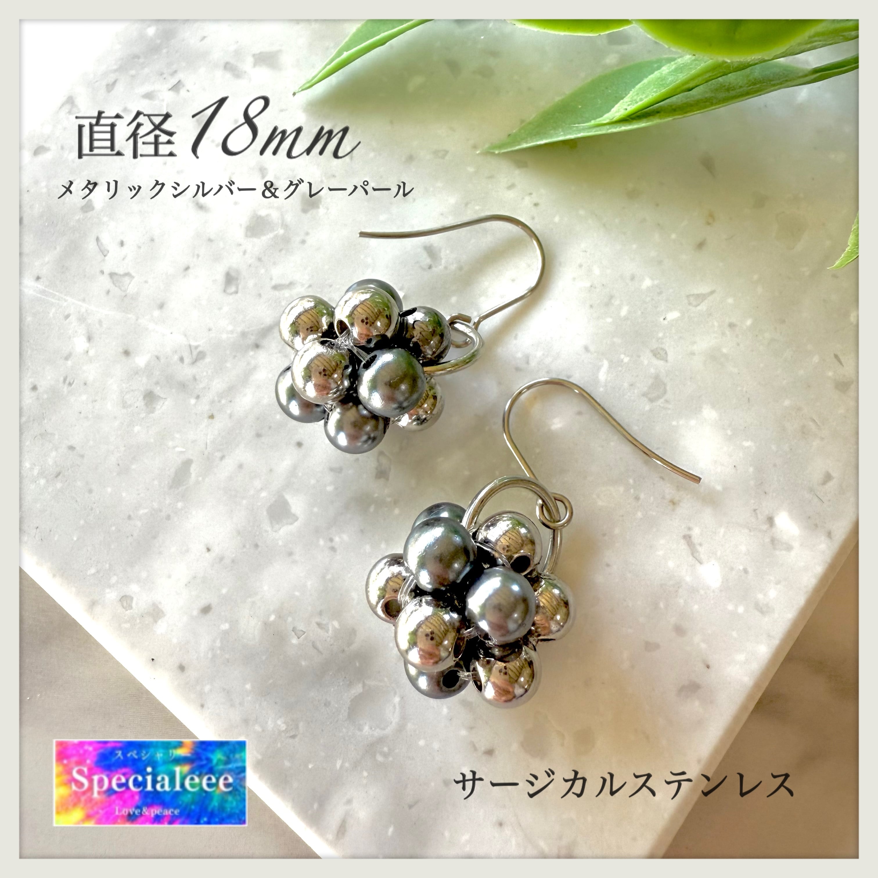 直径18mmボール★メタリックシルバー&グレーパールミックスボールピアス★錆びに強い★アレルギー対応サージカルステンレス★お洒落スタイリッシュ★オリジナルデザイン★イヤリング無料★