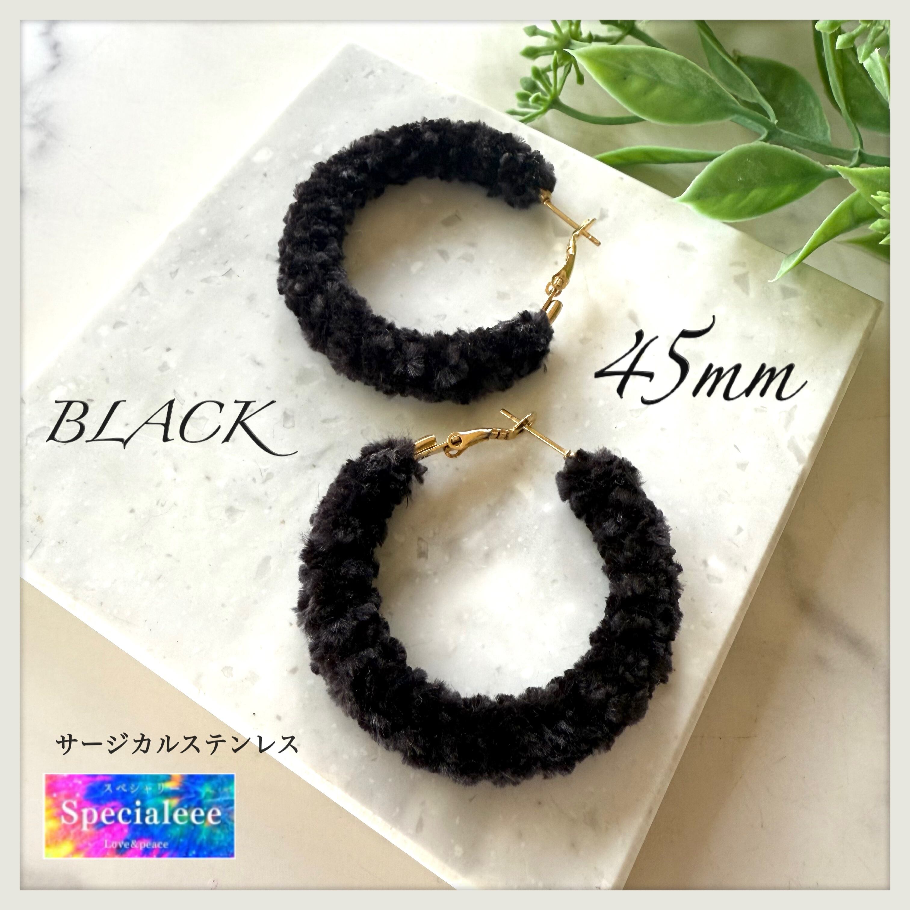 45mm★ふわふわ黒ブラックベロア編みフープピアス★BLACK★アレルギー対応サージカルステンレス★秋冬もこもこ★黒コーデ★