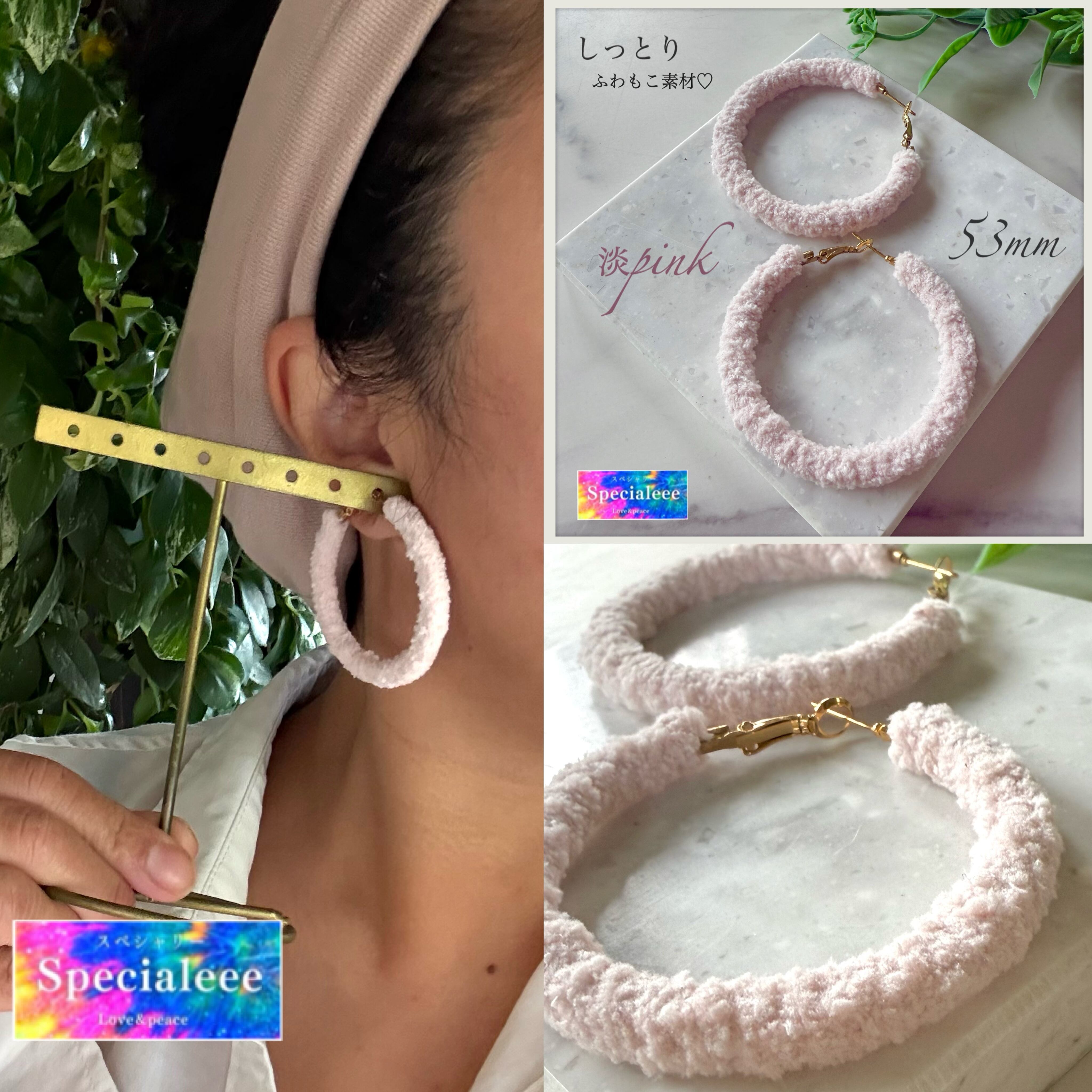 53mm★しっとりもこふわ素材★淡いピンク編みフープピアス★大ぶり★アレルギー対応サージカルステンレス★秋冬アクセサリー★可愛い★